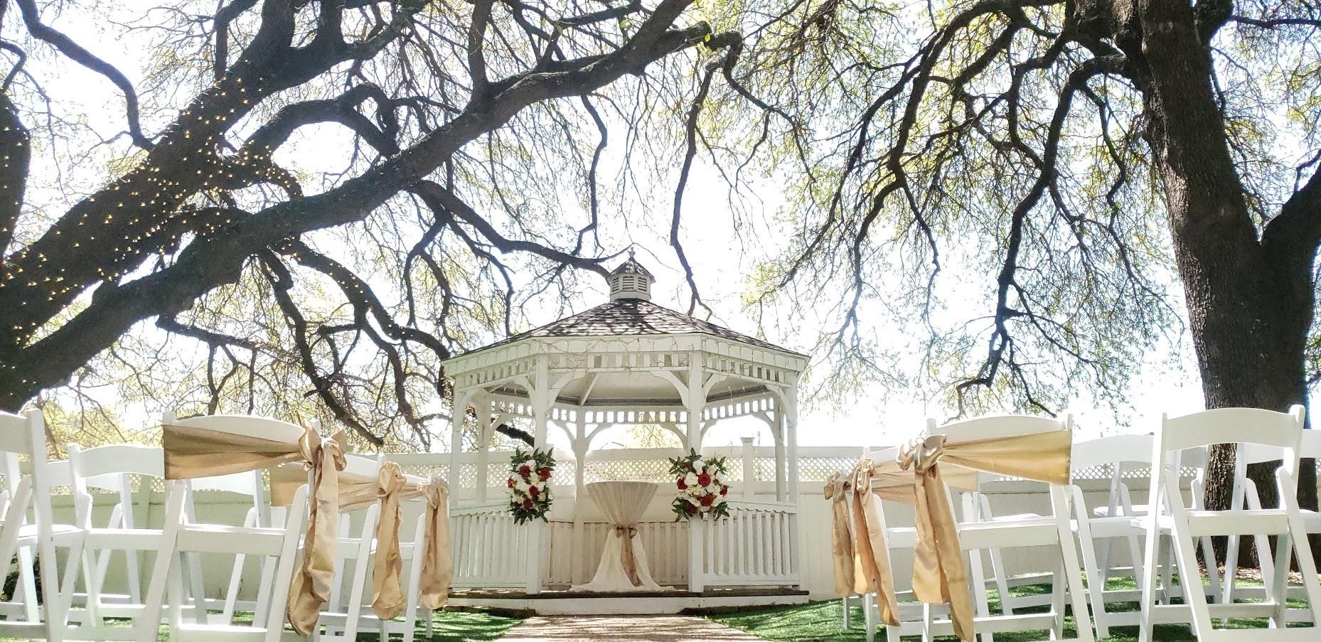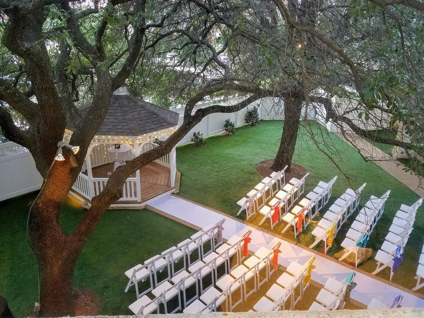The Cupid’s Garden is a beautiful, natural, park-looking, manicured setting. The garden includes two 50 years old live oak trees with a gazebo as your focal point. The tree shades cover 80% of the garden area and bring more comfort in the summer heat. You can decorate in any color as you may want to compliment our lush, green landscape to bring your memorable wedding photos to life. We have designed our outdoor facility to minimize discomfort due to changing weather conditions. After all, we are in Texas. The artificial tuff stays green and manicured all year. The grass is laid on impermeable soil for quick drainage. Consequently, you get your dream outdoor wedding, and all the beautiful images with “No mud”, “No Puddles” and “No fuss”