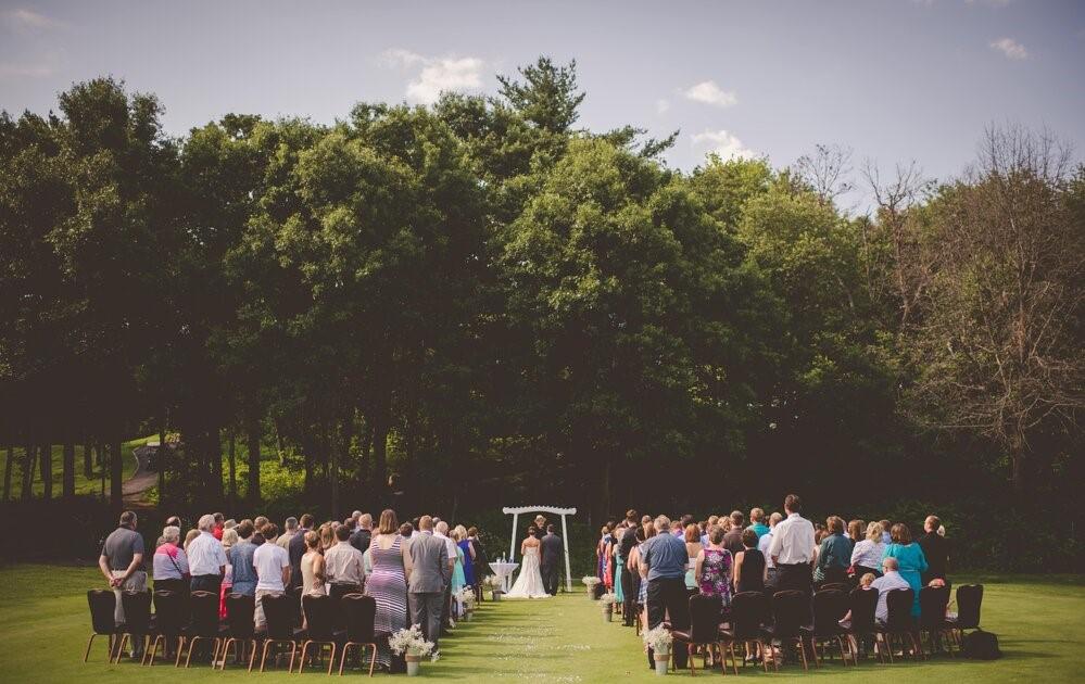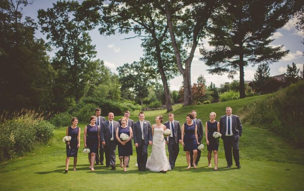 Trappers Turn Golf Club in Wisconsin Dells, Wisconsin is an elegant site to host your wedding celebration. Imagine an outdoor wedding ceremony overlooking the peaceful golf course. The tall trees, pond, water fountain, babbling brook, and manicured greens create a stunning backdrop to your special day. Exchange vows outside before moving to the covered patio for a cocktail hour.