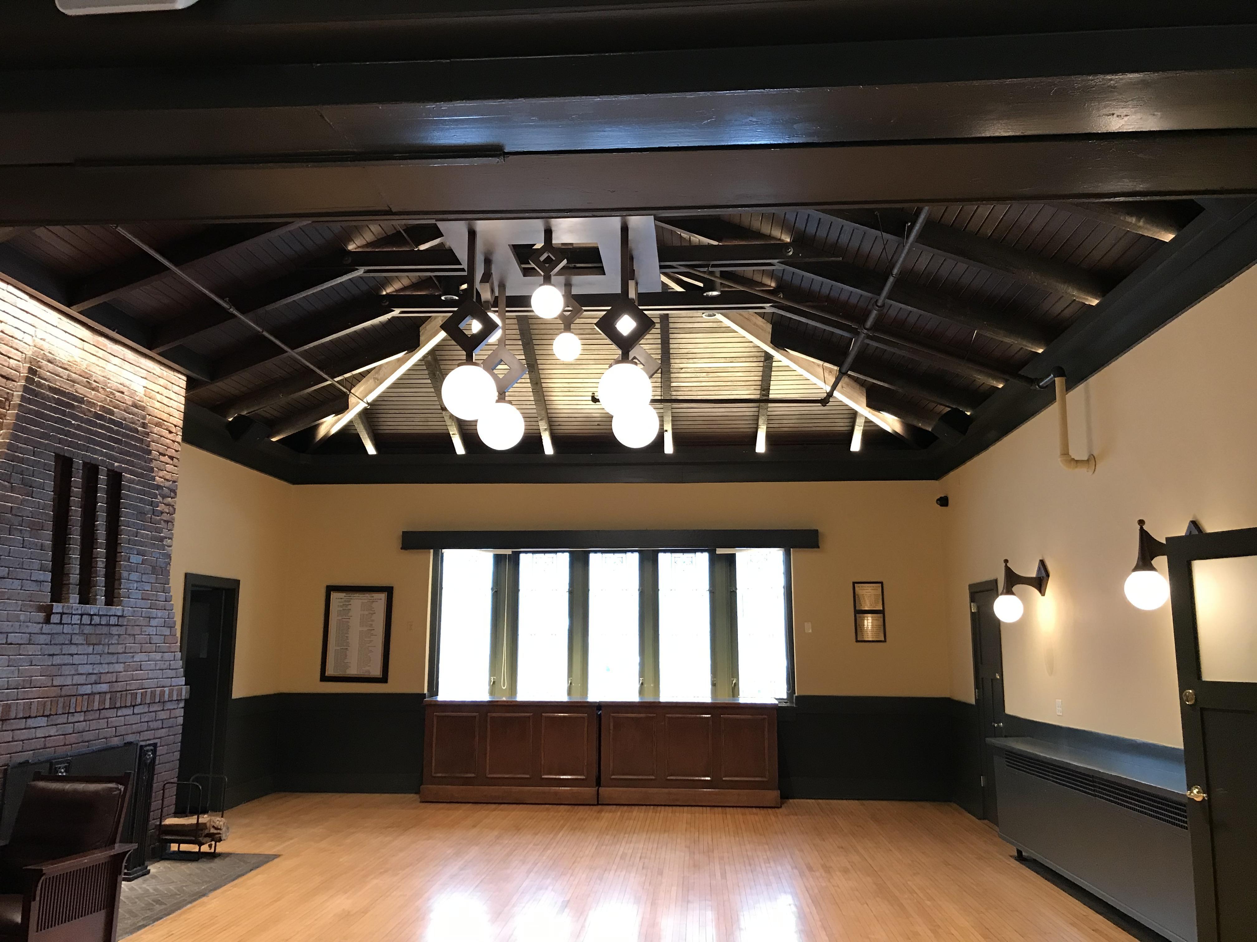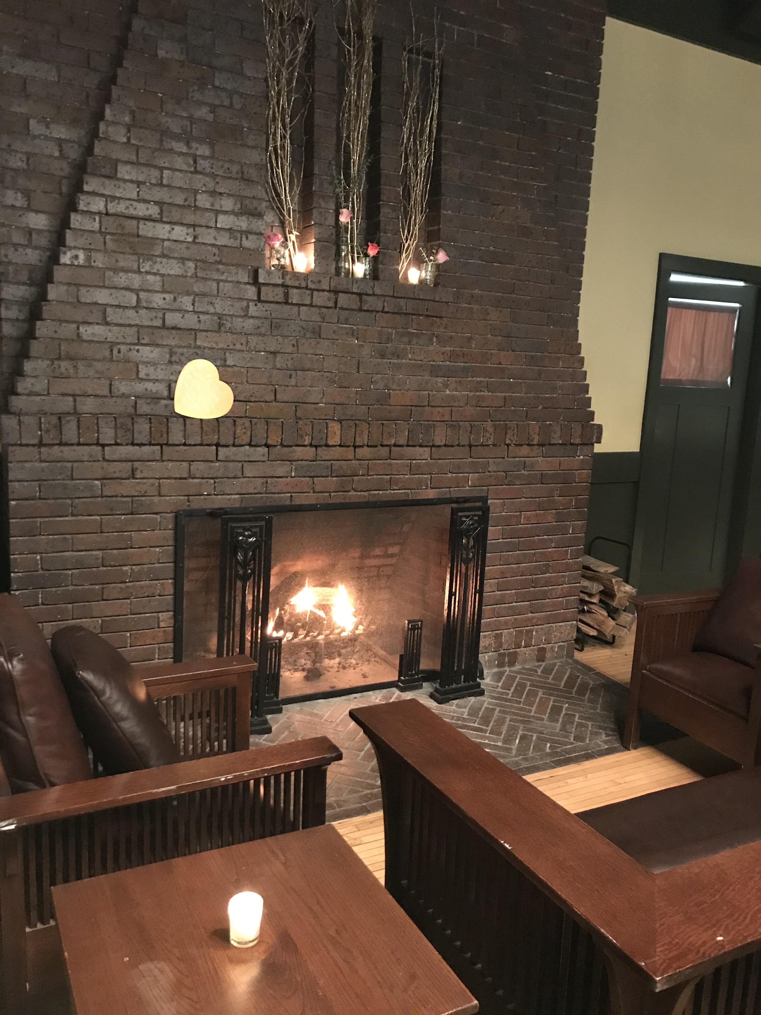 - Two moveable wooden bars - Wood-burning fireplace - Stained glass bay windows overlooking the lush West Lawn - Two arts-and-crafts style chairs, one loveseat, two end tables and two lamps