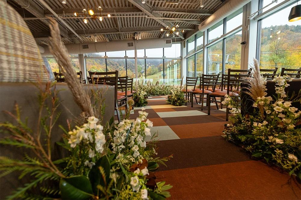 Perched at 4,100 feet atop Killington Mountain, The Peak Lodge offers a one-of-a-kind wedding setting accessible only by a scenic gondola ride. Floor-to-ceiling windows frame panoramic views of five states and three mountain ranges, providing a spectacular backdrop for both ceremonies and receptions. Inside, the lodge blends rustic elegance with modern comfort—warm wood accents, a central stone fireplace, and flexible open-concept dining and lounge areas. Outdoor patios allow guests to take in alpine sunsets or stargaze during cocktail hour. With seating for up to 300, on-site farm-to-table catering, and a dedicated planning team, The Peak Lodge delivers an intimate, elevated mountain wedding experience in all seasons.