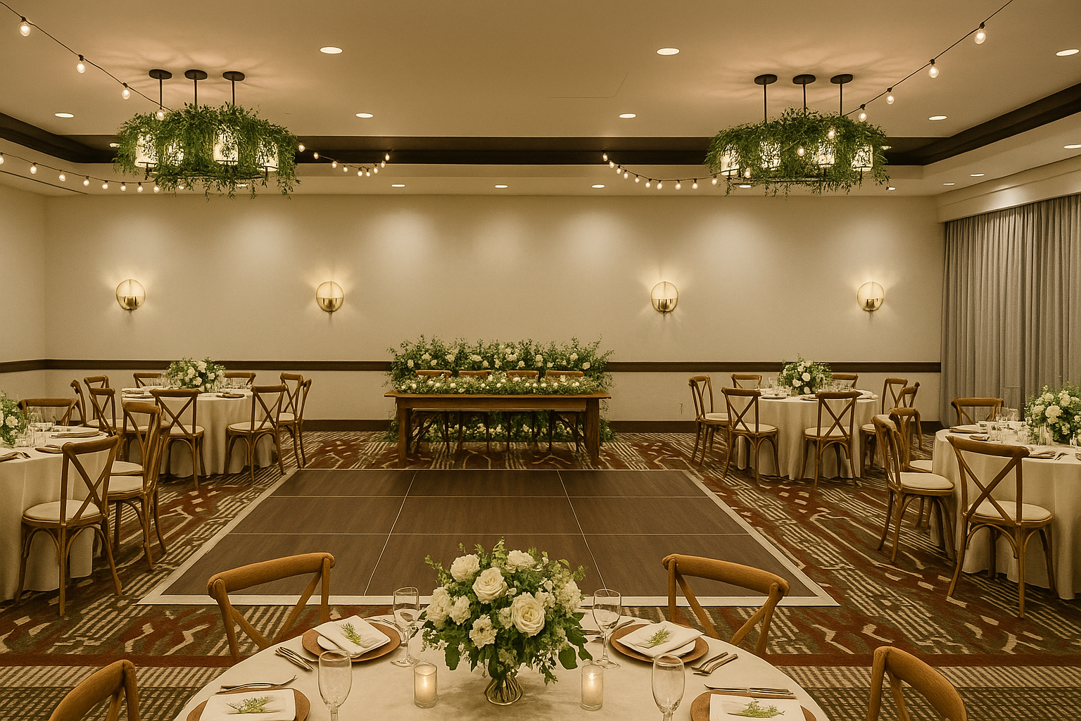 The Marina Ballroom offers a warm, Pacific Northwest, inspired setting with natural tones and soft lighting, perfect for elegant celebrations. This versatile space features a connected pre-function area, ideal for cocktail hours or buffet setup. Included are wood crossback chairs, tables, linens, and a gorgeous wood dance floor, providing a seamless and stylish foundation for weddings, galas, or gatherings along the beautiful riverfront. This space has undergone a refresh in 2025.