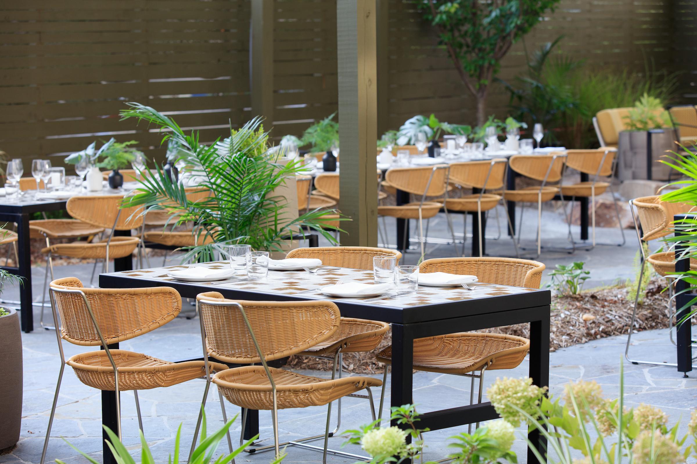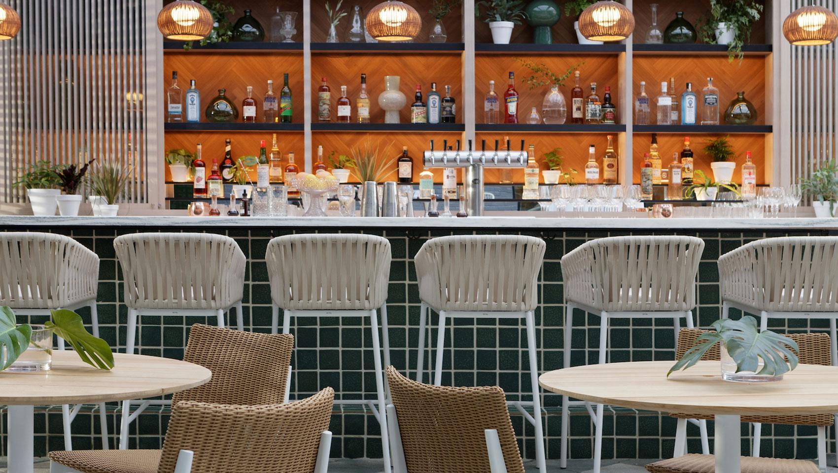 A serene garden escape with a stylish bar and inviting lounge spaces.