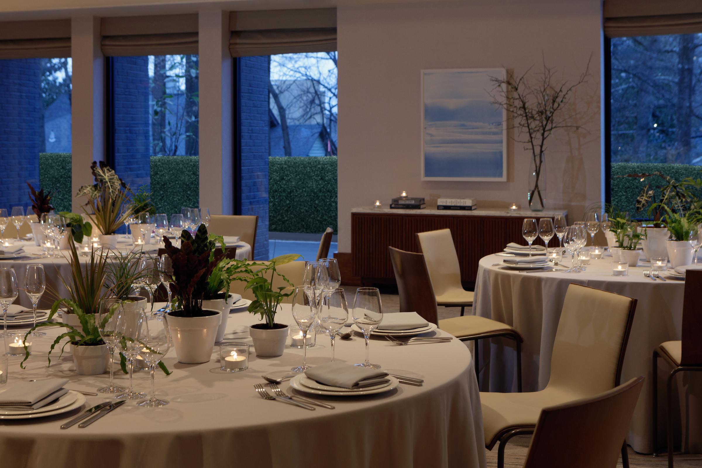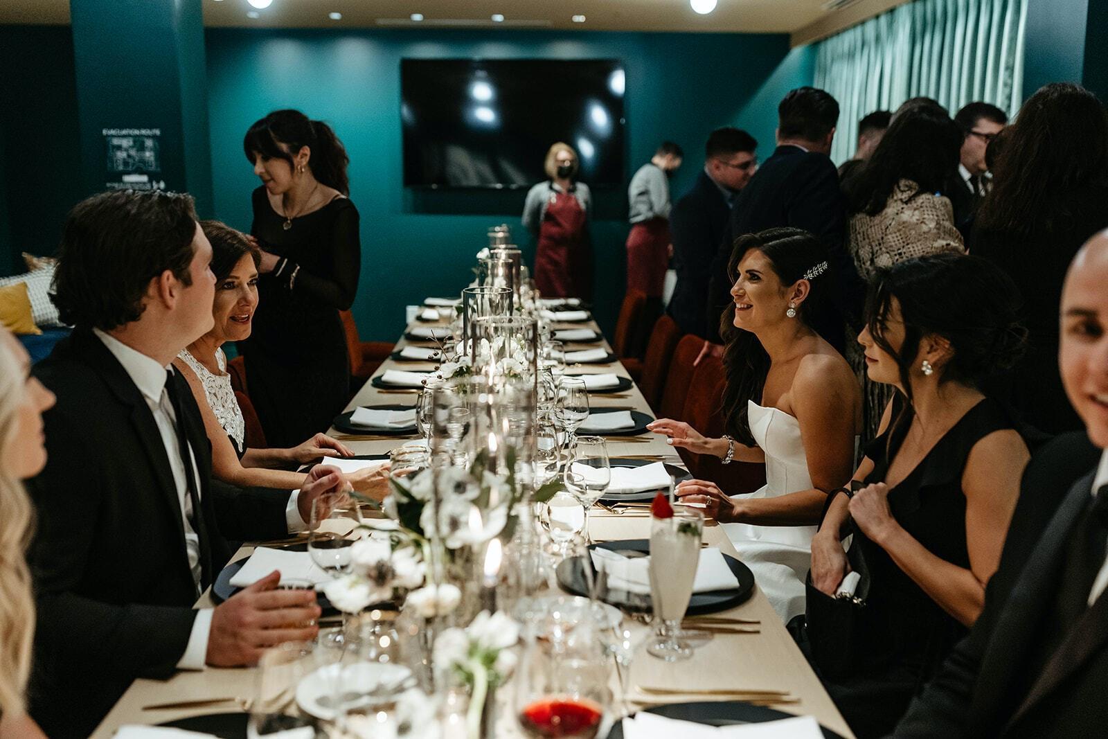 An intimate, moody space with a boardroom-style table for up to 20 guests. This space is ideal for micro-wedding receptions or small, cozy social gatherings.