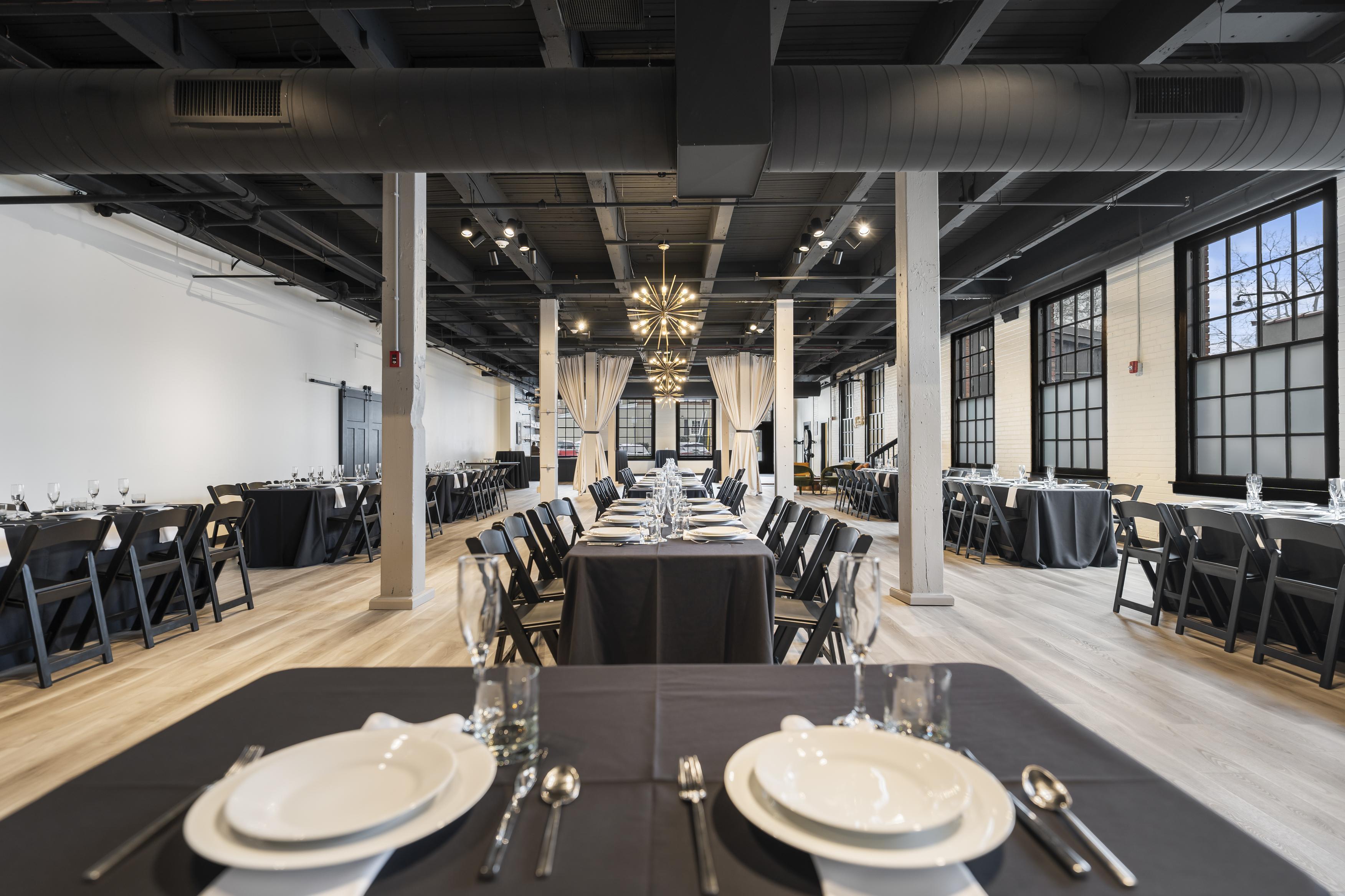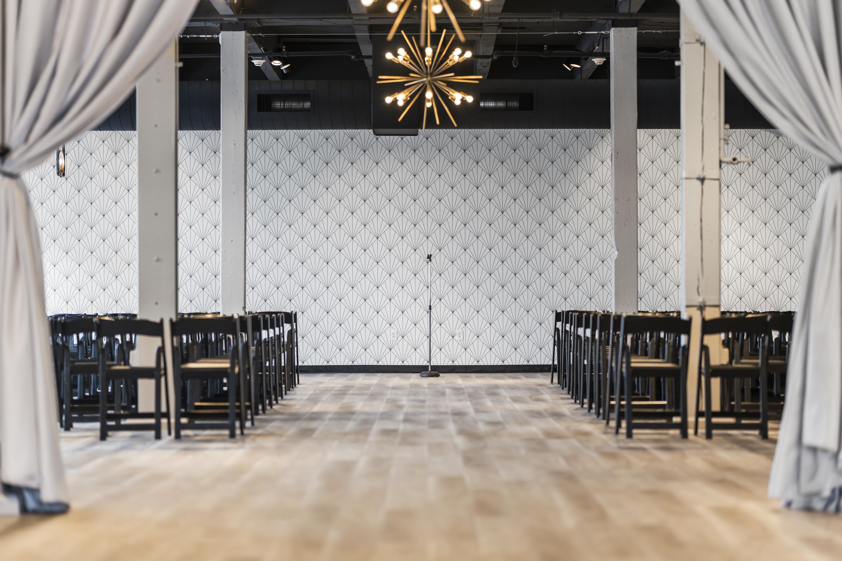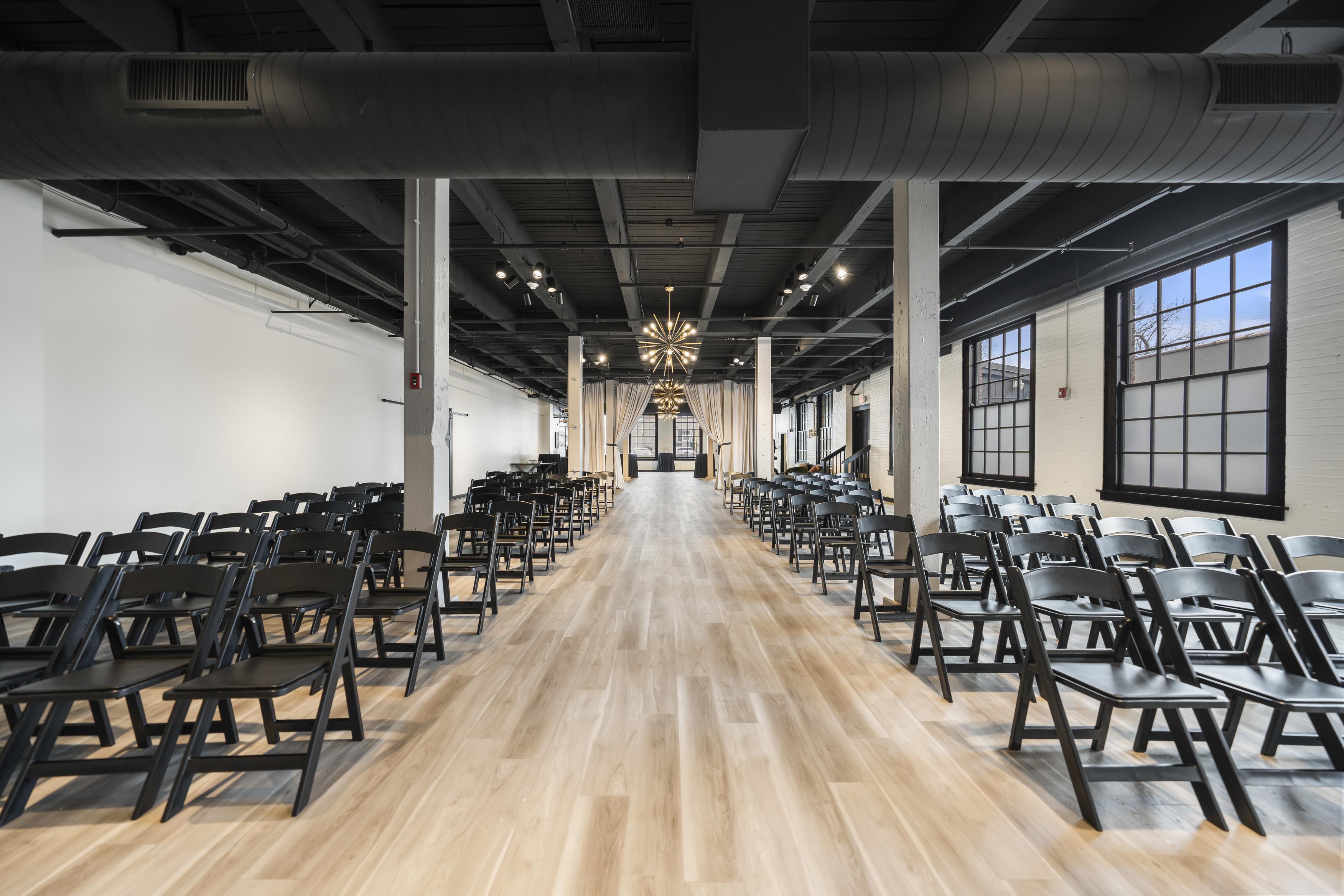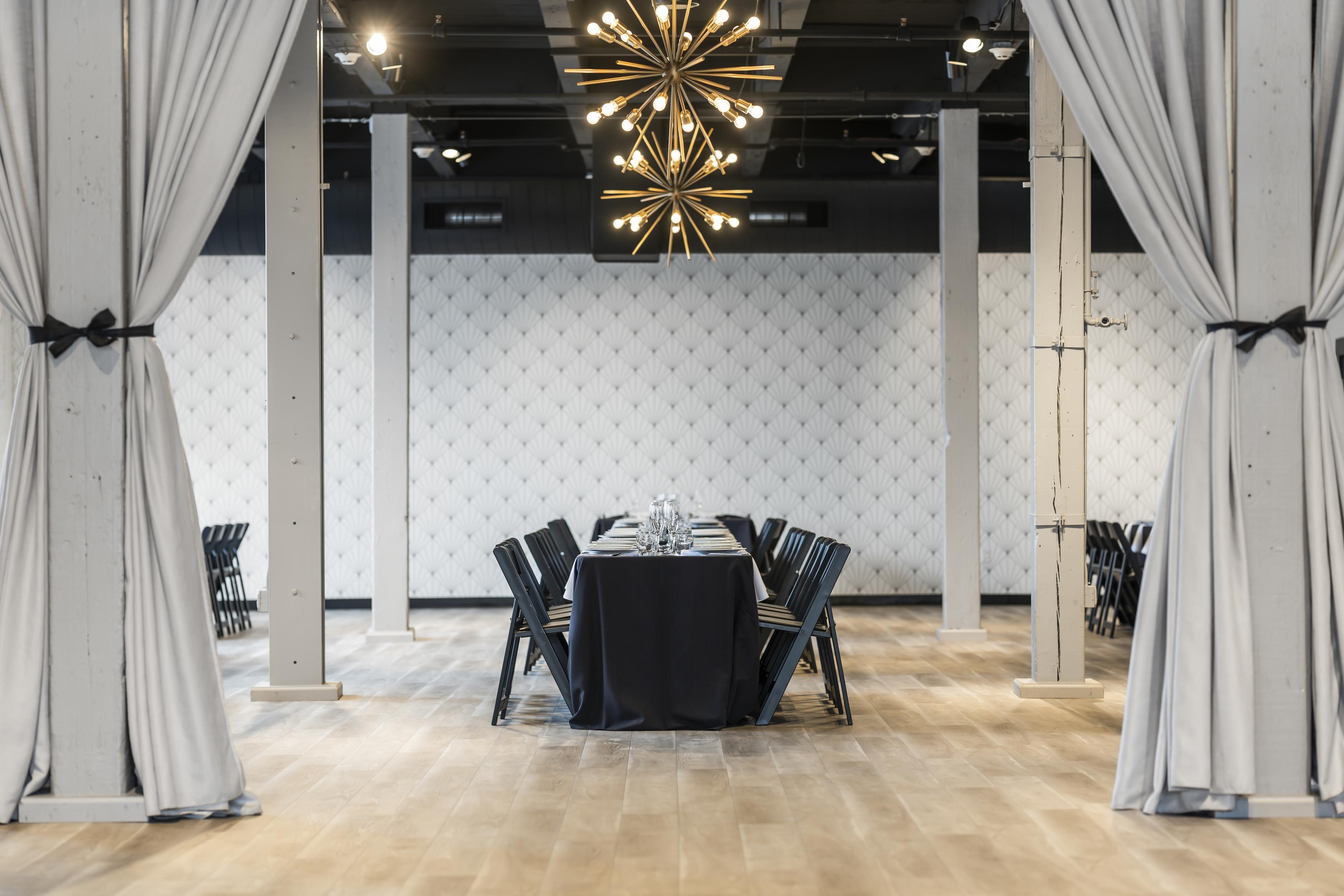 - Tables and chairs, - Table linens - Bar packages and staff - 3 mid century chandeliers - Access to a caterers kitchen - On-site wedding suite