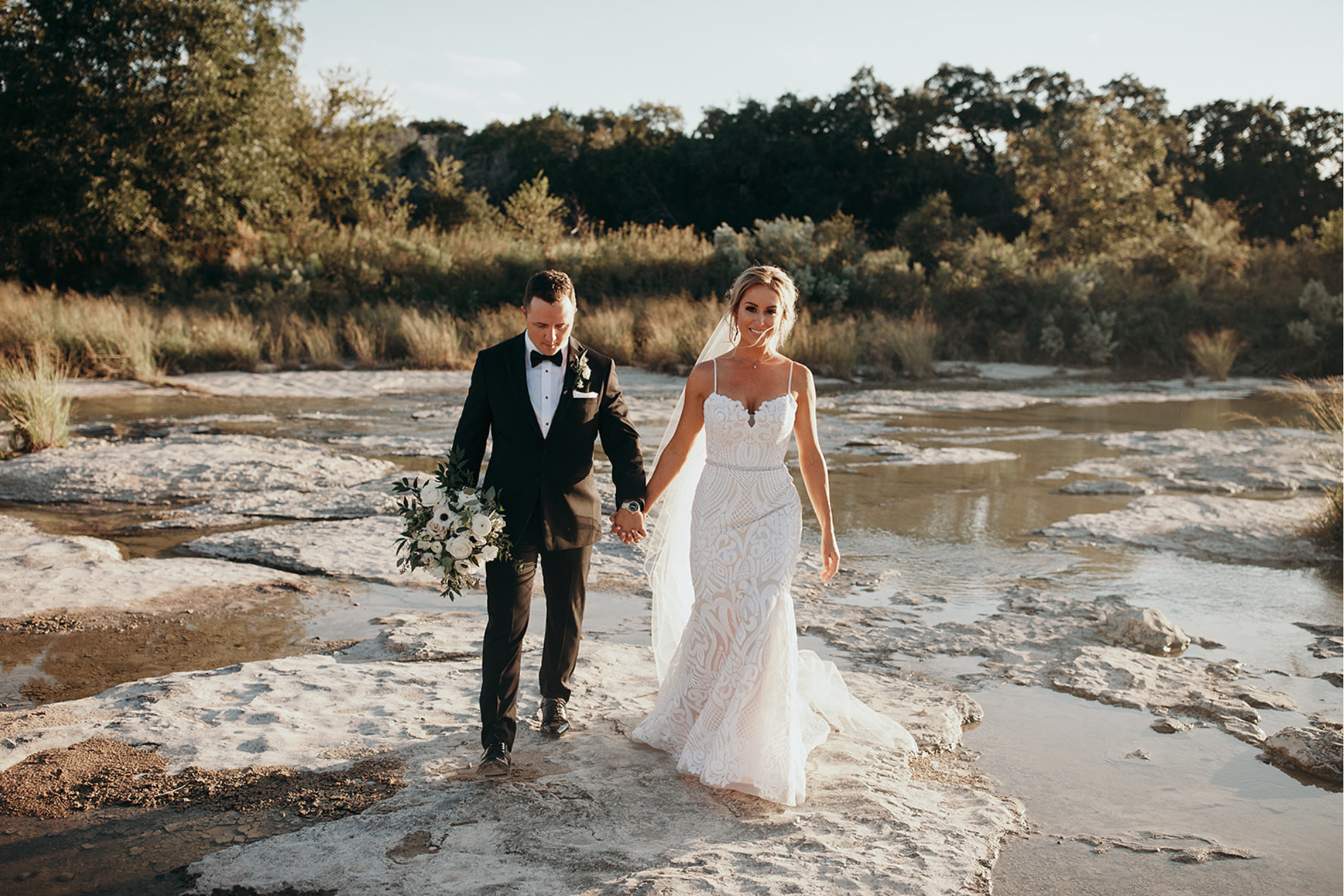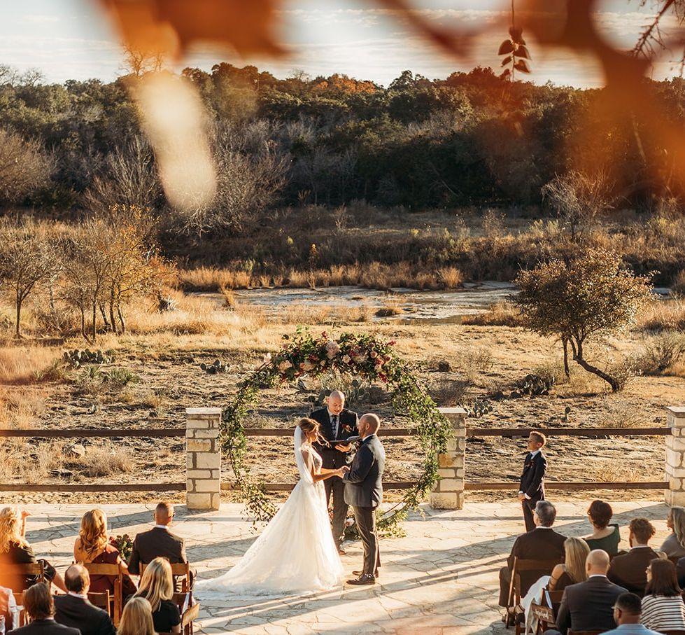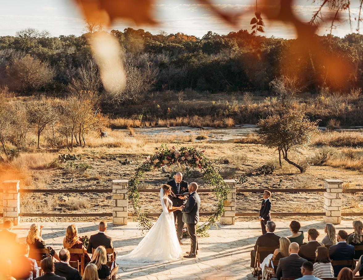 The beguiling beauty of the black rocky riverbanks of the Pedernales reflecting sparkling Hill Country sunsets is an unparalleled backdrop for I do's