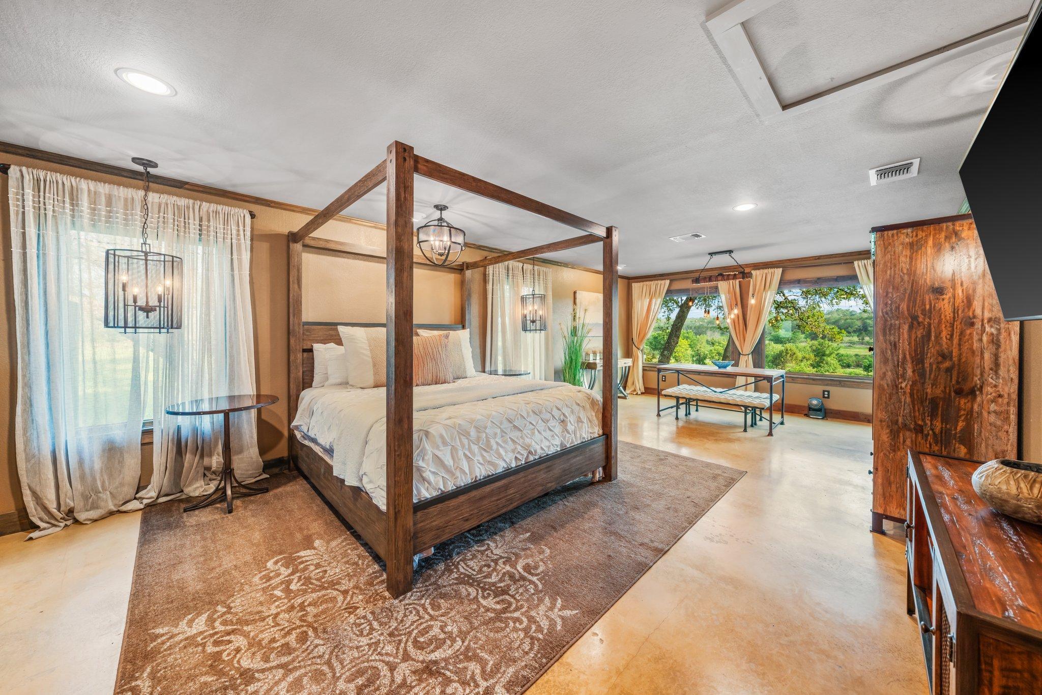 Panoramic views of the Pedernales River await you every morning in this heavenly Suite. Professionally and tastefully designed to evoke warmth and substance, you will more often than not awaken to the sights of a family of deer carefully crossing the bubbling river or a bald eagle scanning the riverside or a Sandhill crane coming in for a soft landing into misty waters, all without leaving bed. It is a Hill Country experience not to be missed.