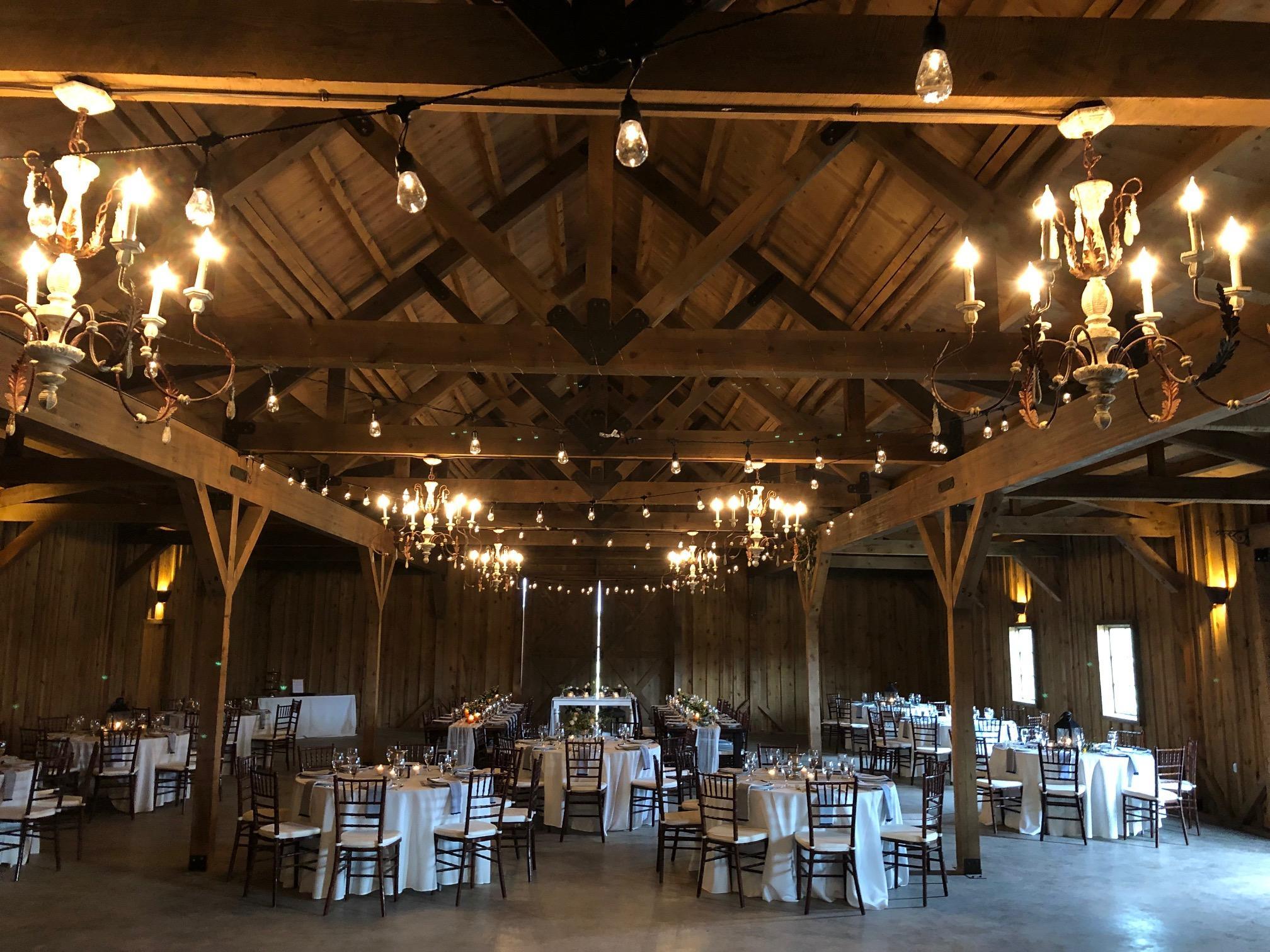 - Lighting on Dimmers - Electrical system capable of handling large bands - 60" round banquet tables, 30" cocktail tables, 8'x40" farm dining tables, 5' farm bar-height tables, fruitwood chivari dining chairs, 6' and 8' foldable catering tables - Commercial A/C and heating system - Catering Area (indoor/outdoor) - ADA compliant men's and women's restrooms - Vendor Parking - Barn-wood Bar (movable)