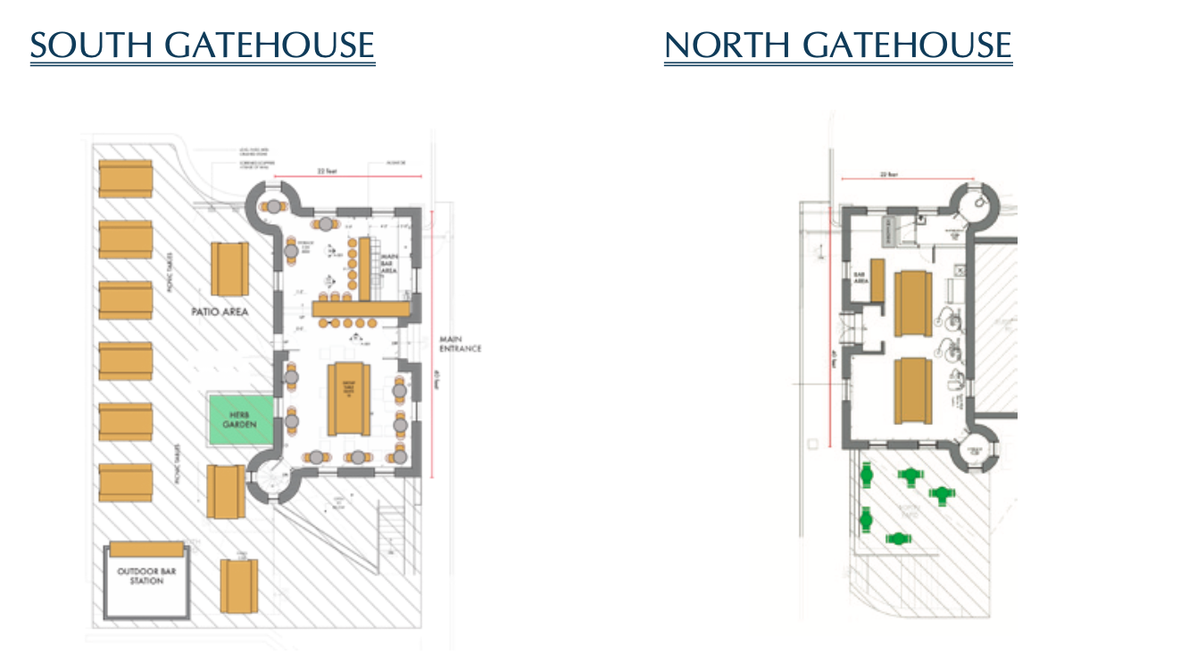 The South Gatehouse serves as our main tasting room and cocktail bar. This carefully curated room is suited for larger functions like wedding receptions, product launches, and corporate events. In addition to the beautiful interior of our tasting room, the South Gatehouse boasts a sizeable outdoor patio complete with an outdoor bar for the warmer seasons. This space can accommodate 90 for a seated dinner and up to 130 for a standing cocktail reception.