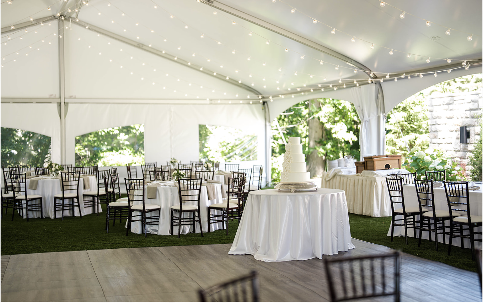 Kinsale is located in Powell, Ohio and our outdoor tented space is perfect for your wedding reception. We are able to accommodate up to 200 guests, include the dance floor and have a beautiful location for an outdoor ceremony. The tent comes with the tables, chairs, flatware and glassware for the event and our standard ivory linens.