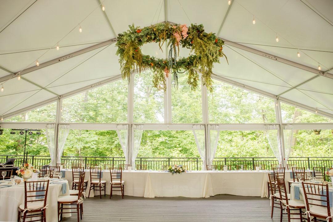 The Groesbeck Estate offers scenic woodland views from Tritsch Terrace, a courtyard surrounded by colorful native plants in the Haile Pillar Garden, a private second-floor event suite, and indoor accommodations. Krippendorf Lodge, originally built in 1900, offers an expansive stone terrace—protected from the elements by a custom-designed awning, spring through autumn. The venue's covered porch wraps around three sides of the home and offers beautiful views of the surrounding forest and additional space for event or seating options. The event suite on the second floor offers a private space for the wedding party to get ready and relax.