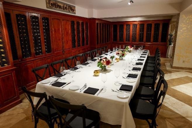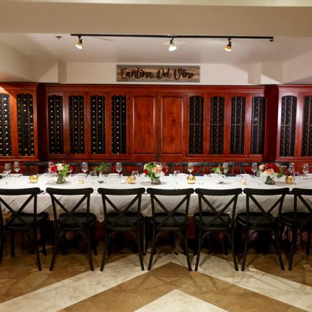 The Wine Cellar is a semi-private space & the first room upon entering the basement level. There are travertine stone floors, dark cherry wood wine cabinets and a unique gold leafed accent wall. This intimate setting is ideal for groups of 10 to 60 guests.