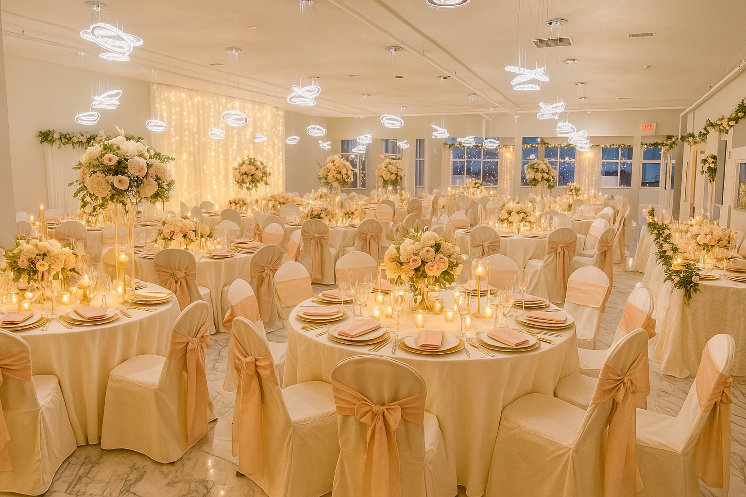 Open layout concept with white marble floors and overhead lighting. With the use of the bar area located in the same building, The Main Room is the ideal space for both your ceremony and reception.