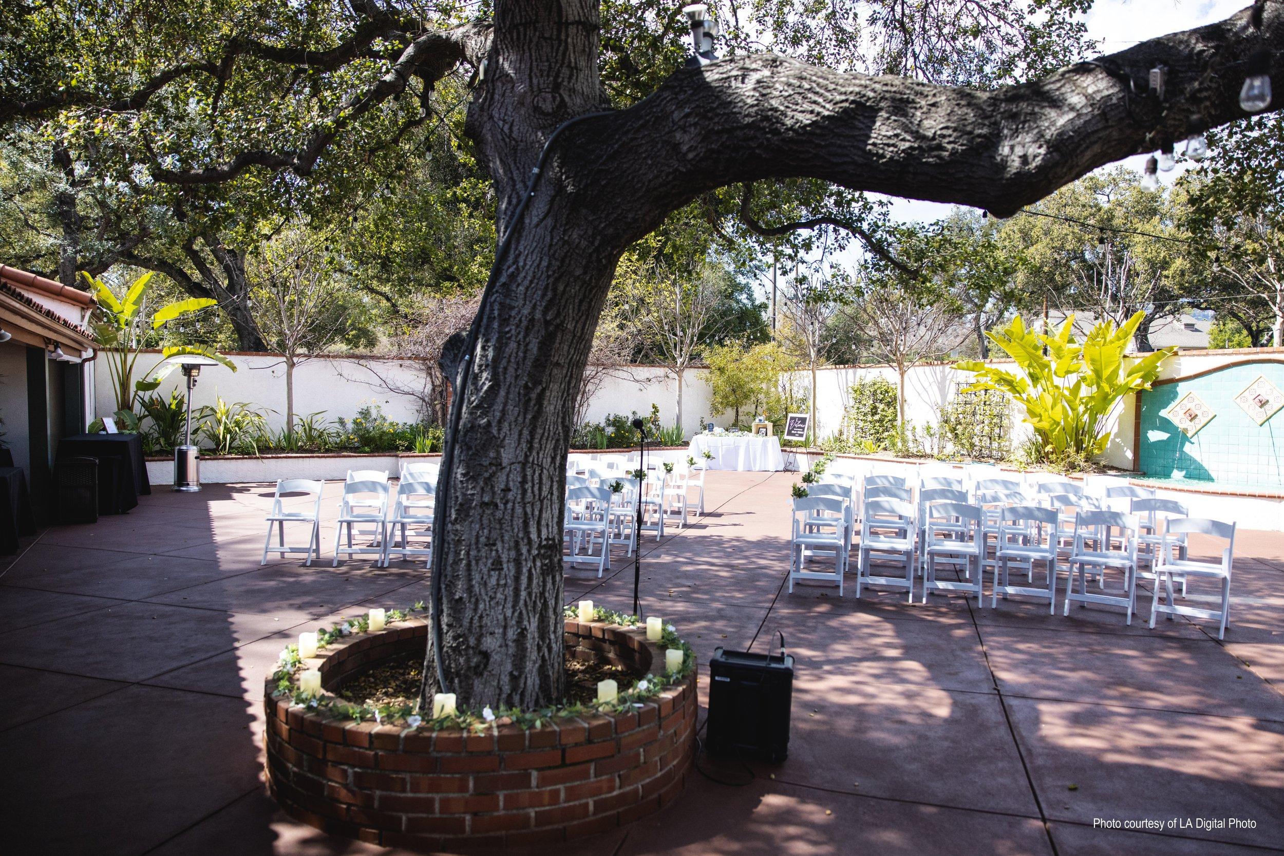 The La Cañada Thursday Club is a beautiful, historic gem of a property located in the heart of La Cañada Flintridge. Built in 1926, our facility has been the setting for hundreds of wedding celebrations, birthday and anniversary parties, celebration of life events, corporate events, and more. The clubhouse includes a ballroom with an elevated stage, tea room, bridal suite, and kitchen. The outdoor courtyard is a private walled area with arched wrought iron gates, large fountain, majestic oak tree, and mature garden. Our venue accommodates up to 130 guests and has a private, spacious parking lot.