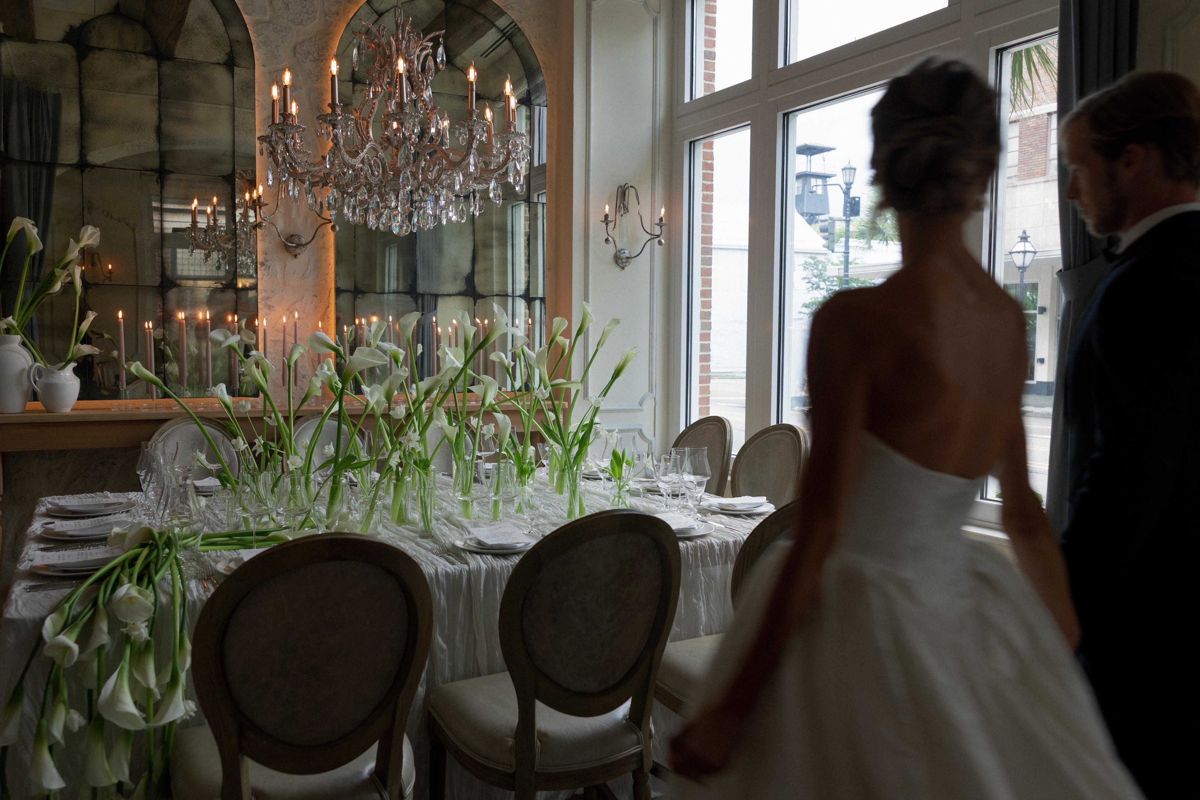 Separated by intricate archways, the salon privé features a large, custom wooden farm table seating up to 14 guests and a matching credenza. Arched antique mirrors and an oversized crystal chandelier complement the large street facing windows that overlook historic King Street.
