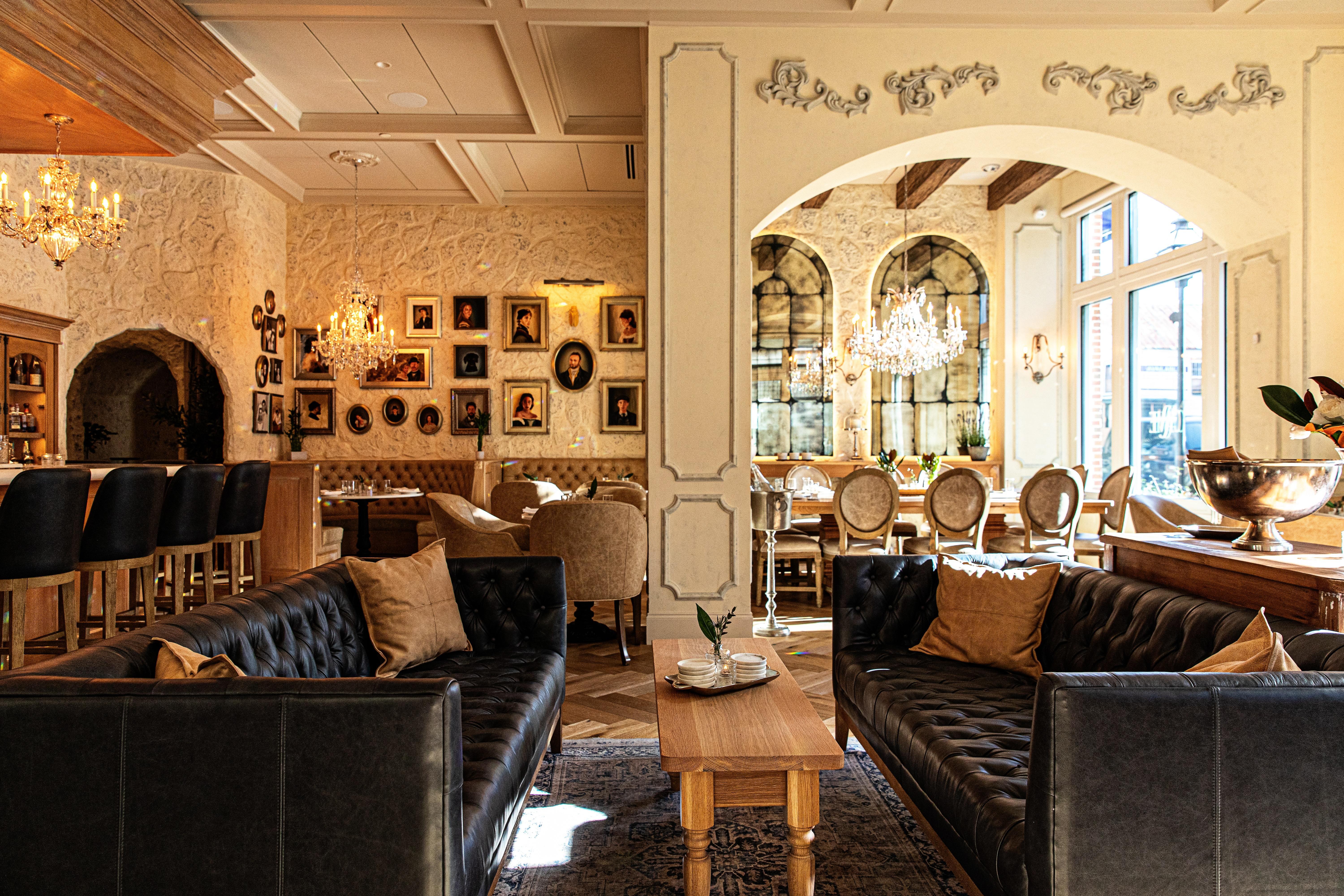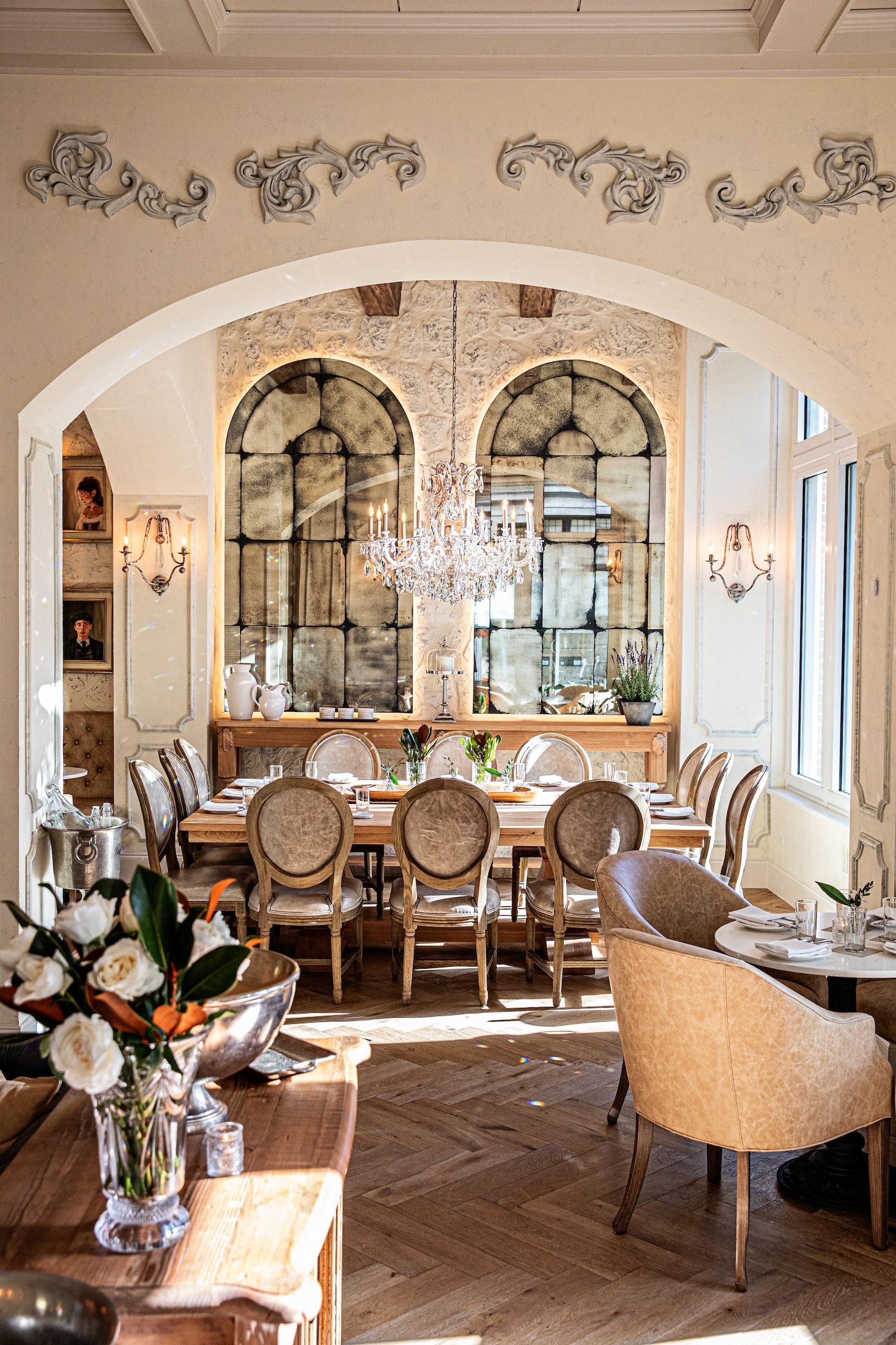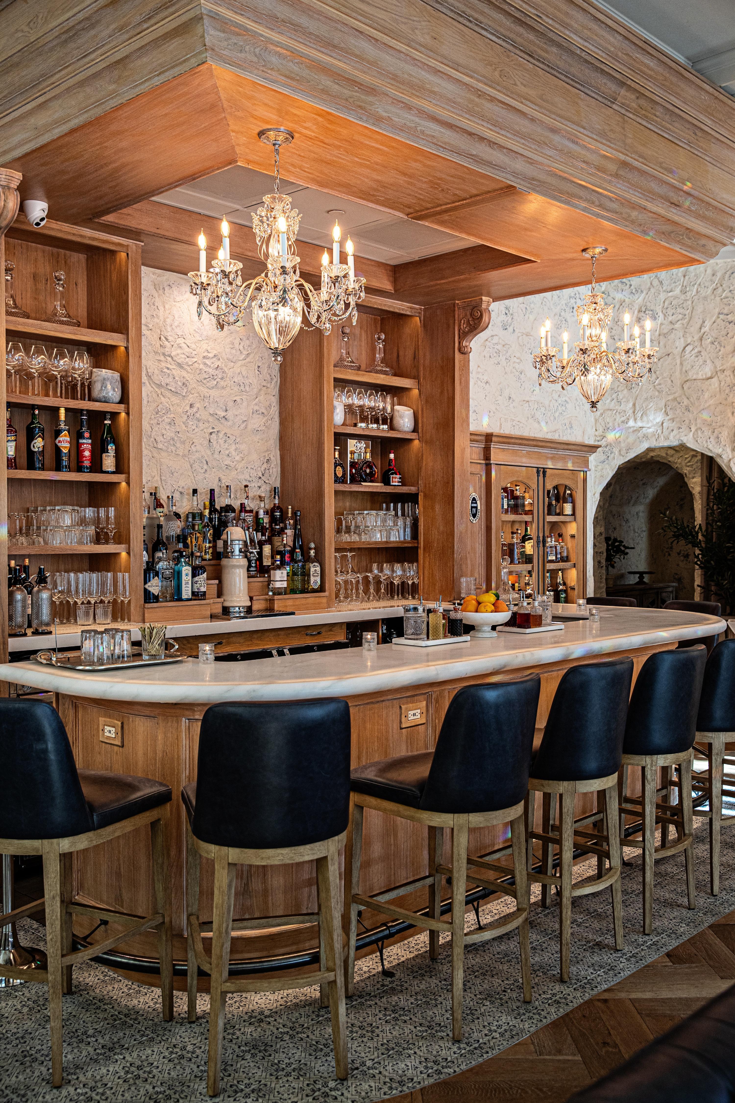 La Cave, which translates to “the cellar”, transports guests to the south of France, where elegant Provençal style is on full display. With large, street facing windows, light pours into the intimate dining room and bar, where natural wood finishes, exposed stone walls, and crystal chandeliers create a sophisticated setting. Reclaimed wooden beams and custom coffered tiles traverse the ceiling, while light blonde wood floors are laid in a herringbone parquet as a nod to old European charm.