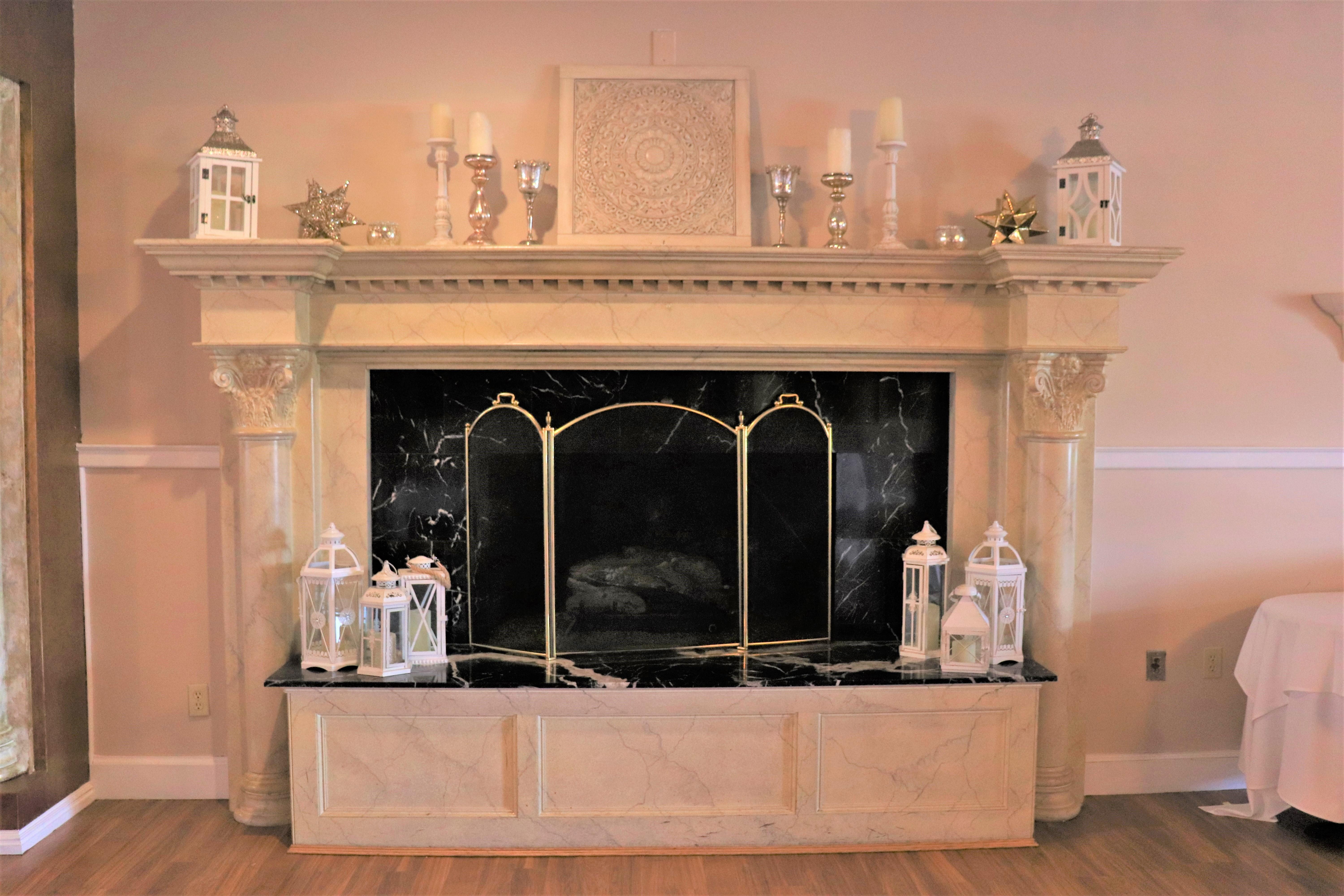 This room has a beautiful fireplace setting accented with burgundy and white.
