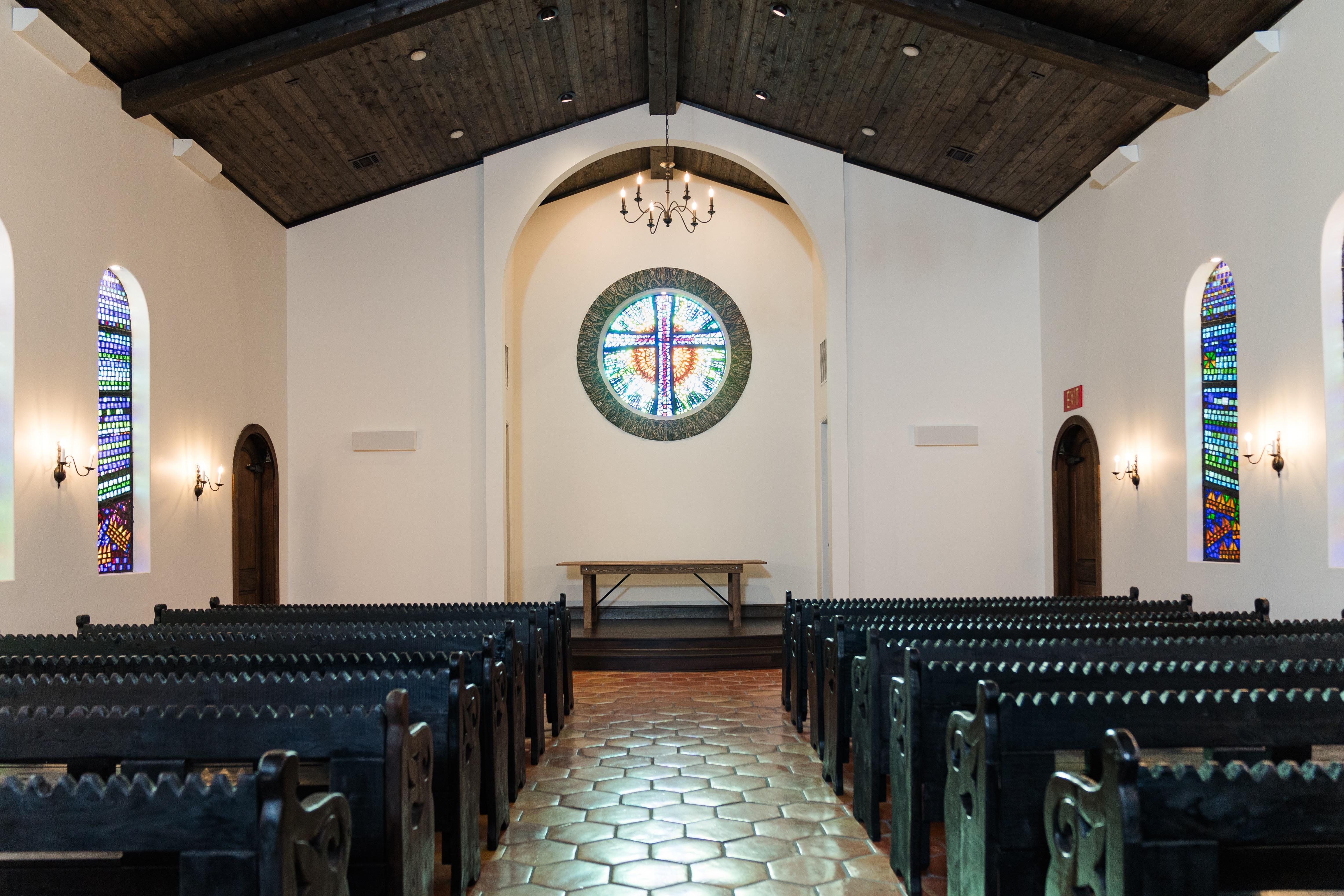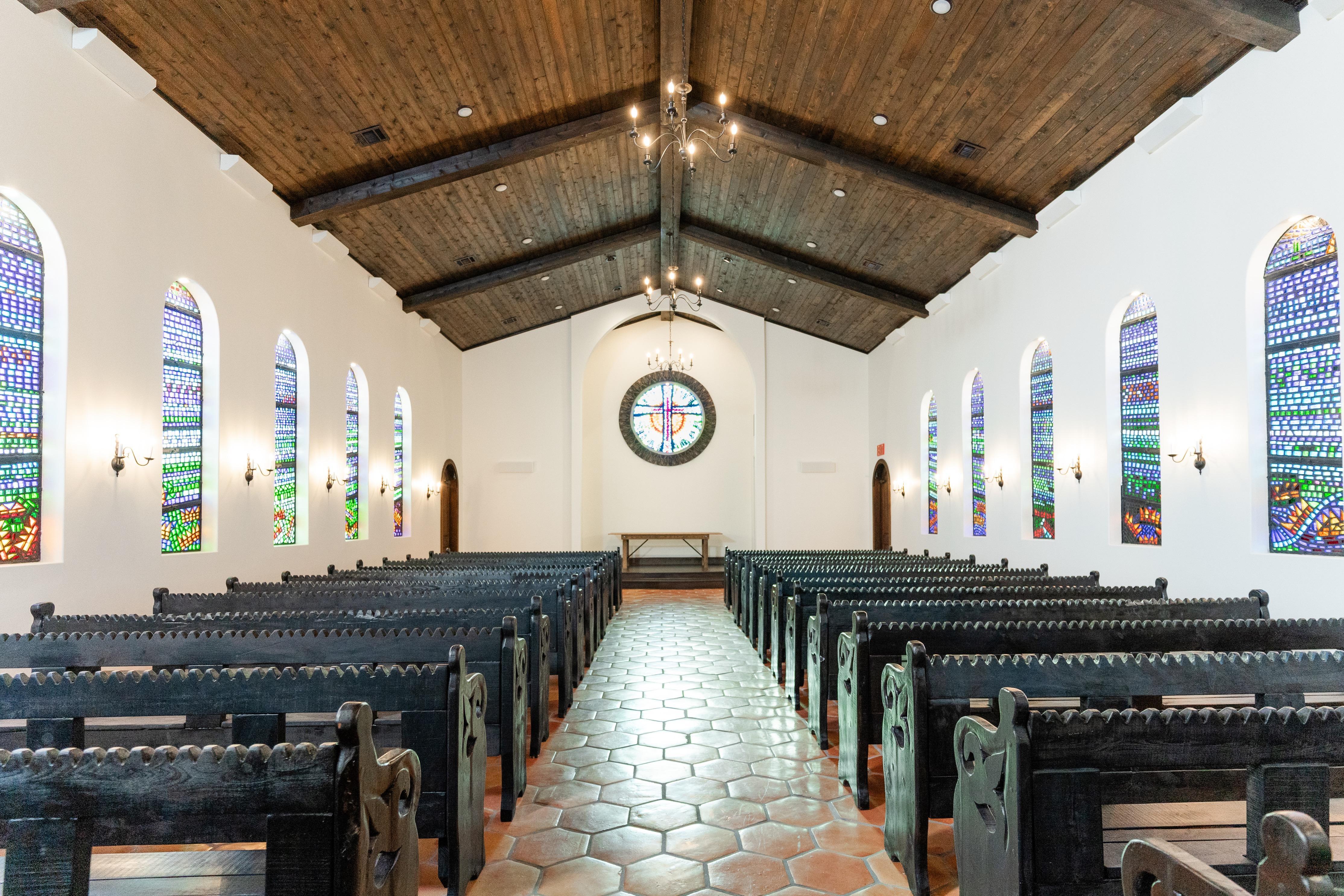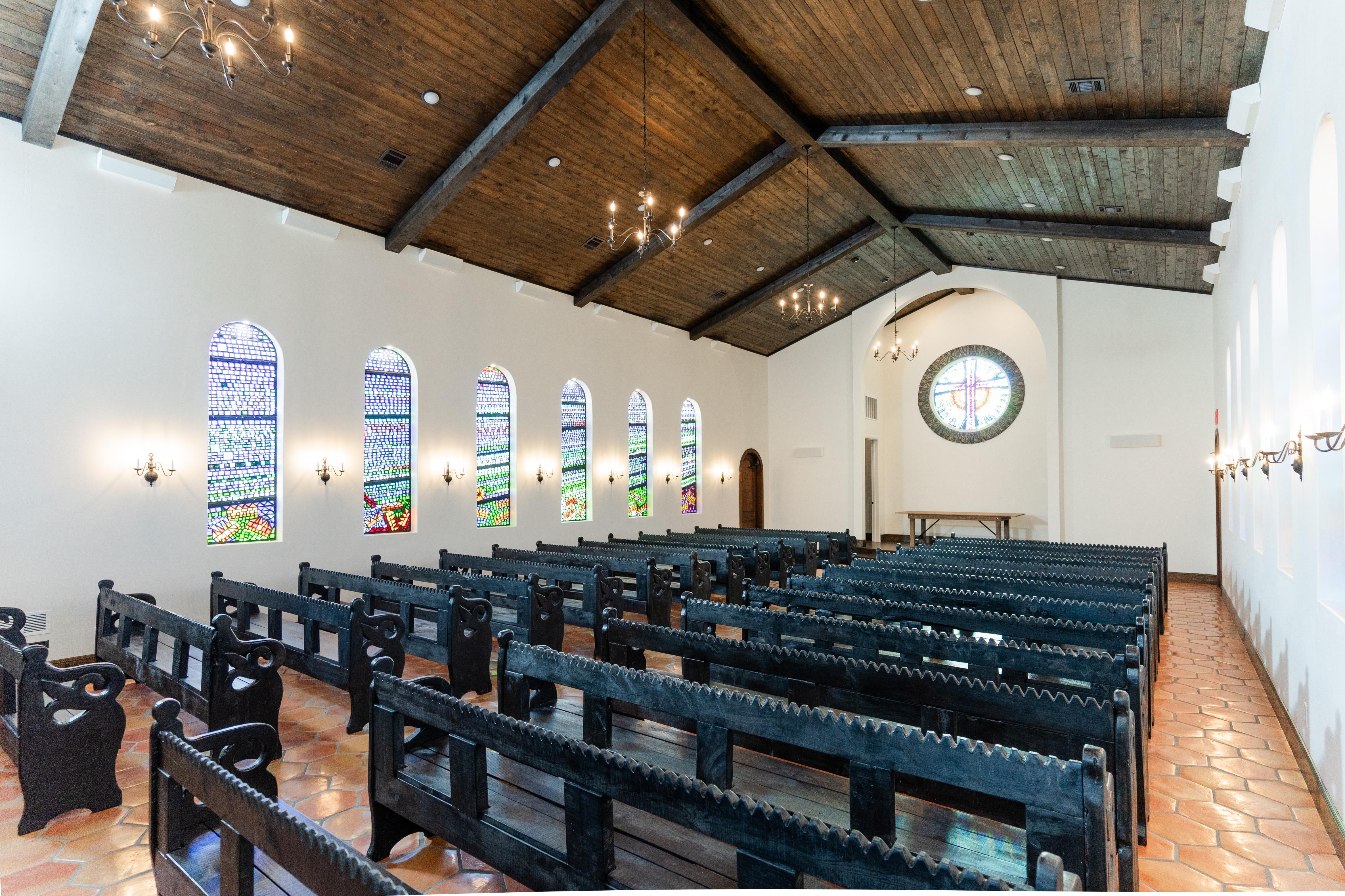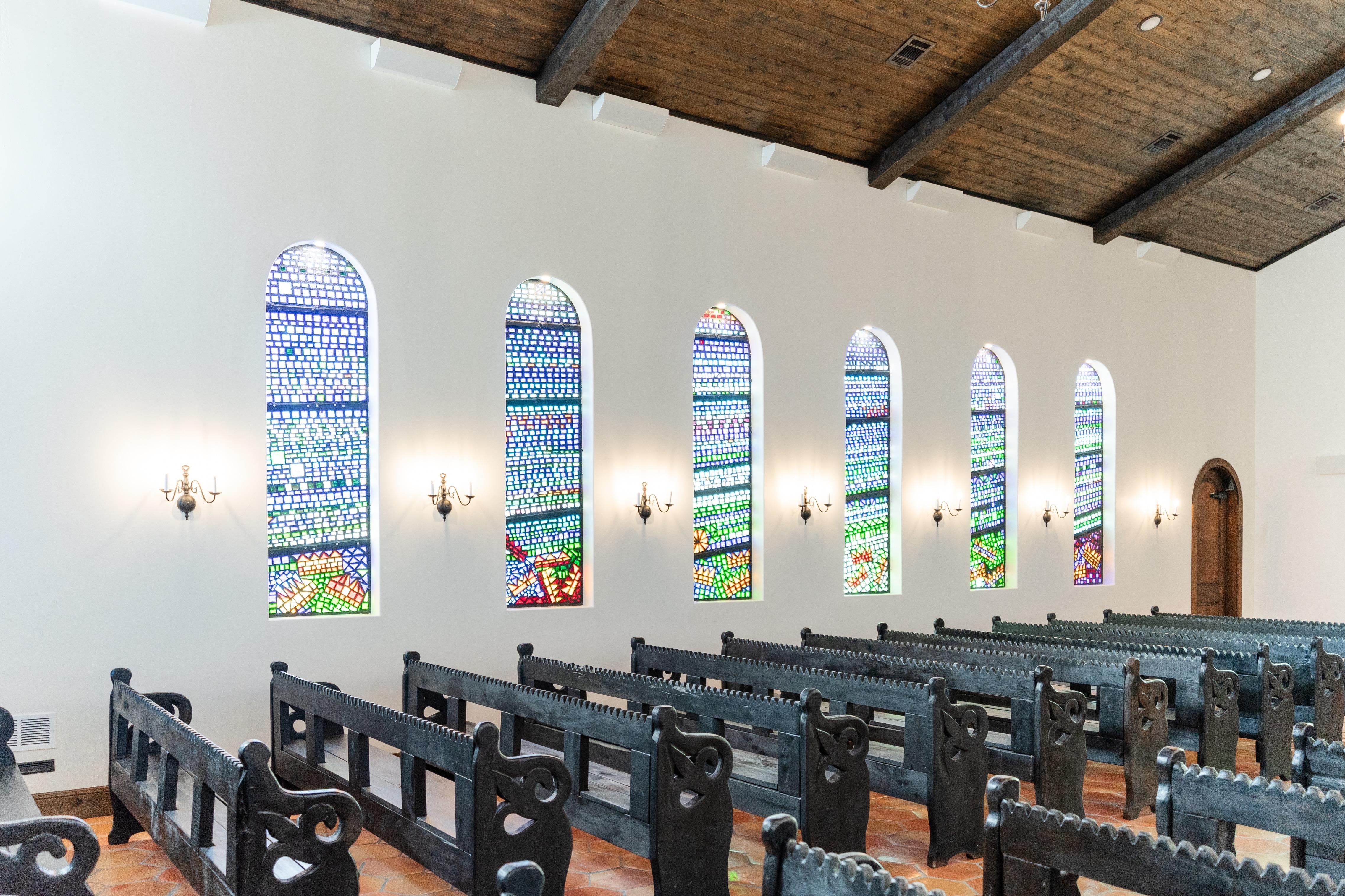 Beautifully handcrafted pews and dalle de verre glass speaks for itself. Casa del Rey is timeless and breathtaking.