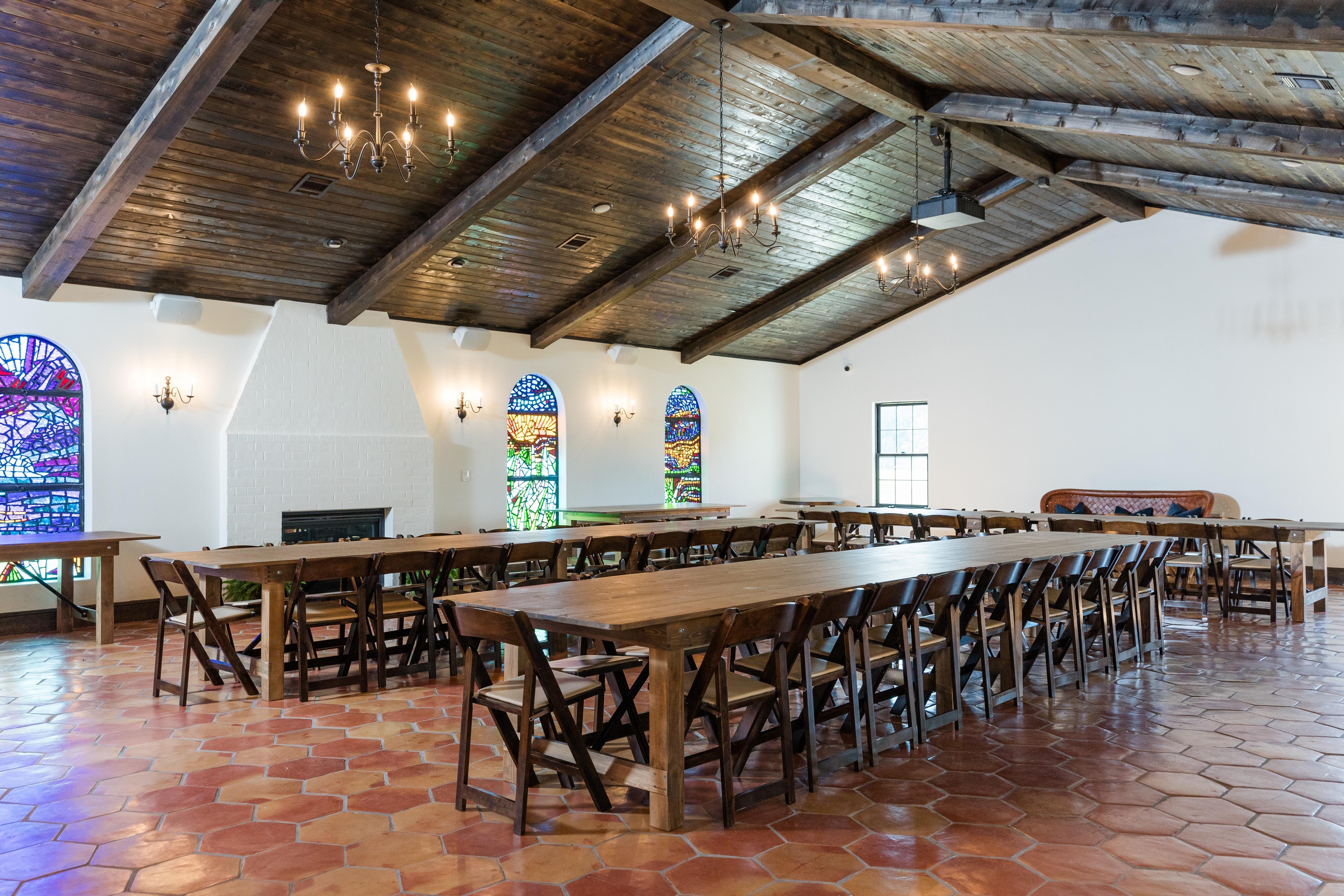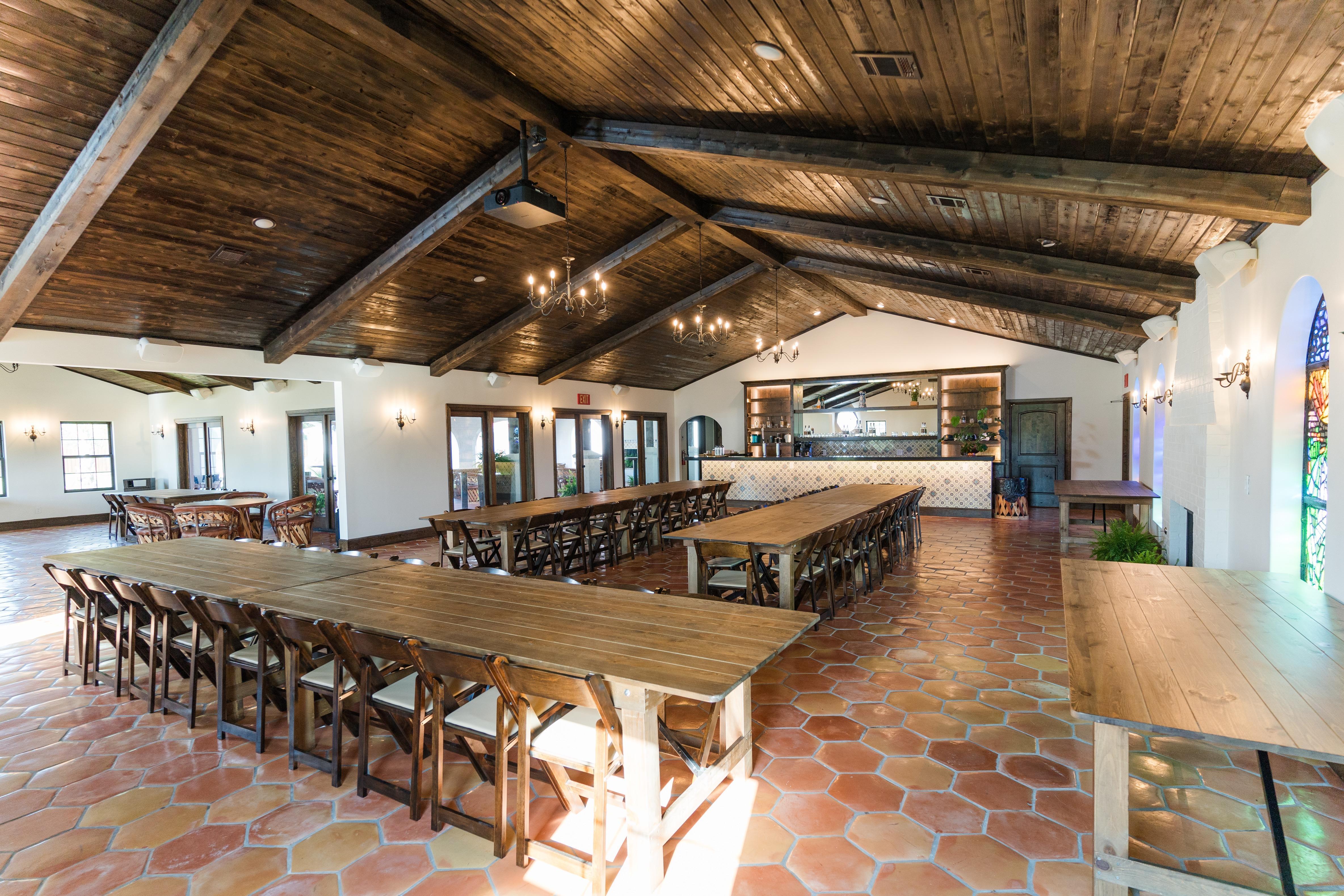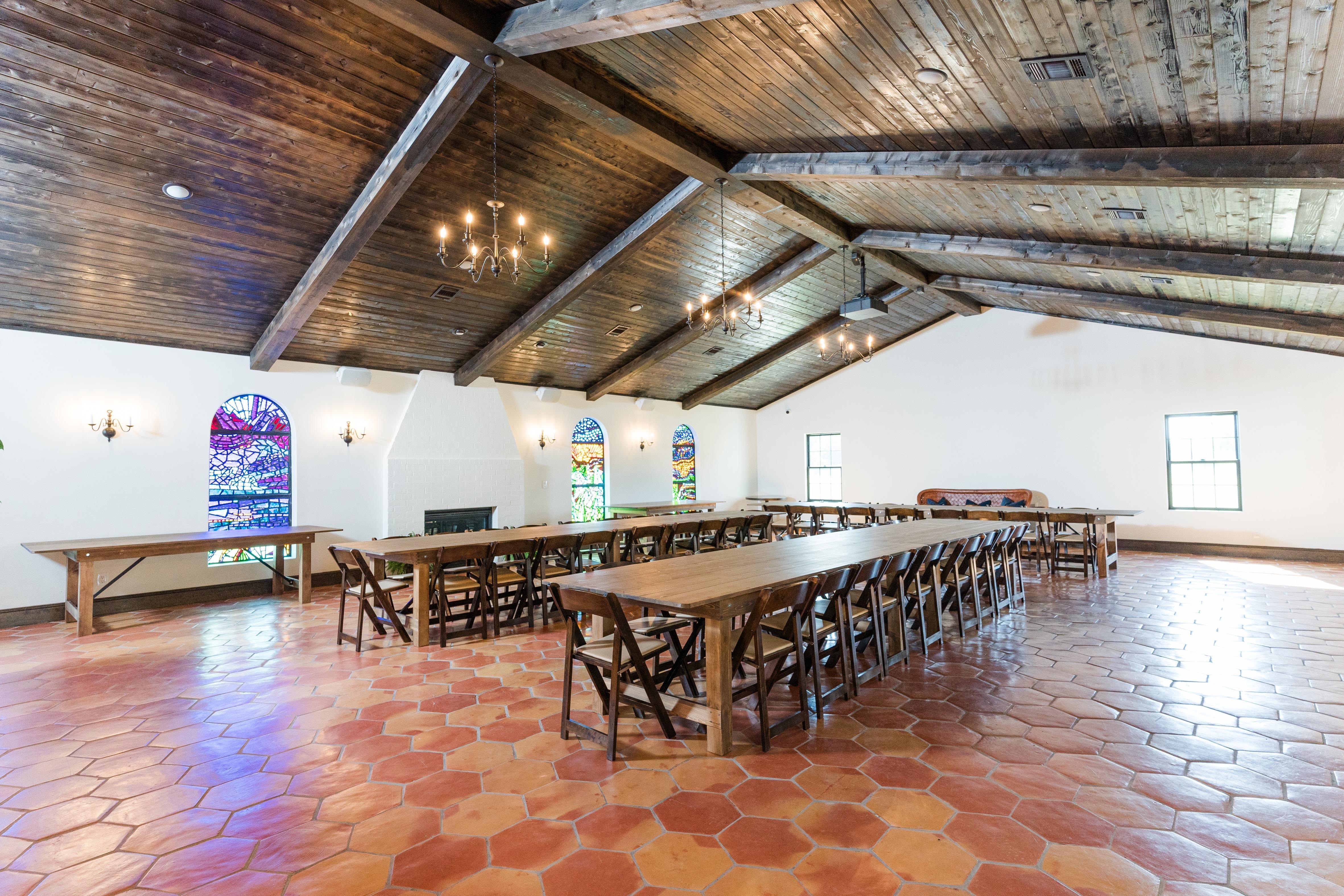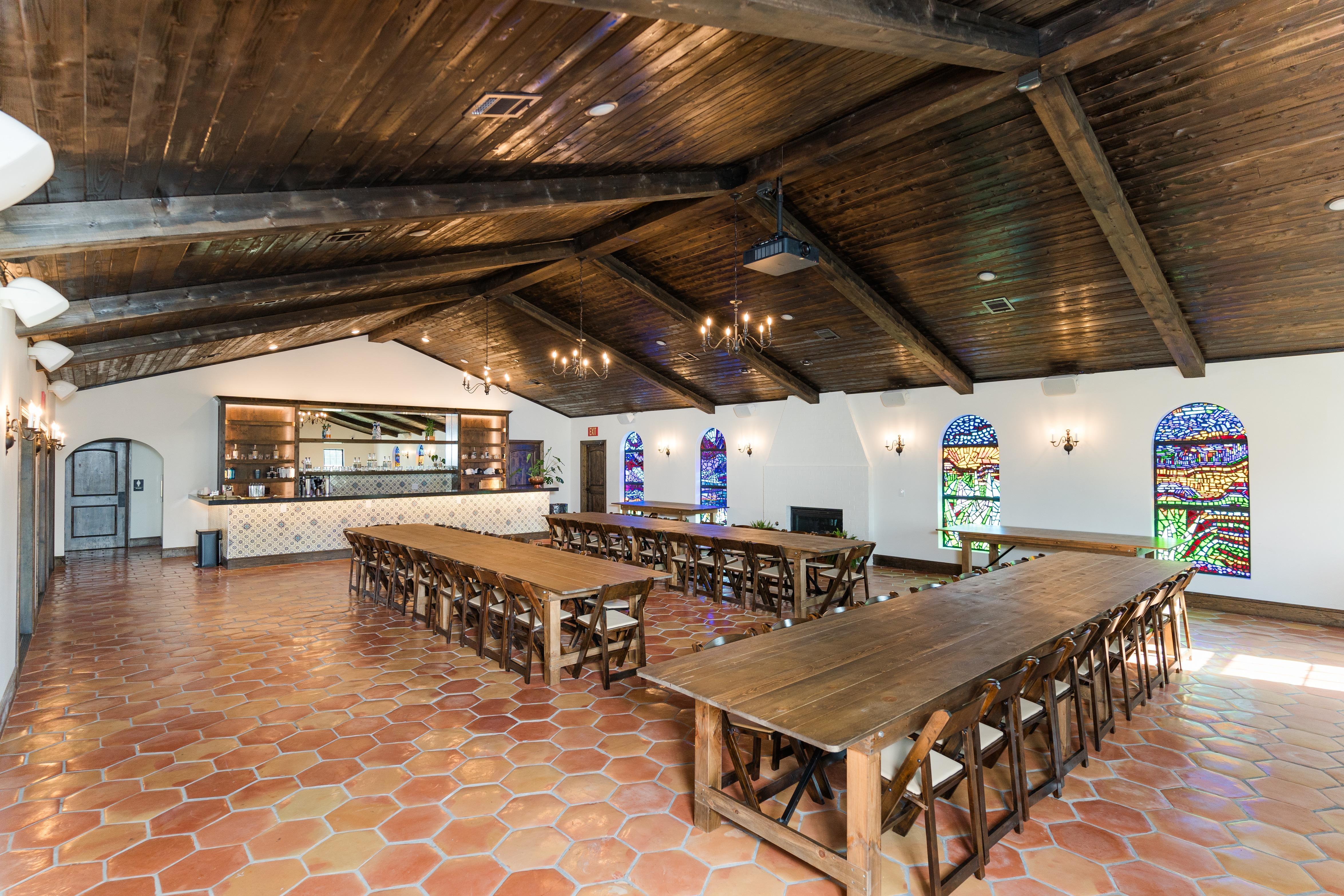 The beautiful Spanish colonial style event venue was built with your event in mind. Beautiful Saltillo tiles are laid throughout the space and dalle de verre glass is a statement piece that speaks for itself.