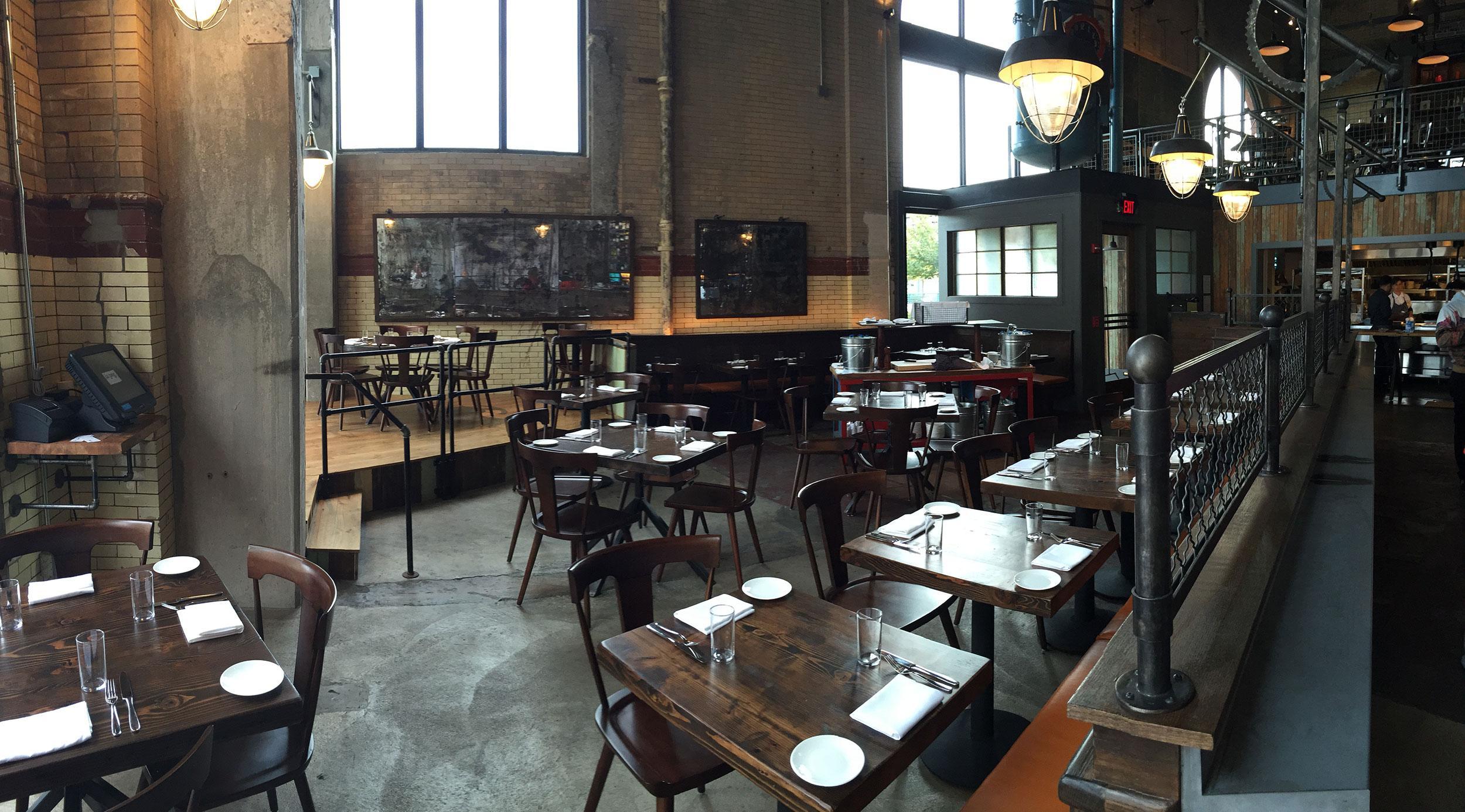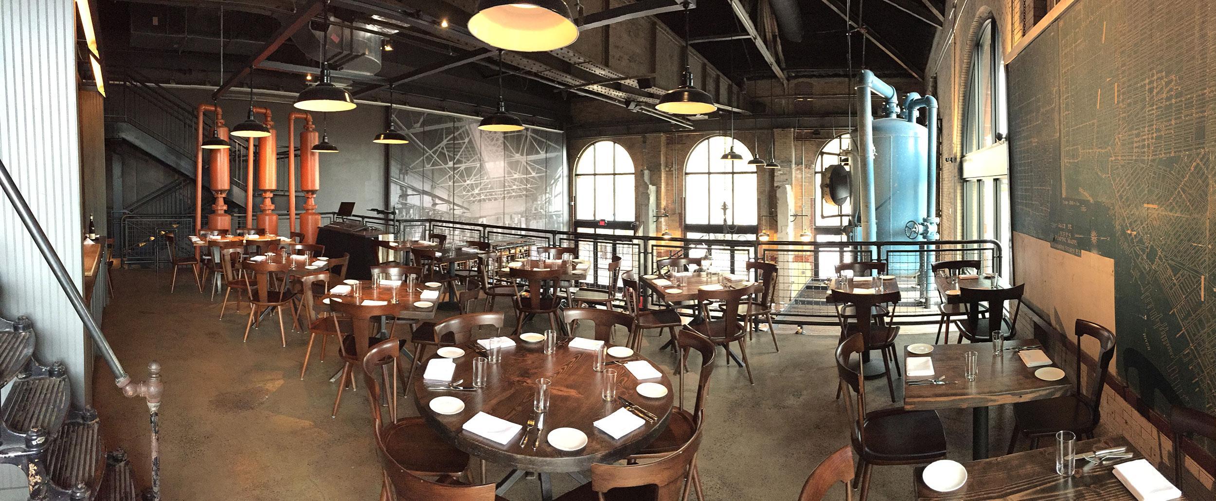 An industrial-chic dining room adorned salvaged tanks, shelves, staircase, doors and a map of the pumping system from the original building.