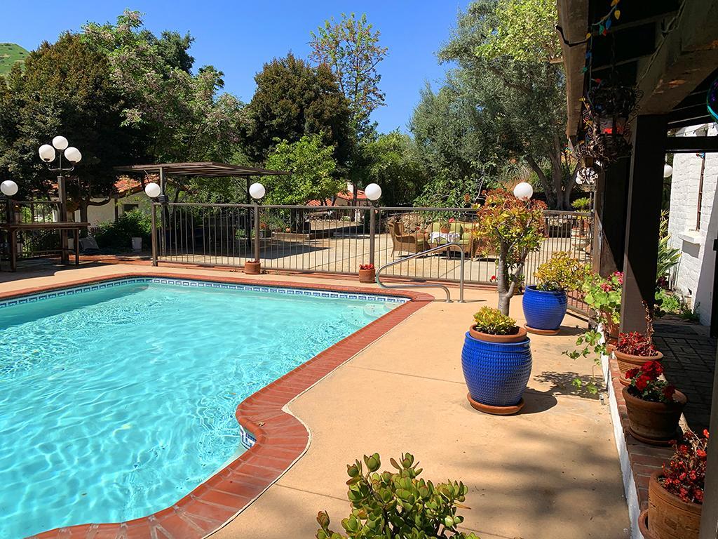 This space features Spanish-style architecture, a pool, outdoor jacuzzi, and built-in bar. Guests can lounge by the pool or mingle in the courtyard!