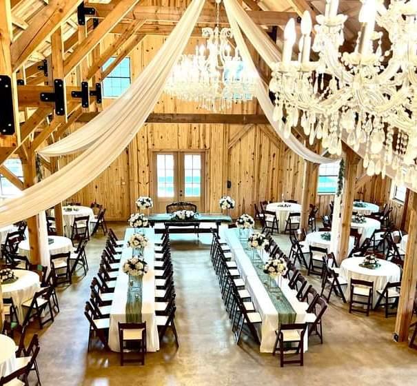 Chandeliers with dimmers Tables and Chairs Decorations Bar with Cedar Top Whiskey Barrel Cedar Top Cake Table WiFi