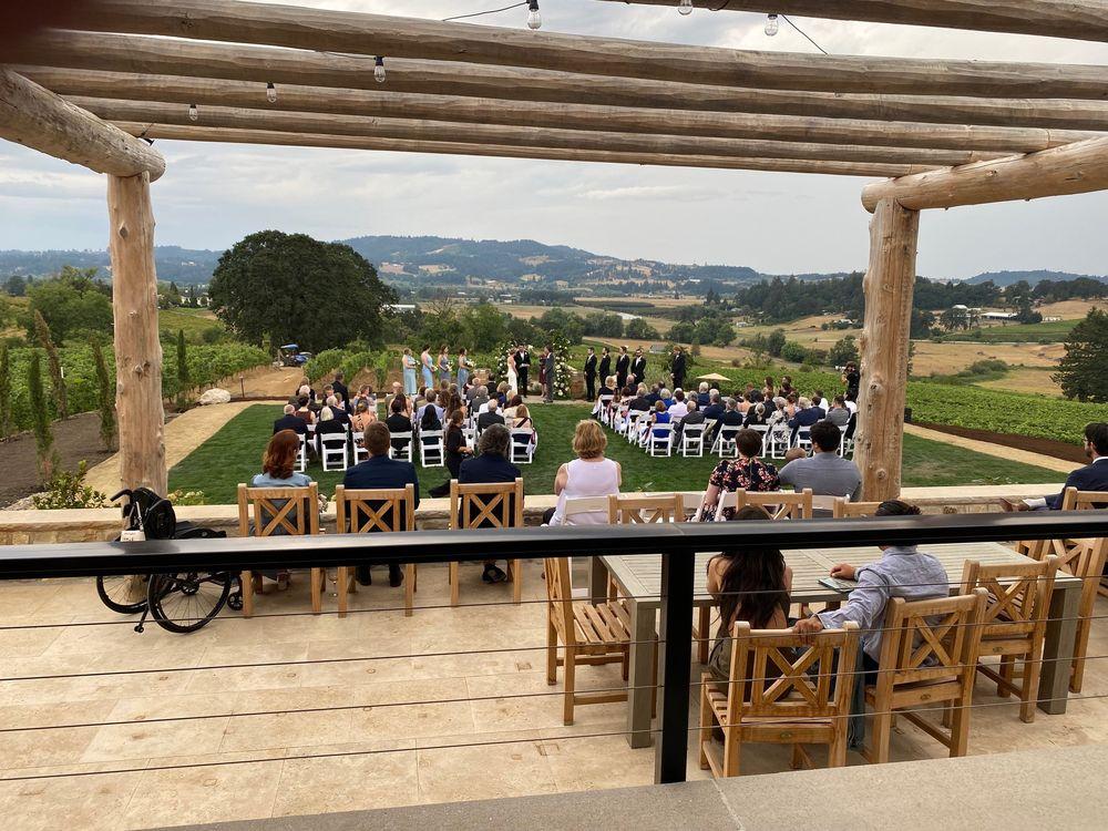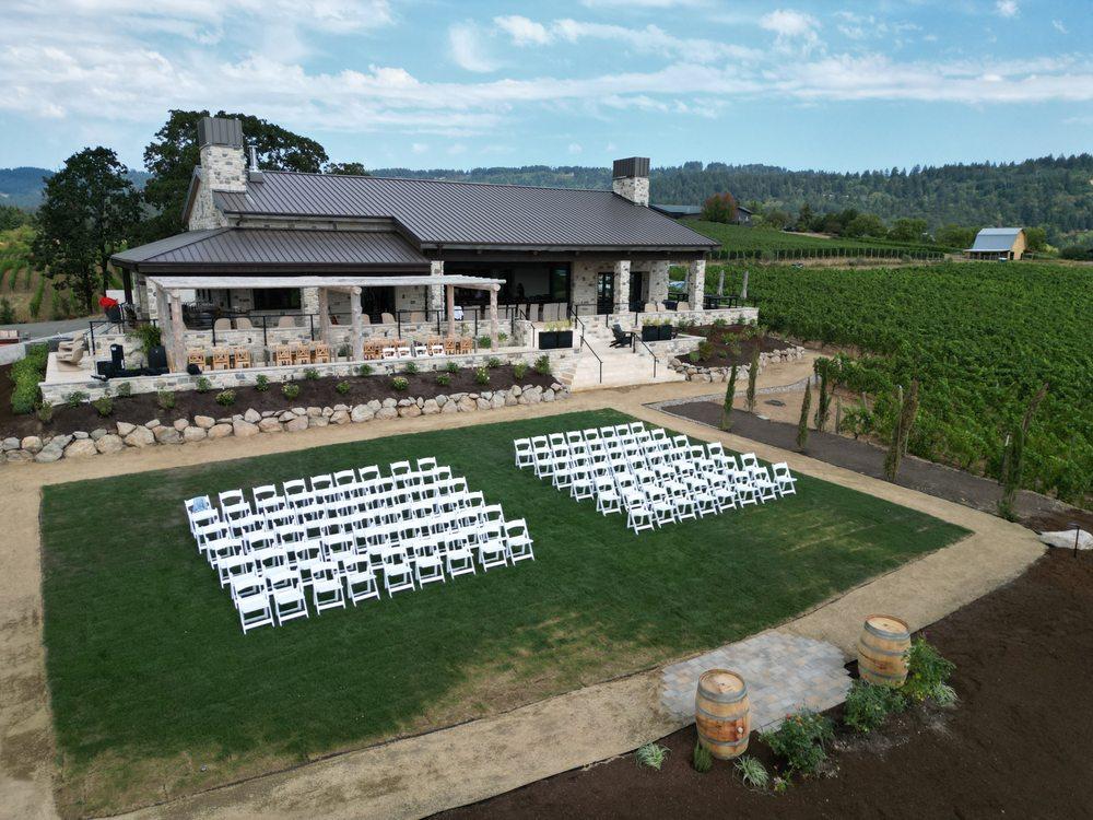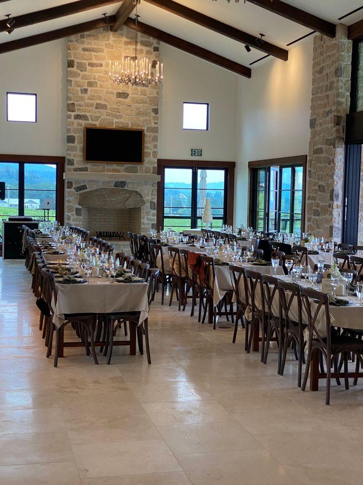 Nestled amidst lush vineyards, this charming venue provides a blend of rustic elegance and modern comfort. The indoor tasting room, adorned with cozy couches and inviting tables, seamlessly connects to a covered outdoor patio, perfect for pre-ceremony gatherings or cocktail hours. For those seeking a more open-air experience, the uncovered lower patio offers breathtaking views of the surrounding vineyards, creating a romantic and intimate atmosphere for your wedding ceremony or reception.
