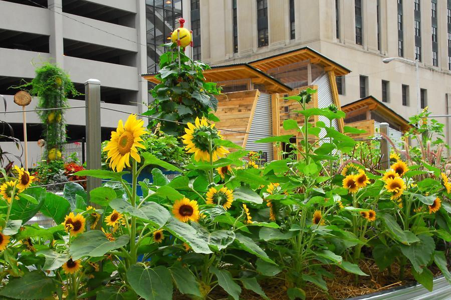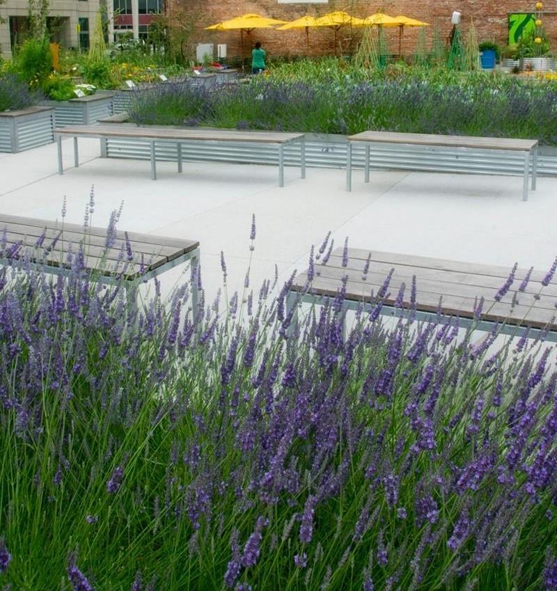 Nestled in the northeast corner of Lafayette Greens, the Sunflower Terrace is surrounded by sunflowers and flowering apple trees. This is our largest patio area allowing for clustered seating and an aisle wreathed by herbs and native wildflowers running from west to east.