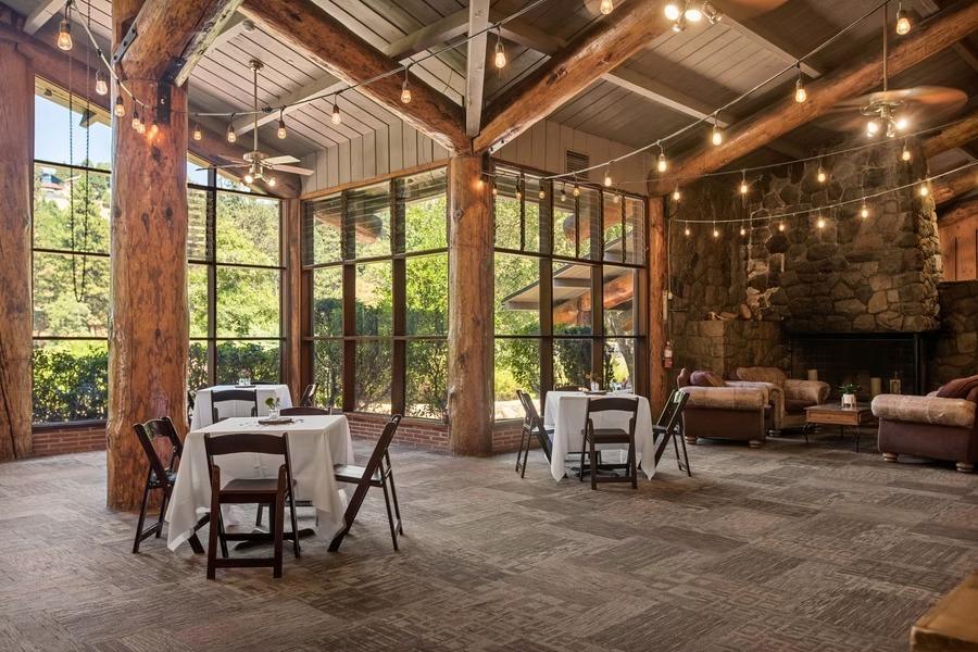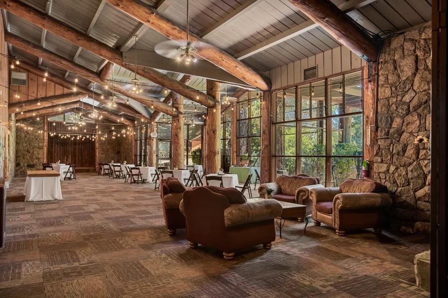 At San Moritz Lodge, your wedding unfolds within a historic lakeside lodge wrapped in natural beauty and timeless architectural charm. Just outside its doors lies the iconic grassy knoll—an emerald lawn facing Lake Gregory, shaded by a magnificent 125-foot sequoia that stands like a guardian over your vows. Indoors, the lodge offers warm wood tones, vaulted ceilings, and grand picture windows that frame golden sunlight and mountain silhouettes. The space feels both elegant and rustic, with its natural textures, mountain-lodge ambiance, and welcoming openness that invites guests to relax and celebrate. Whether your ceremony takes place beneath the towering sequoia or within the cozy interior, every moment feels elevated by the lodge’s rich history and breathtaking surroundings.