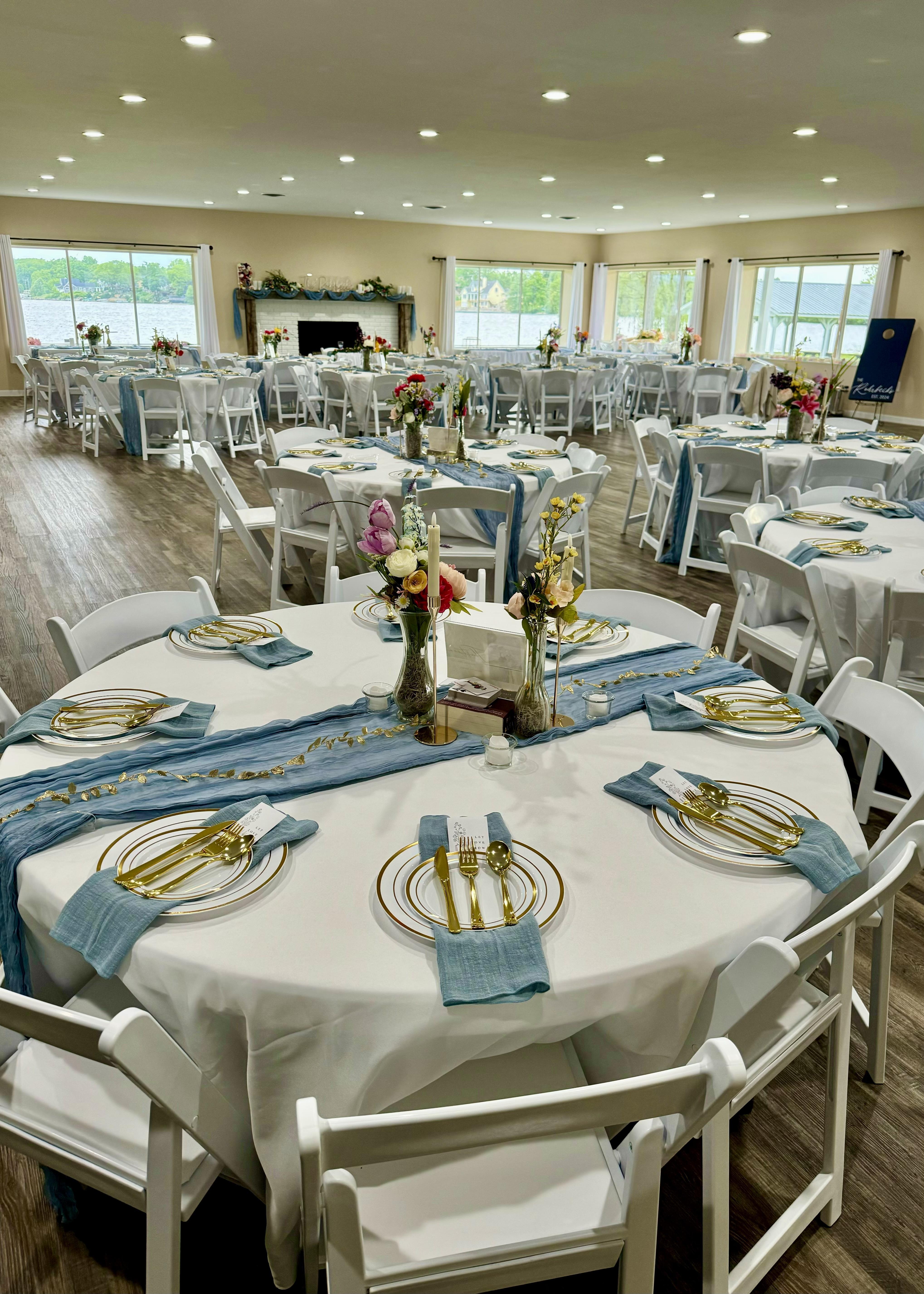 When renting the Boat Club you are renting the whole property for the weekend. This includes: -The Boat Club can seat up to 200, has tables, chairs, table linens, bathrooms, heat and a/c, warming kitchen and a portable bar. -two pavilions with electricity, picnic tables, white folding chairs and an arch for the ceremony. -bridal quarters You can bring in whatever outside vendors you want. Alcohol must be served by a licensed bartender.