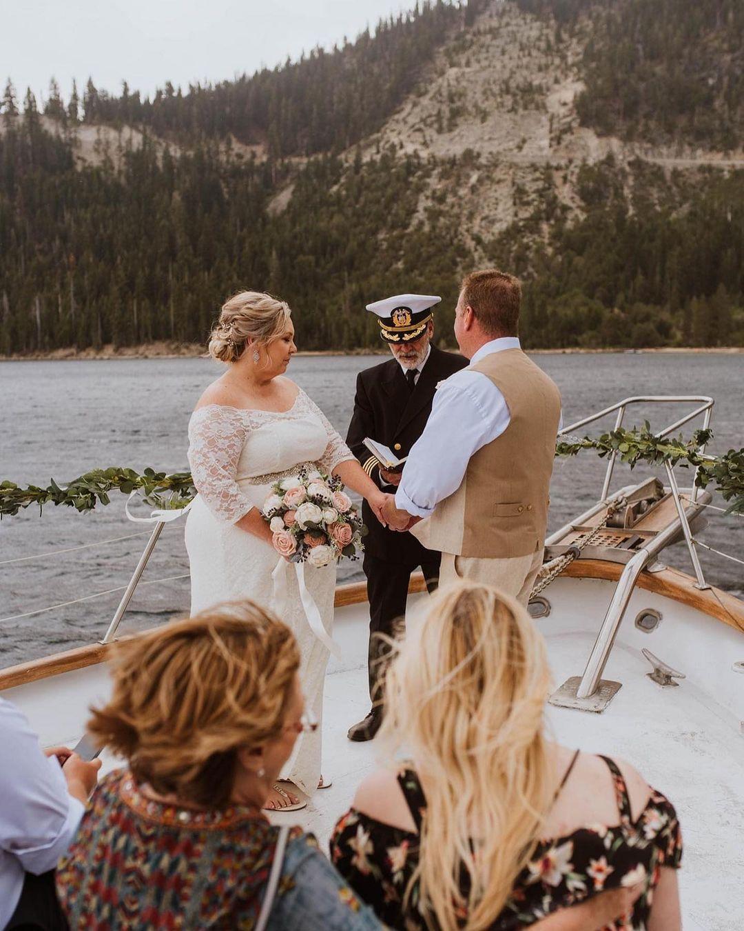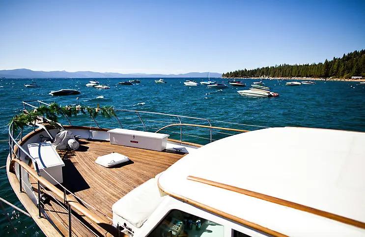 Lake Tahoe Bleu Wave is a boat wedding venue operating out of South Lake Tahoe, California. This spectacular yacht measures 70 feet in length and has sailed around the world. For your wedding day, it can provide you with a secluded setting as it transports you to Lake Tahoe. Celebrate tying the knot atop crystal-blue waters as the splendid scenery shifts in the sunlight. With room onboard for approximately 47 people, you and your guests can enjoy a marvelous, private celebration. Up on the Party Bow, everyone can enjoy the fairytale romance as you and your partner exchange vows. Meanwhile, on the Sun Deck, you can take in the natural wonder of the landscape around you from its higher elevation. You'll be able to see the sights, including Emerald Bay, Rubicon Point, Mount Tallac, and Edgewood Golf Course.