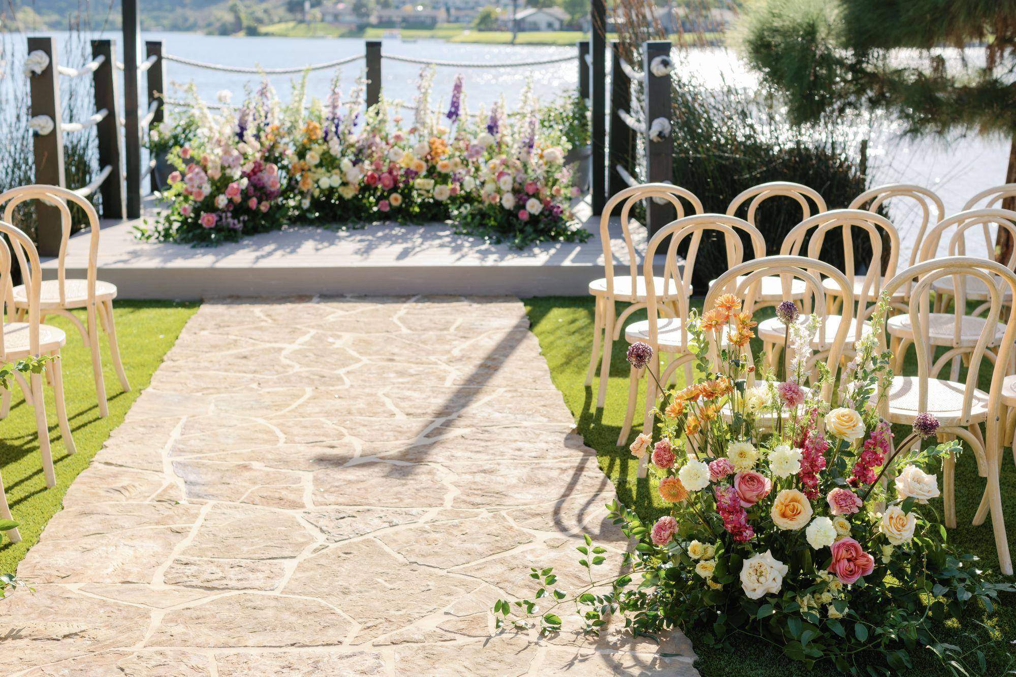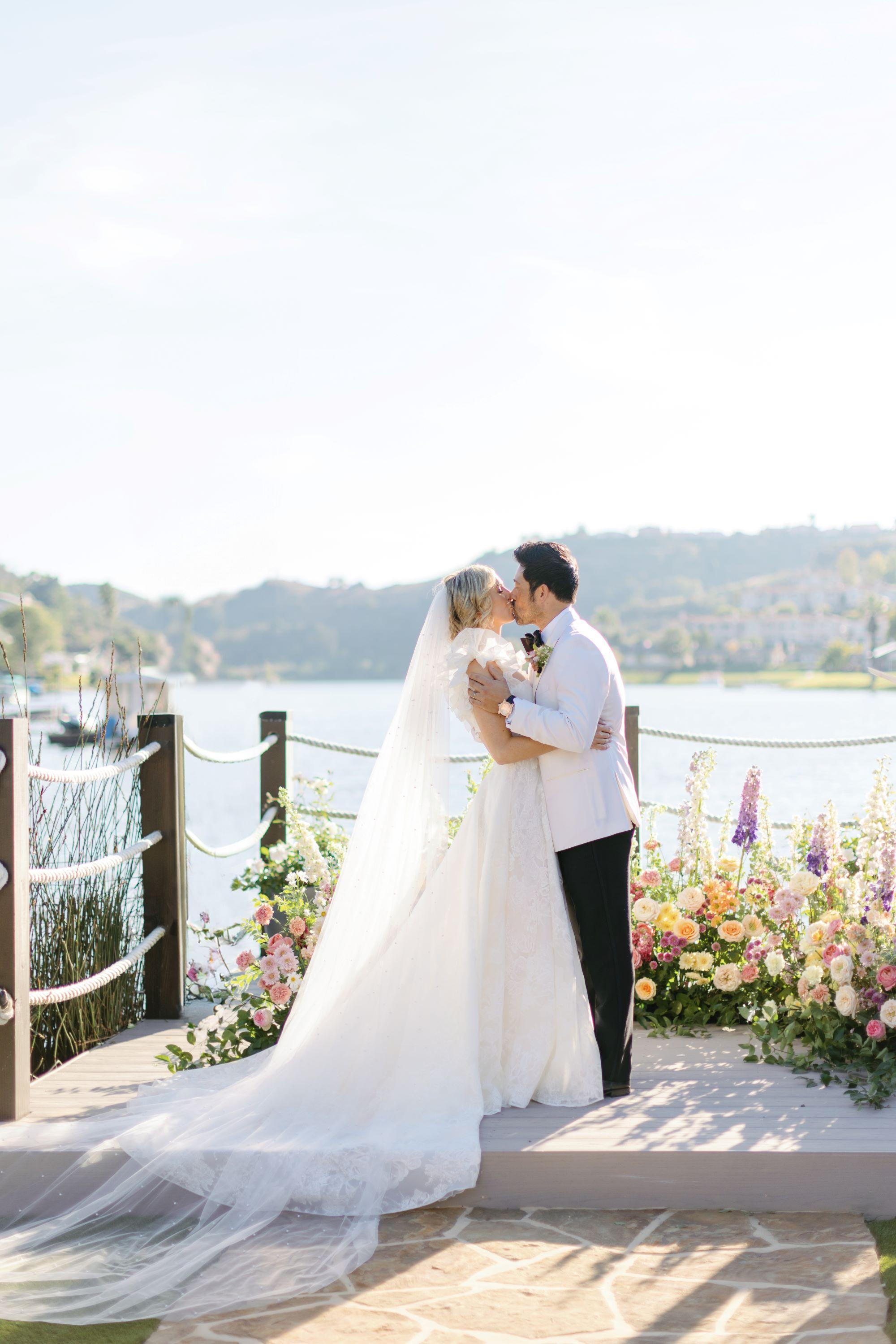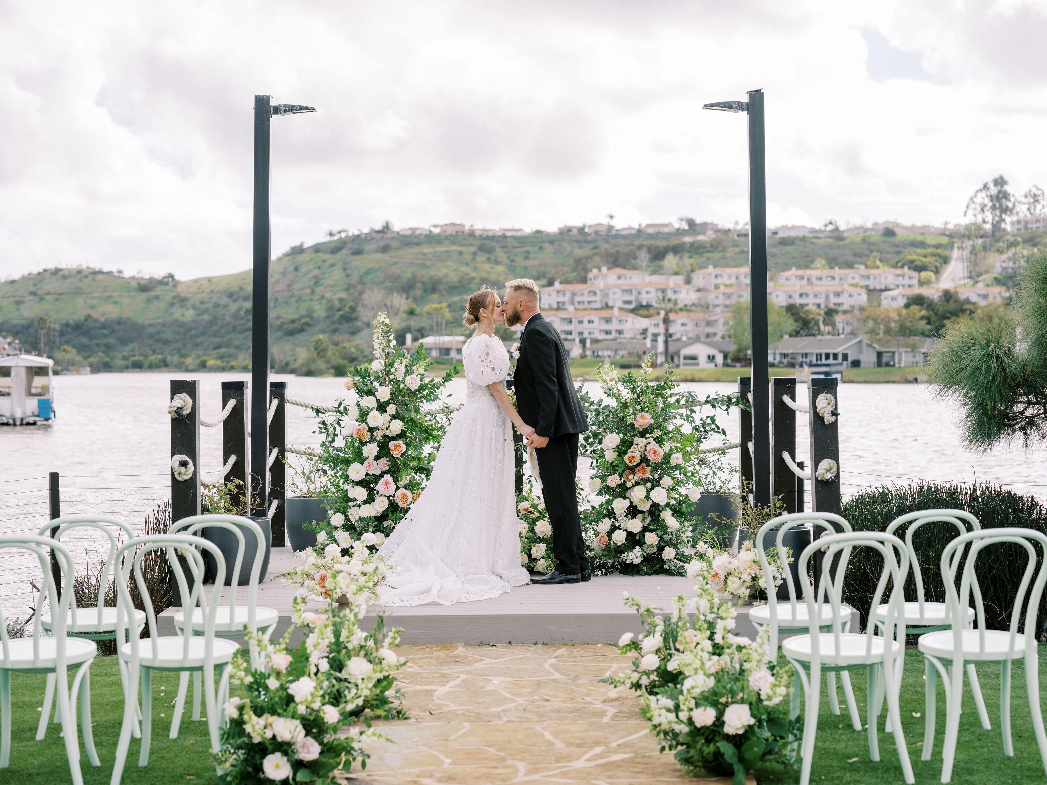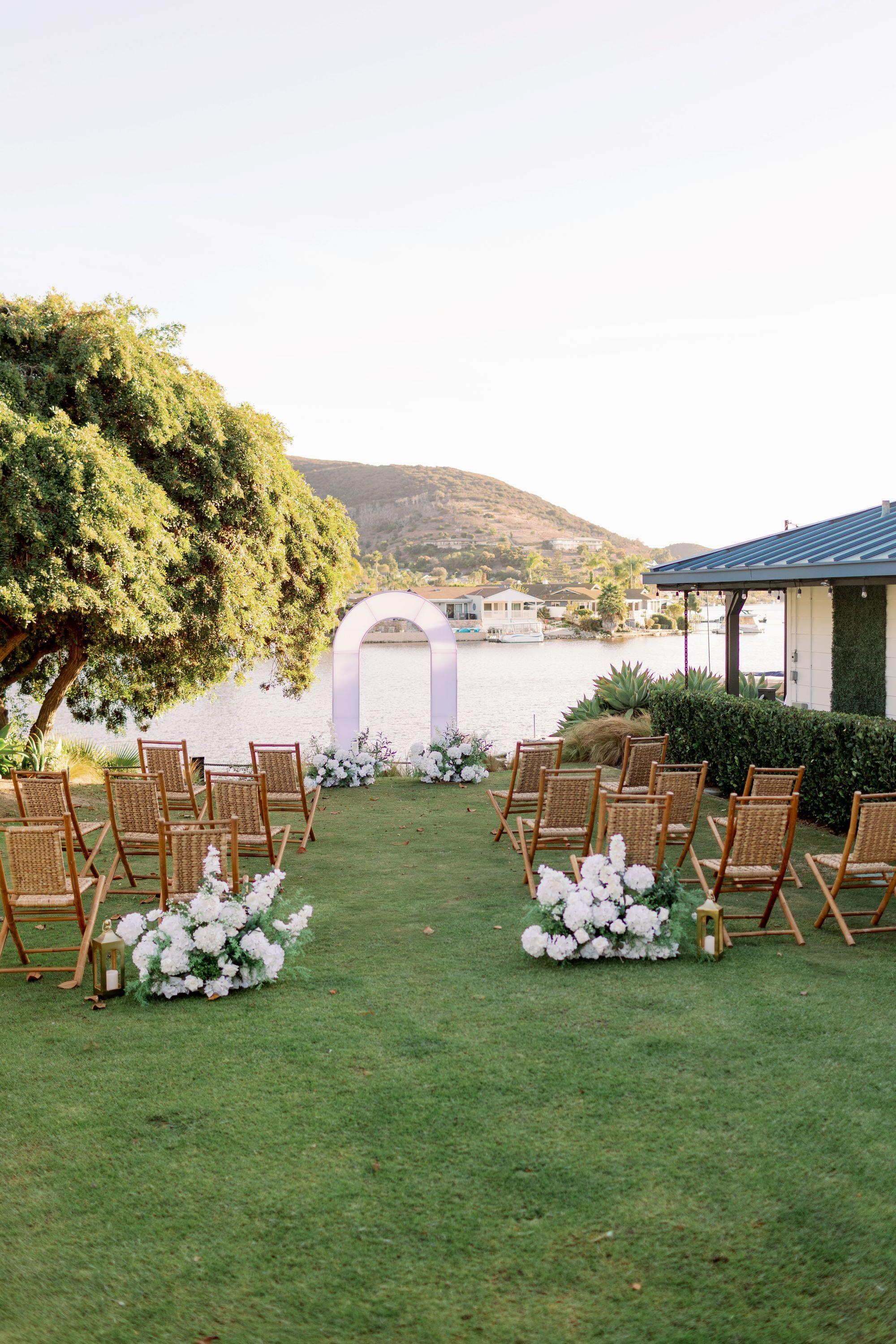 Framed by tranquil waters and a charming white arbor, this lakeside haven is made for picture-perfect vows