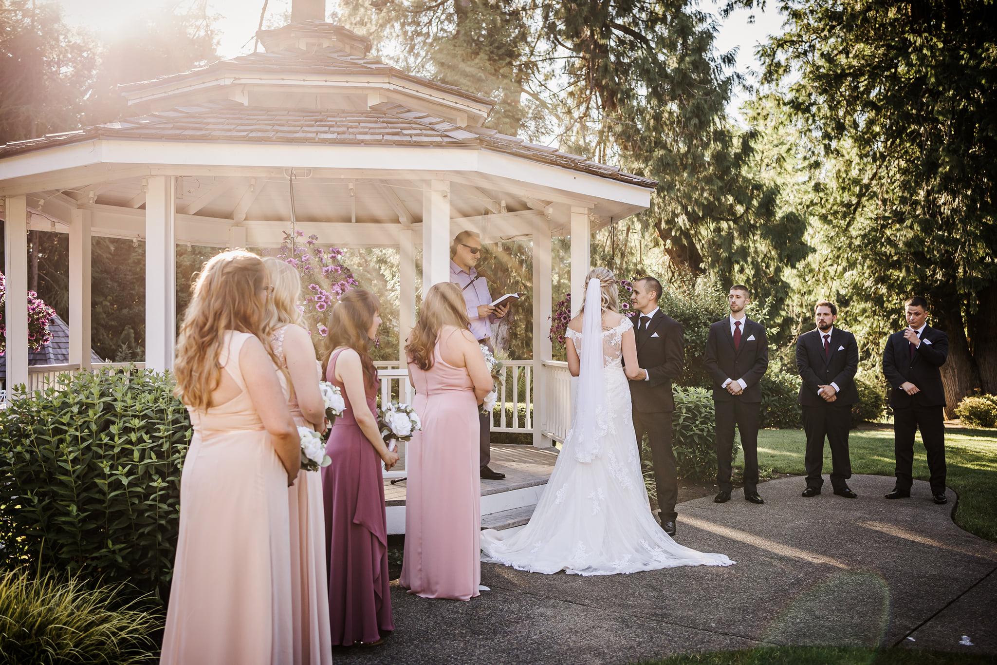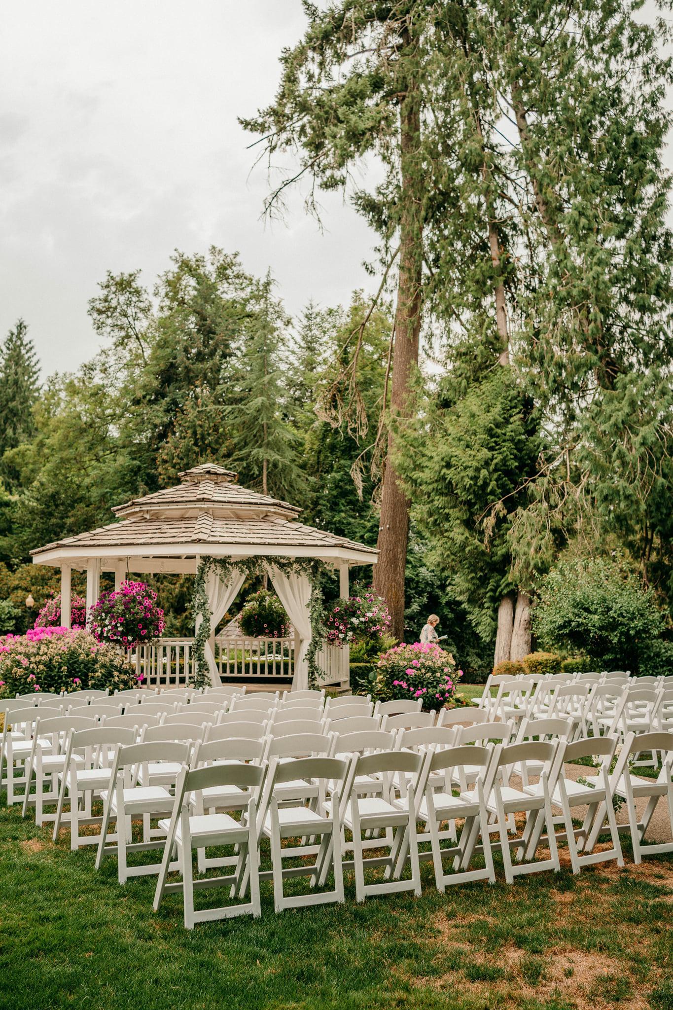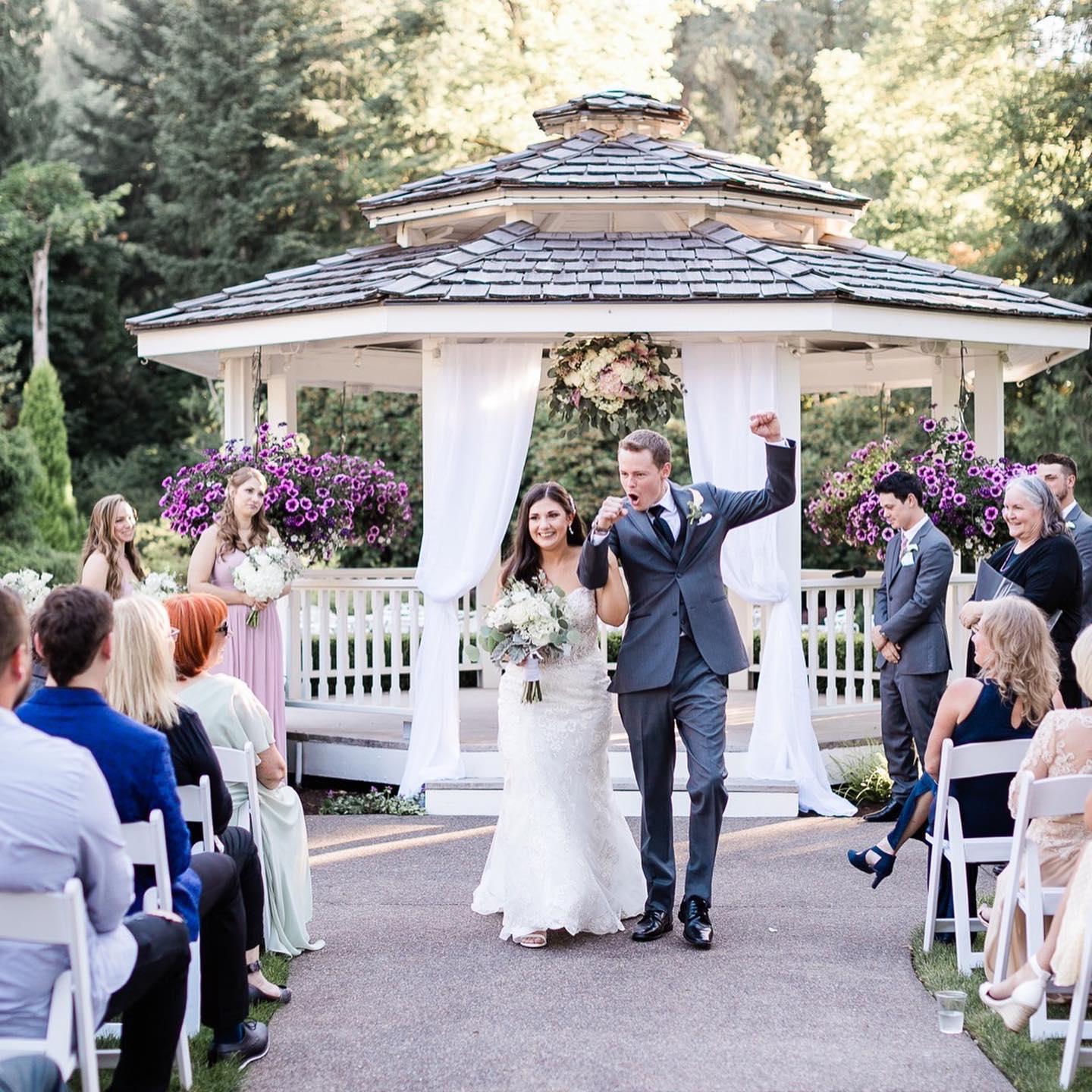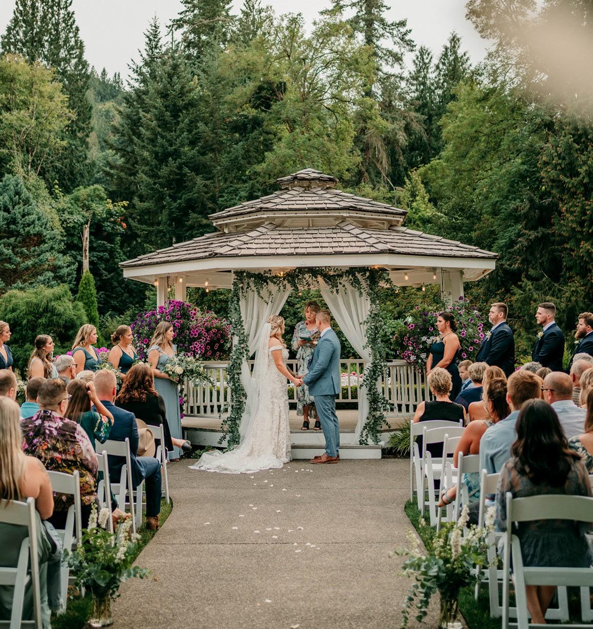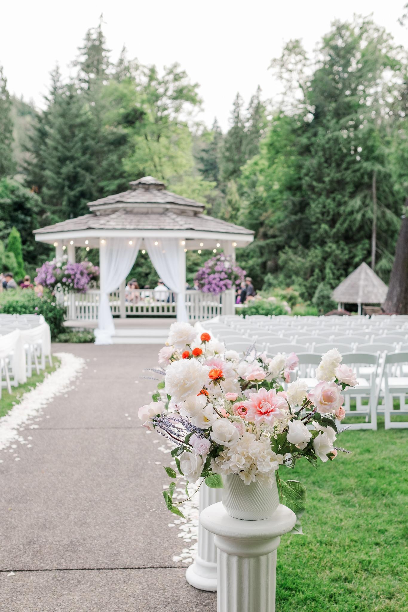During the warmer months, you may choose to marry outside at the Upper Gazebo. You’ll proceed through a charming white pergola, covered in a sweetly scented wisteria, to the gazebo. The gazebo is adorned with hanging baskets and beds of flowers.