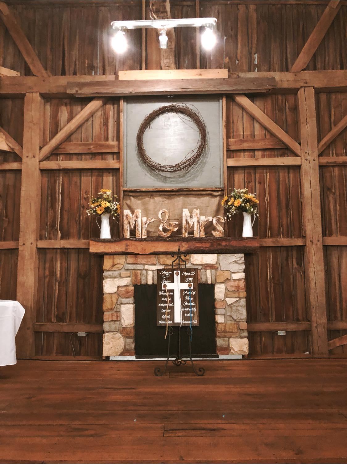 Romantic string lighting throughout, rustic sconces and chandeliers, lighted wreath with greenery, 2 faux fireplaces, unique changing spaces including silo & a 50s-style diner, restrooms, on-site parking plus attendants, rustic furniture & decor accents, round/rectangle tables and white, wooden padded chairs, heating and A/C, built-in bar plus outdoor grain bin bar, and beautiful lakeside grounds with gazebo and a pergola covered patio with a gas fireplace. Endless photo opportunities!