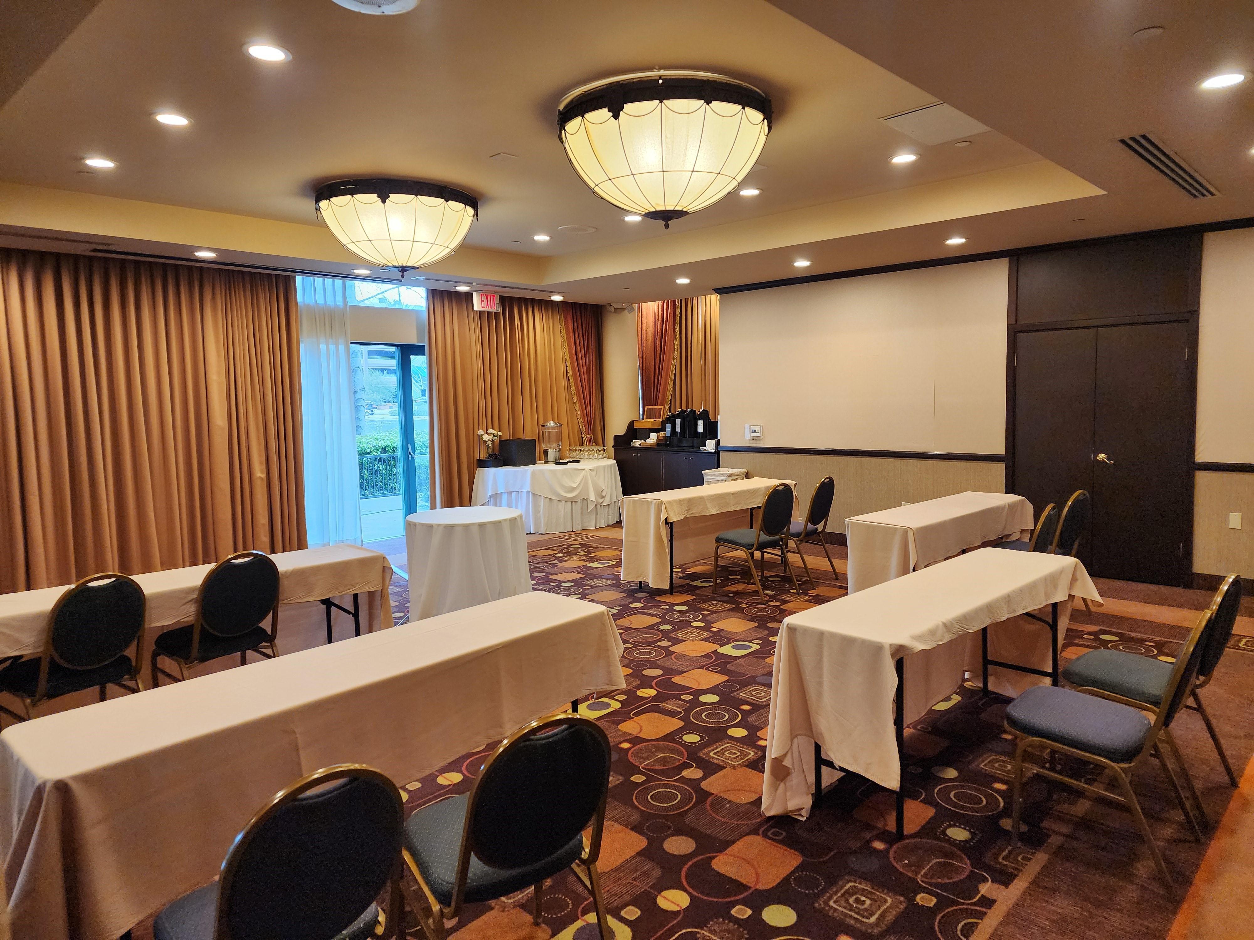 This space features about 1,800 square feet of indoor meeting space for meetings and social events with a banquet service team.