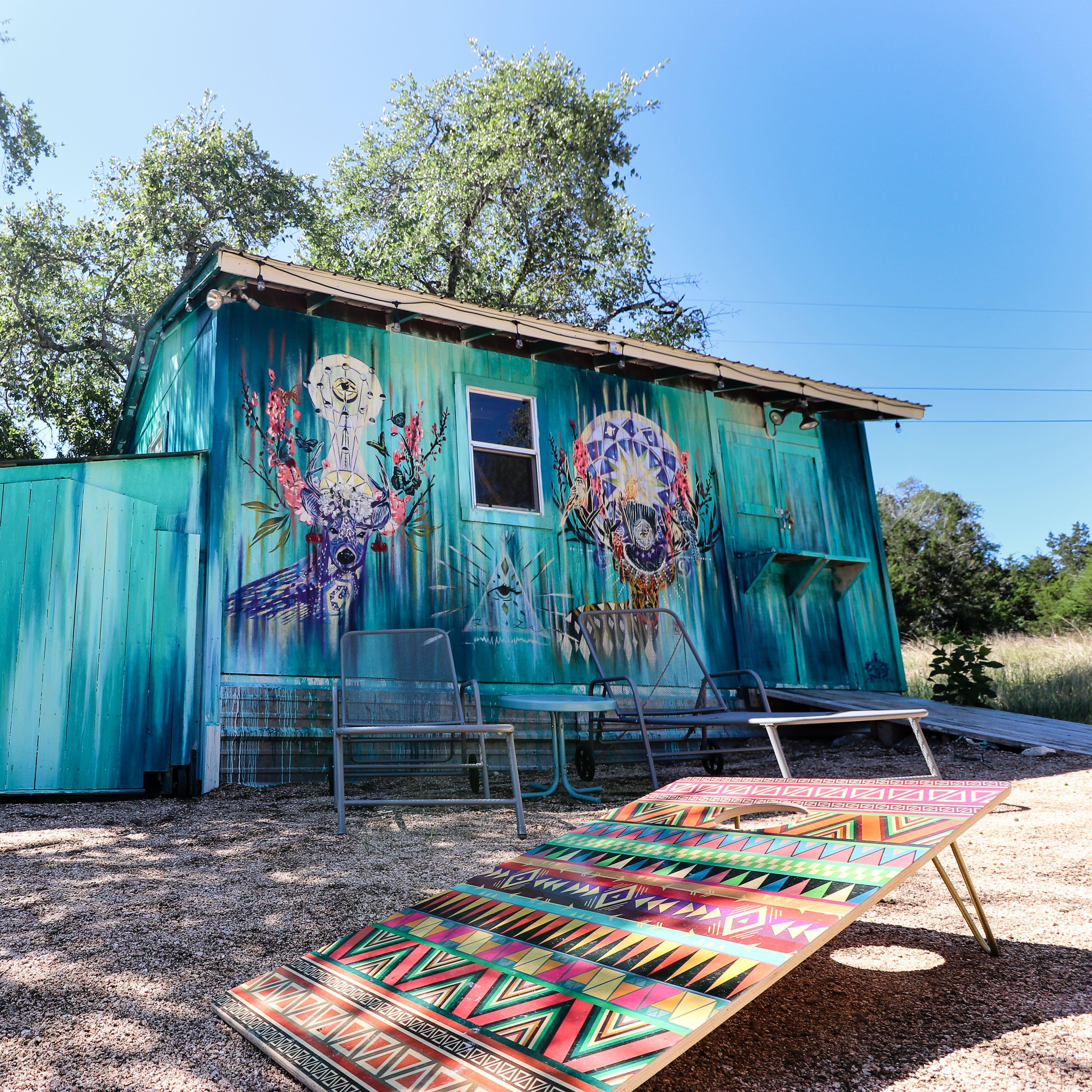 Welcome daydreamers and stargazers. You have a home at LaLa (personal information protected by Zola) unique 10-acre property caters to the whims of the gypsy and the wild in your heart. Many guests describe LaLa Park as "magical." We like to think of it as a haven for creative spirits, merrymakers and lovers of all things whimsical. We are also an active honey farm and have a gated bee apiary with 9 hives. LaLa Park's 2-story, cedar lodge has 5 large bedrooms with 6 beds, 3.5 bathrooms, 2 kitchens and plenty of charm to spare. It sleeps up to 12 people comfortably with 2 king-sized beds and 4 queen-sized beds. There are also 2 dining areas and 2 living room spaces—one with a wood-burning stove and the other with a stone fireplace. Our sprawling 2-acre main lawn with a large music stage makes for the perfect outdoor event space. It's adorned with stained glass windows, colorful murals, unicorn statues, mermaids and many more garden treasures. You won't find another place like it in Texas.