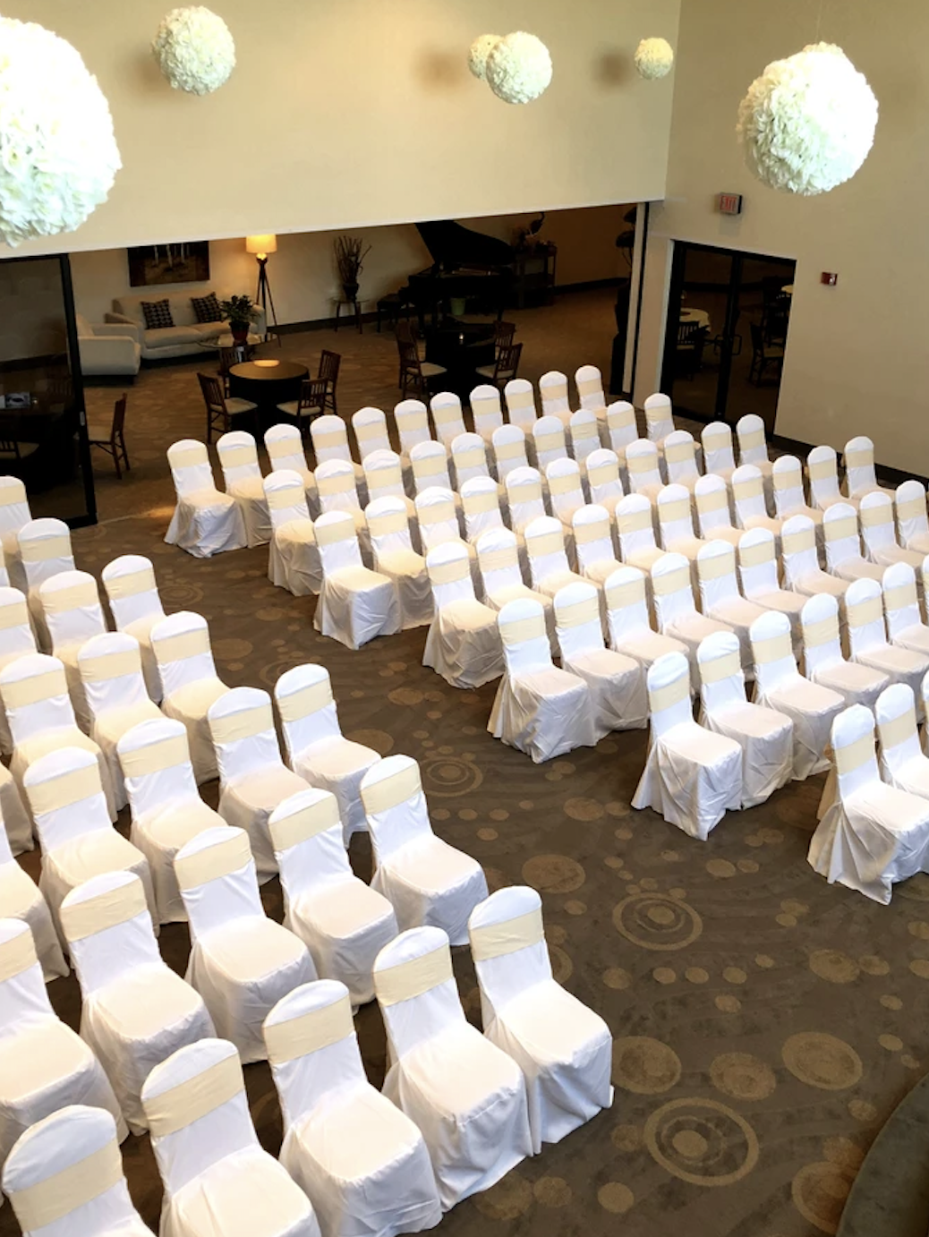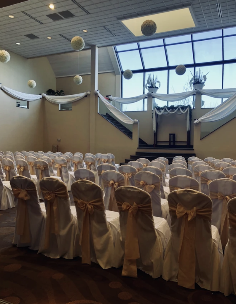 This glass enclosed galleria features an open glass wall and ceiling with skylight, bringing an elegant glow to your ceremony. White, satin fabric is suspended from the upper mezzanine, adding a dramatic effect to the grand staircase and the cathedral ceiling is accented with a twinkling canopy. Your guests will enjoy the sounds of our baby grand piano played by our professional pianist throughout your exchange of vows.