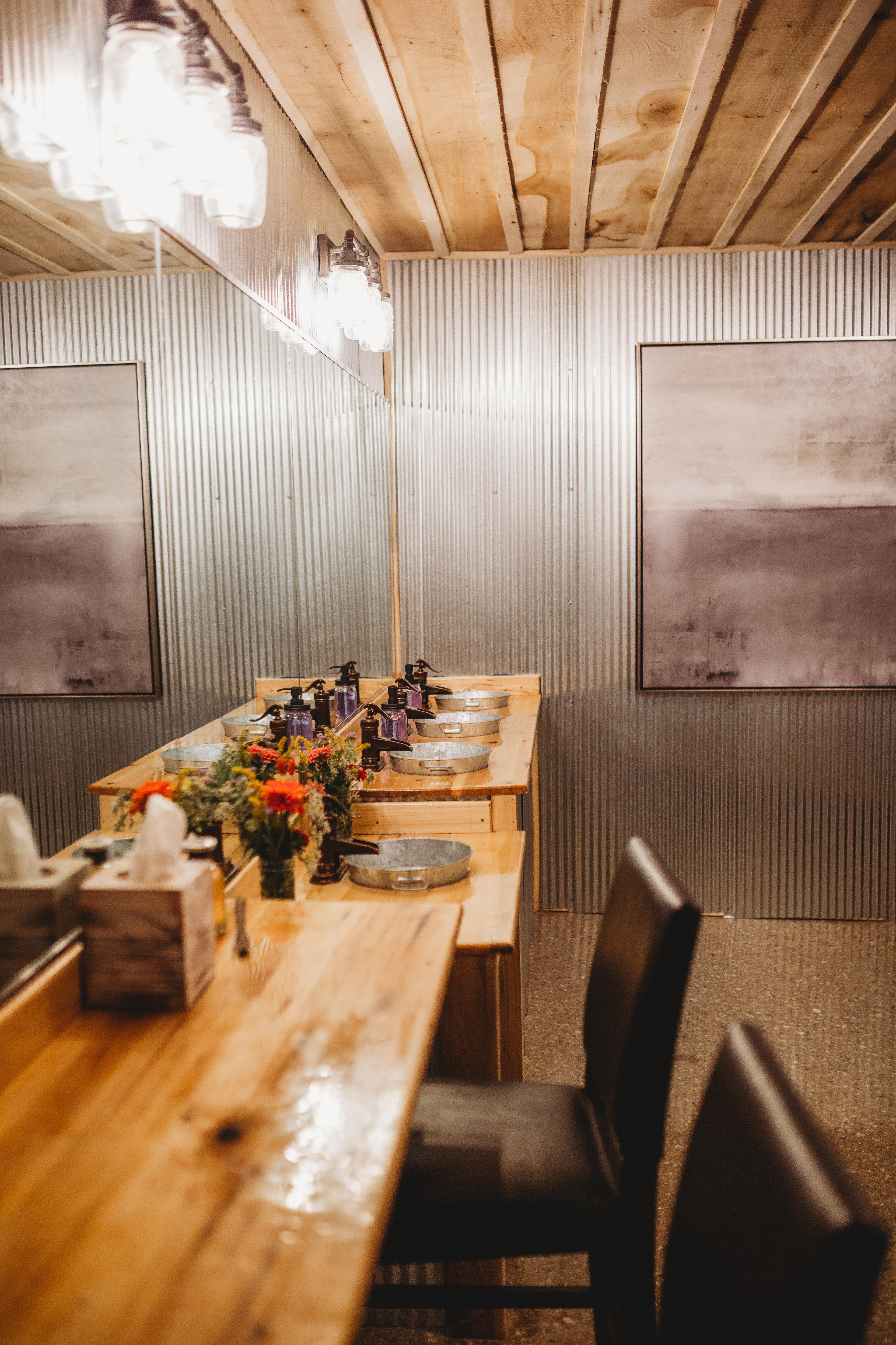 The Bridal Room sits adjacent to the Women's Restroom and has 2 entrances. Six bar stools run along a wrap around make up bar and mirror that stretches from one corner of the room to the other. Two comfortable seats, shelving for the brides and bridesmaids, another Tall mirror next to the door that connects the Bridal room to the Women's restroom.
