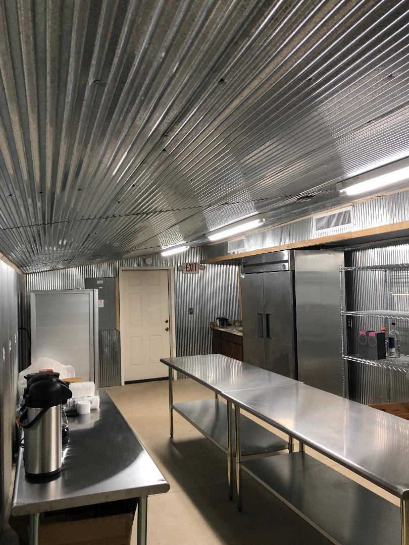 49.5 Cu. Ft. Industrial Refrigerator 2 Oven Warmers Microwave Deep Freezer Ice Machine 3 Stainless Steel Prep Tables Coffee Machines 3 comp sink 2 comp sink mop sink additional shelving space
