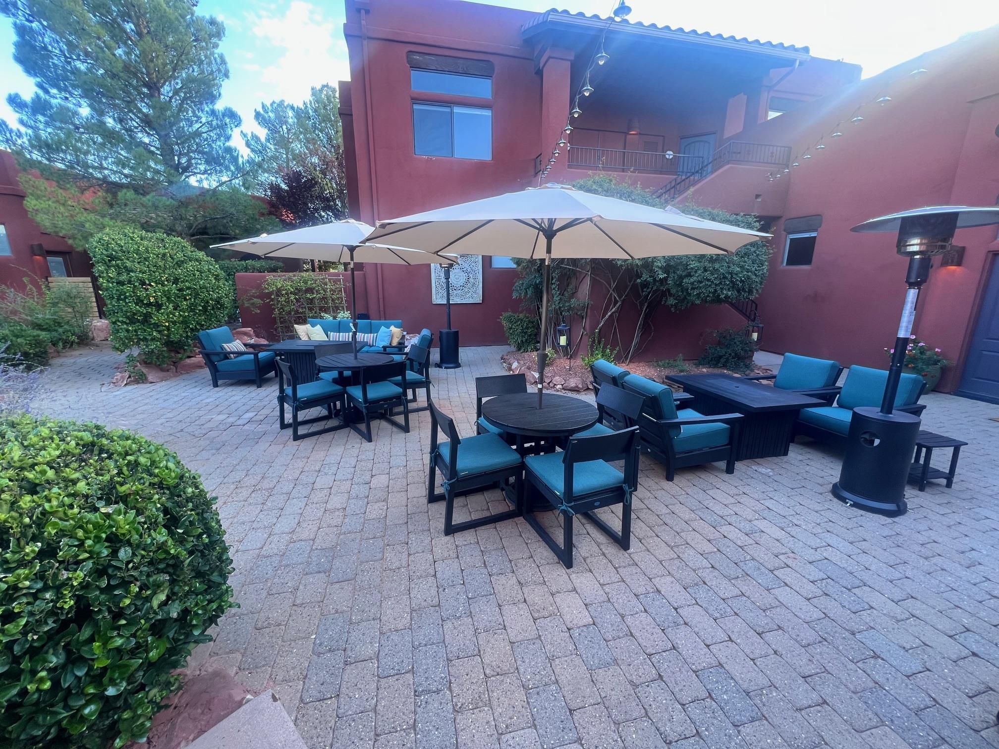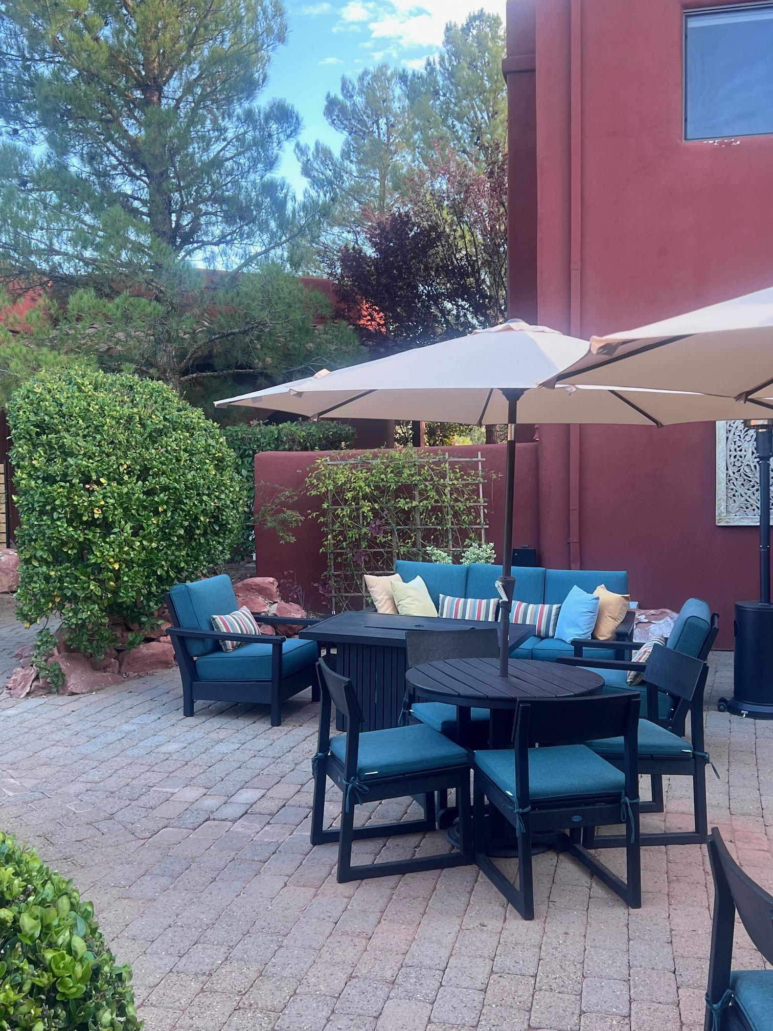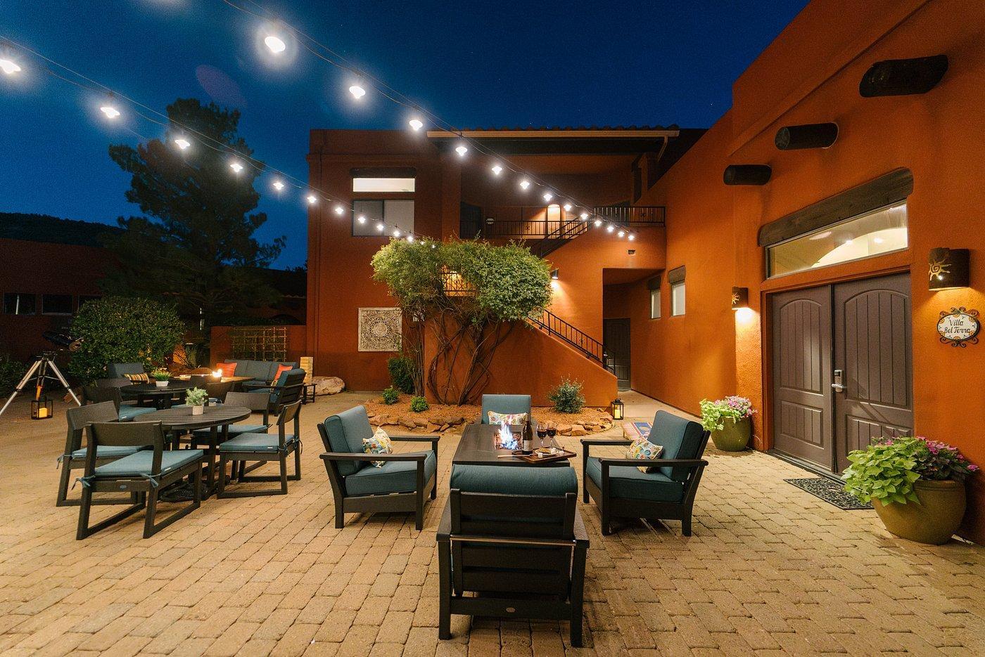 Private outdoor patio amidst the red rocks—perfect for micro weddings, cocktail hours, or welcome parties in a serene Sedona private estate setting.