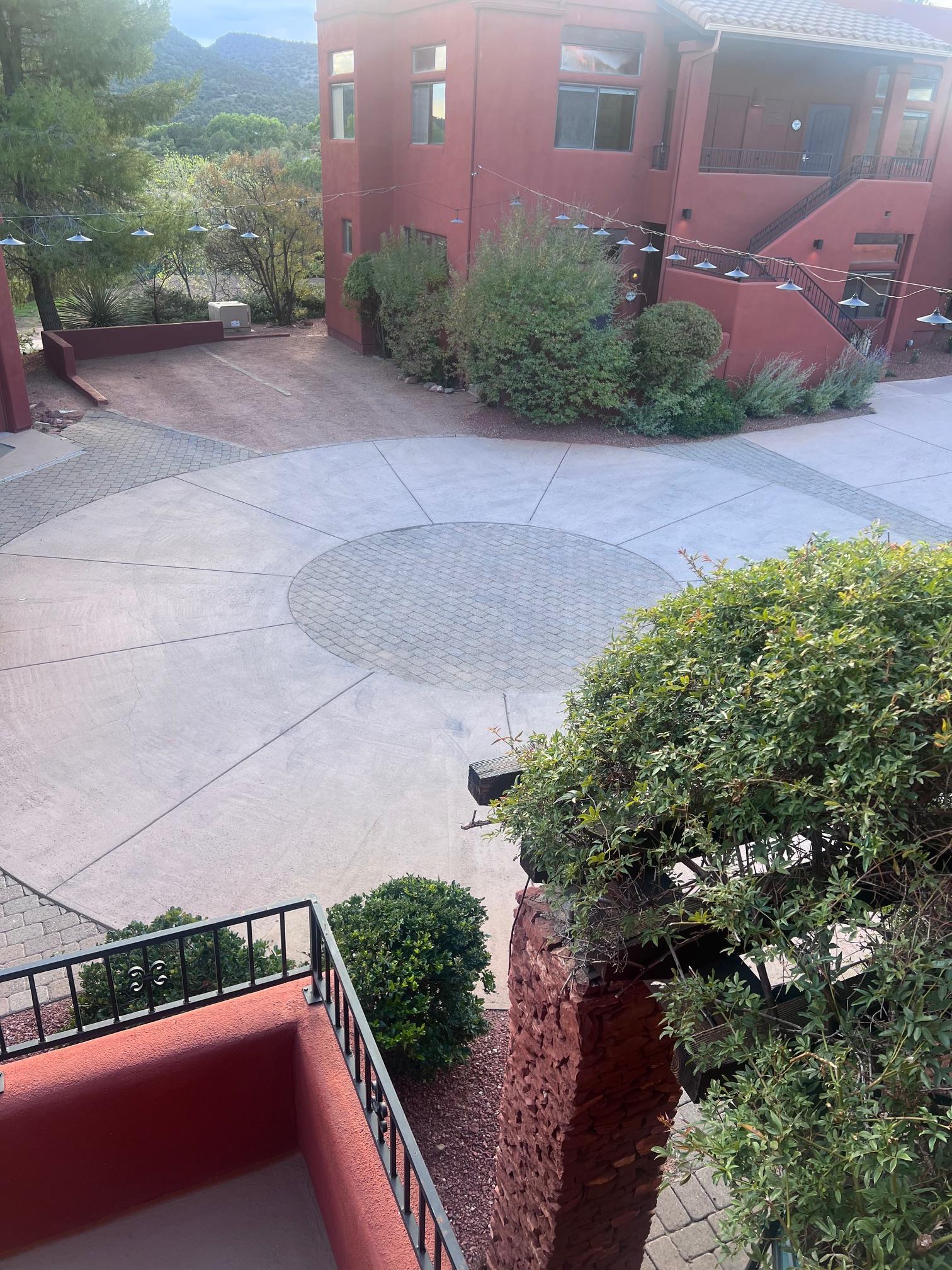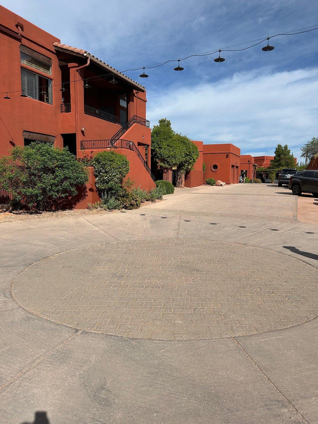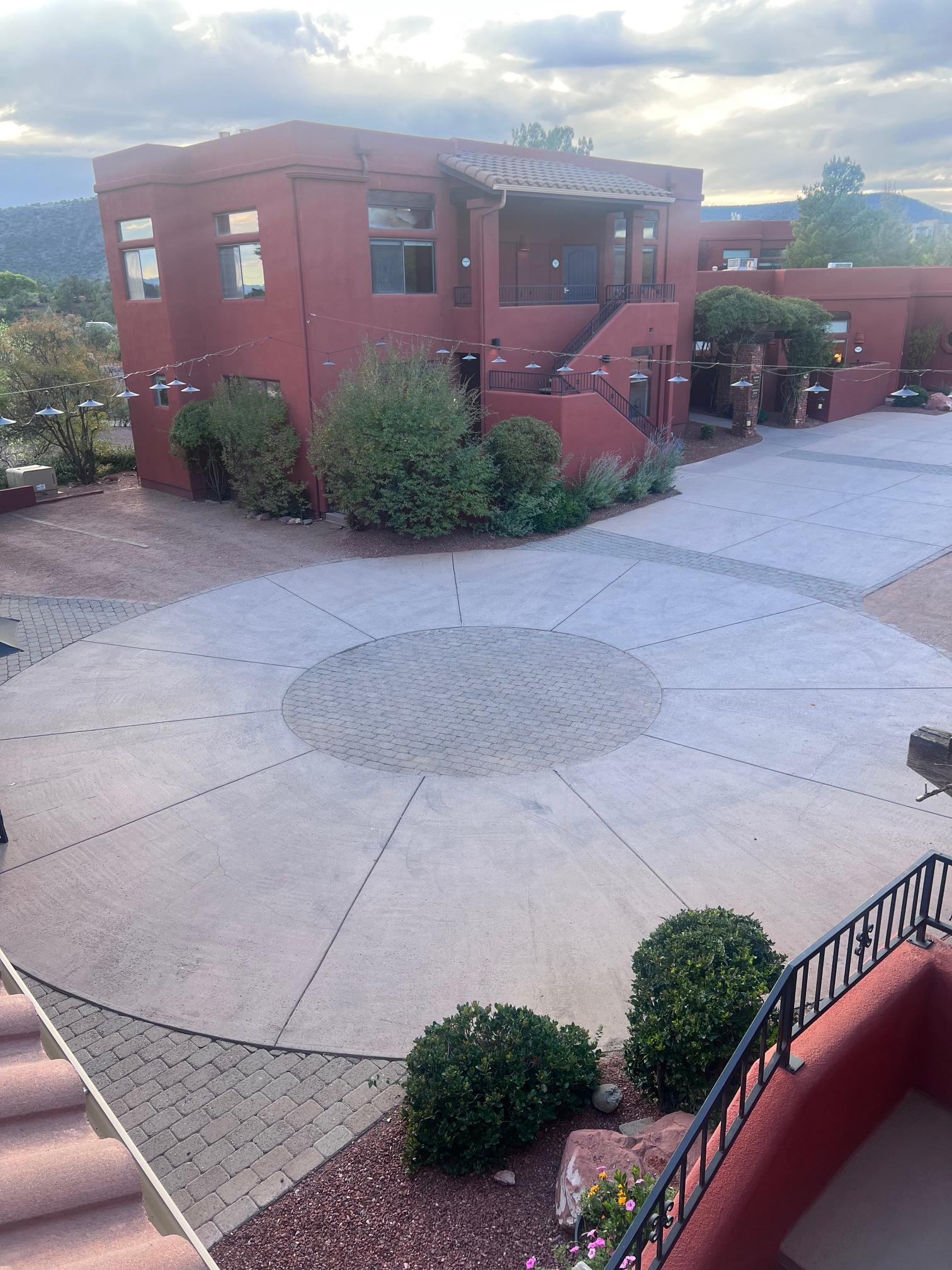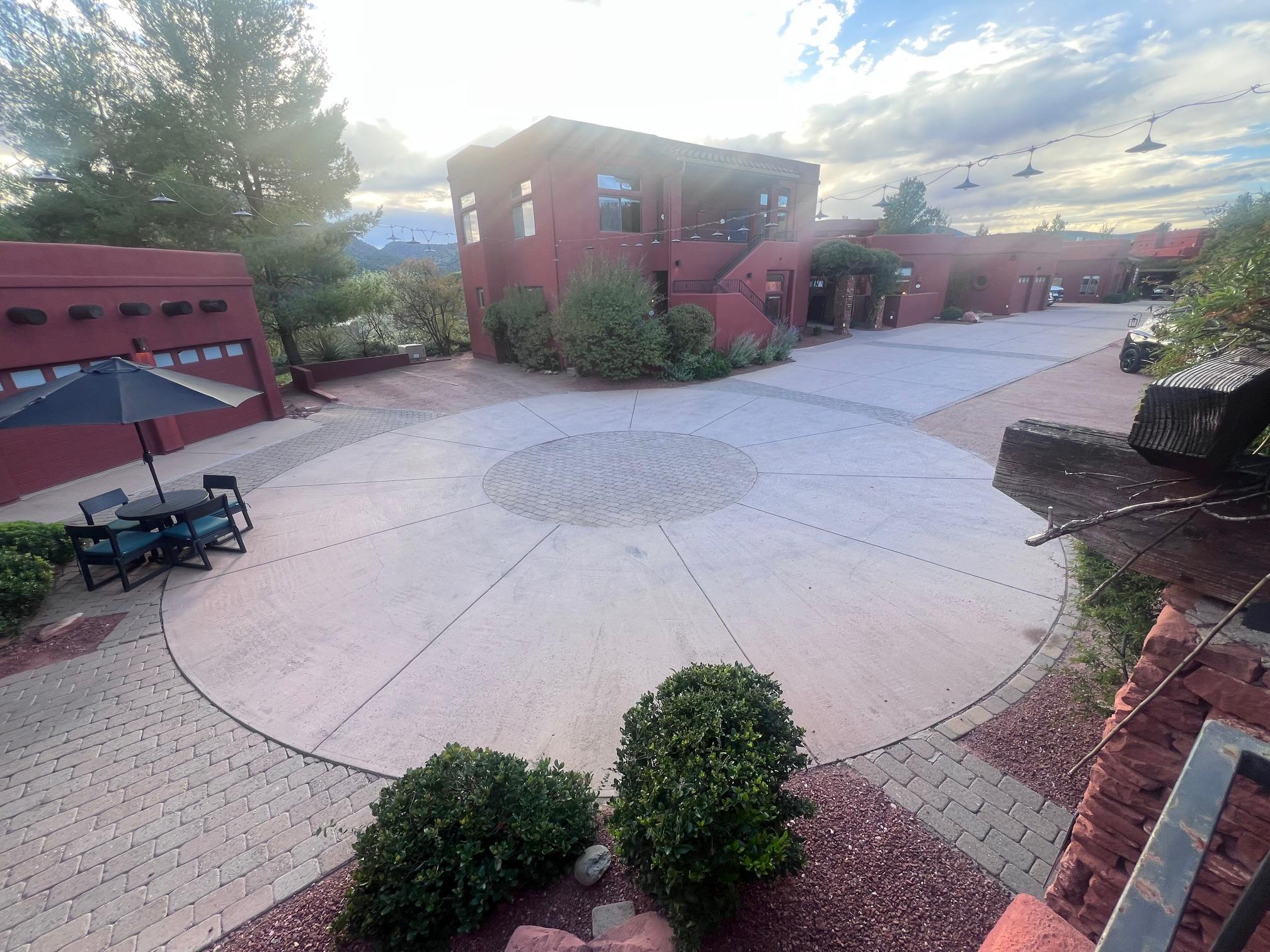 Outdoor circular courtyard amidst the red rocks—perfect for ceremonies, cocktails, or intimate receptions in a serene Sedona estate setting.