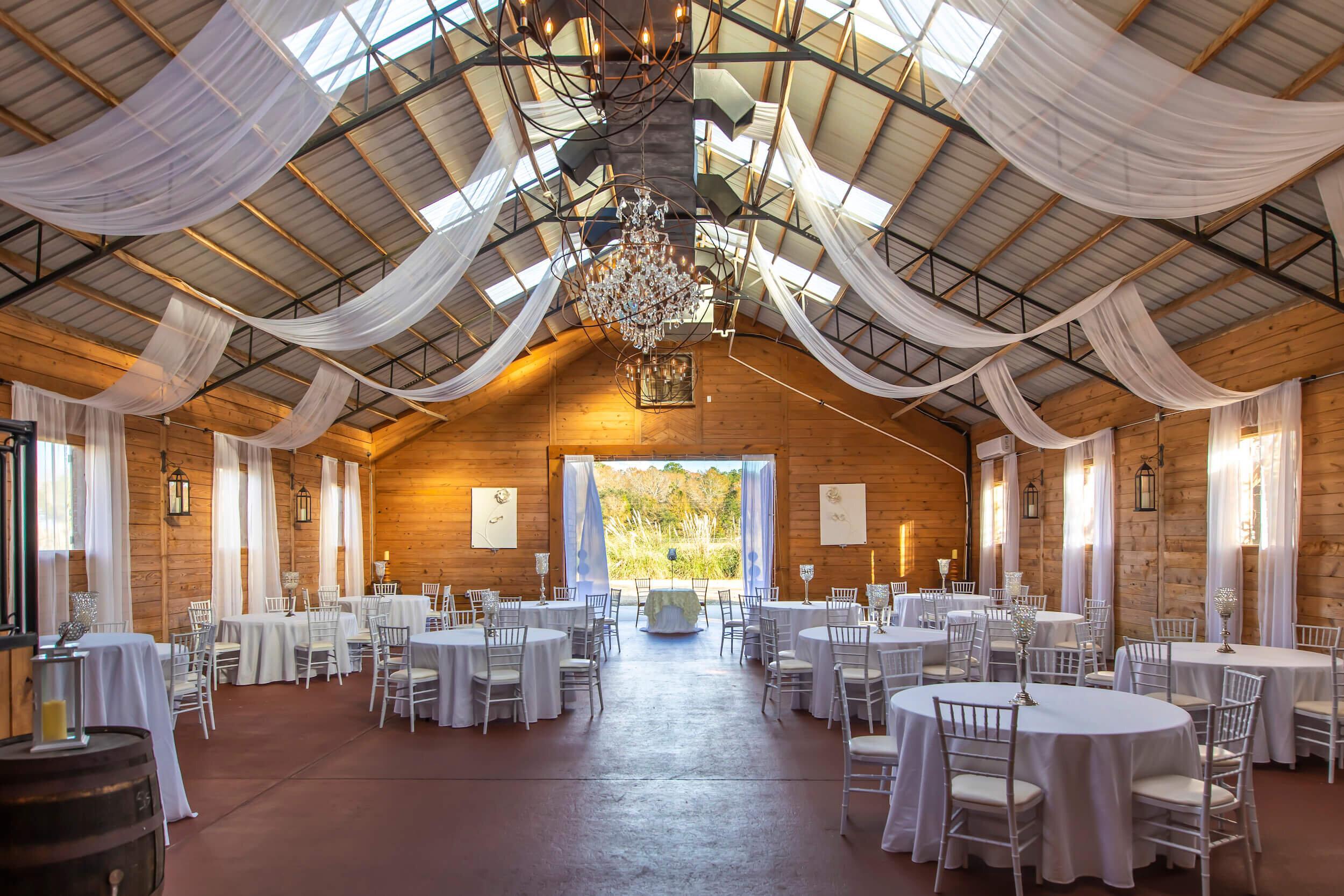 Laurel Hill Farm is North West Florida's premier luxury equestrian wedding venue. We are a family-owned working horse and hay farm passionate about hosting the most beautiful weddings. We offer onsite lodging, catering, and bar service and pride ourselves on creating the most stress-free wedding experience. We only book one wedding per weekend and allow you to begin decorating for your wedding on Thursday, rehearsal dinner on Friday, and minimal cleanup on Sunday. Our Grand Ballroom is heated and airconditioned and is perfect for your dream reception. Inside our ballroom is our Stall bar, where bartenders serve drinks. There is a Bridal Suite above the barn with views of the entire property. Our Groom's room is a converted tack room. Our onsite Saloon is a chic western-themed bar complete with bar stools made out of real horse saddles. The Saloon has a complete bar serving beer, wine, mixed drinks, and signature cocktails. Schedule a tour of our facility today!