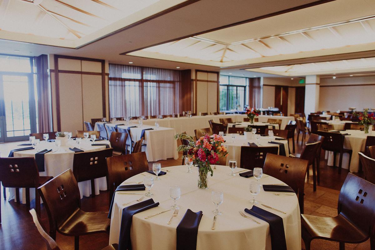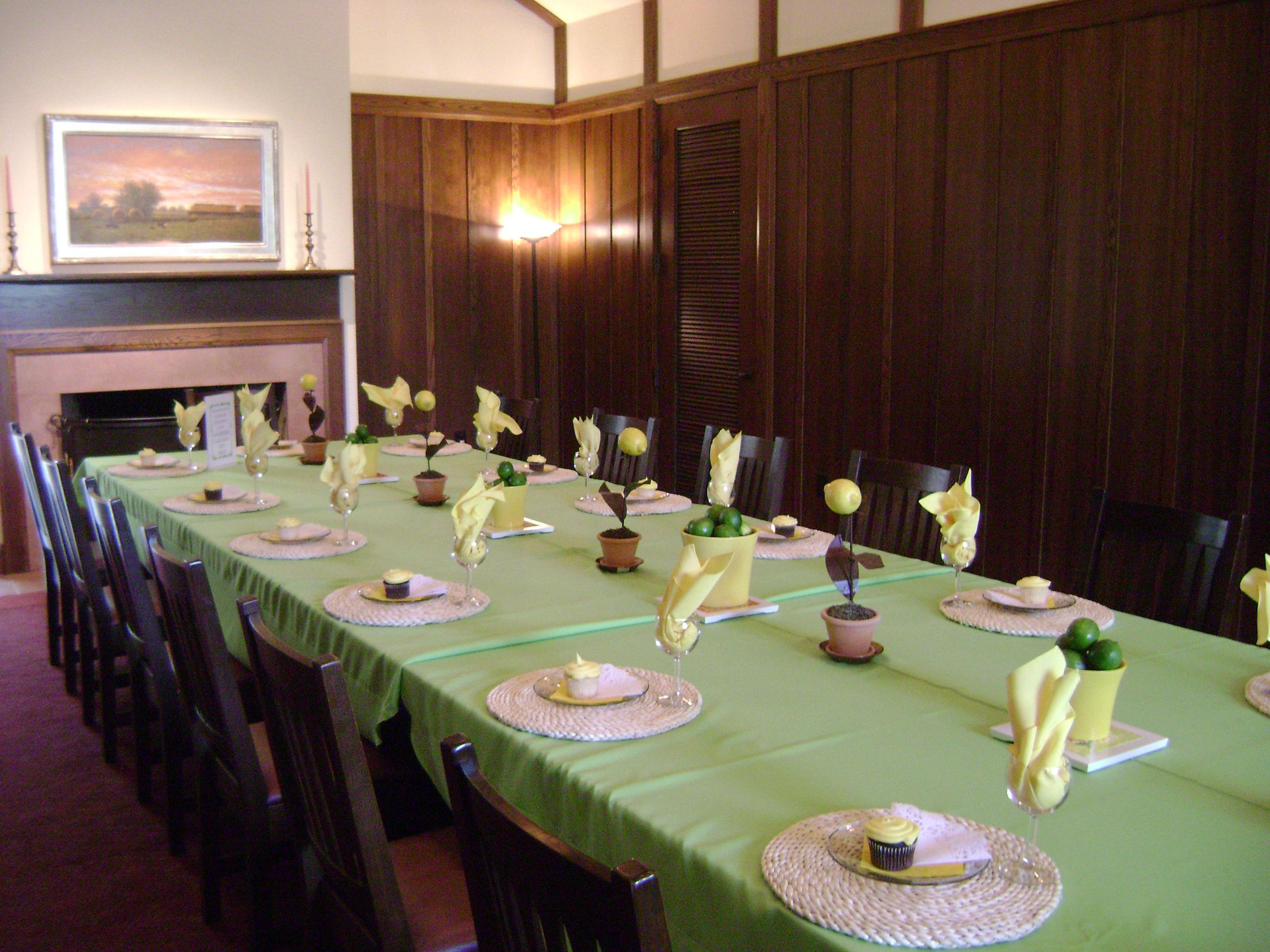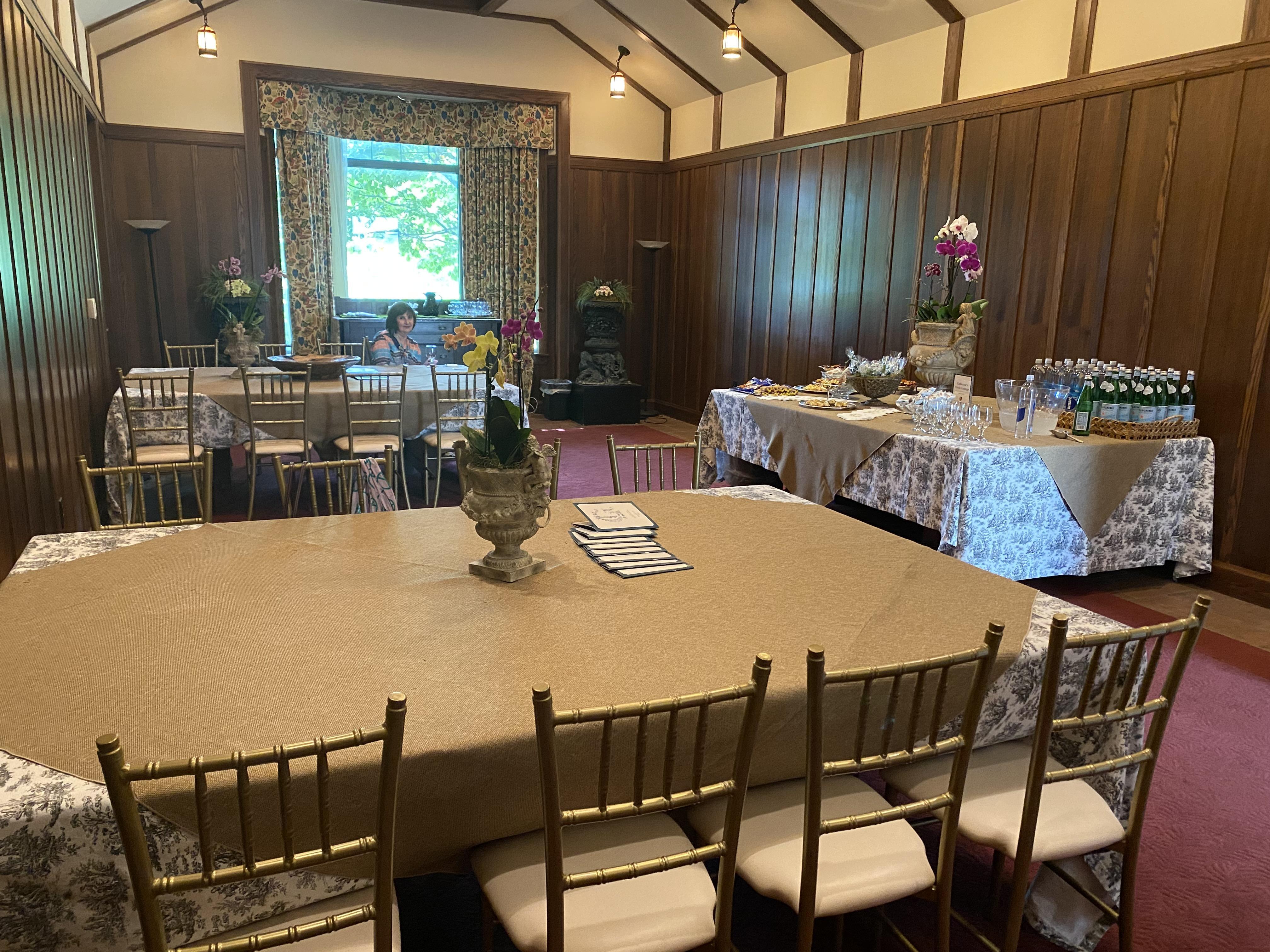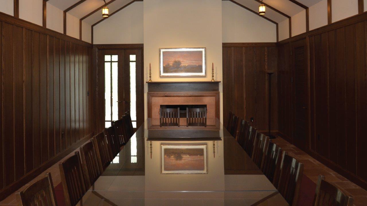 The warm, wood features of the community room create a quaint and comfortable retreat for intimate events. Complete with Stickley furniture and a fireplace, the space is functional for meetings, luncheons, small rehearsal dinners, and showers.