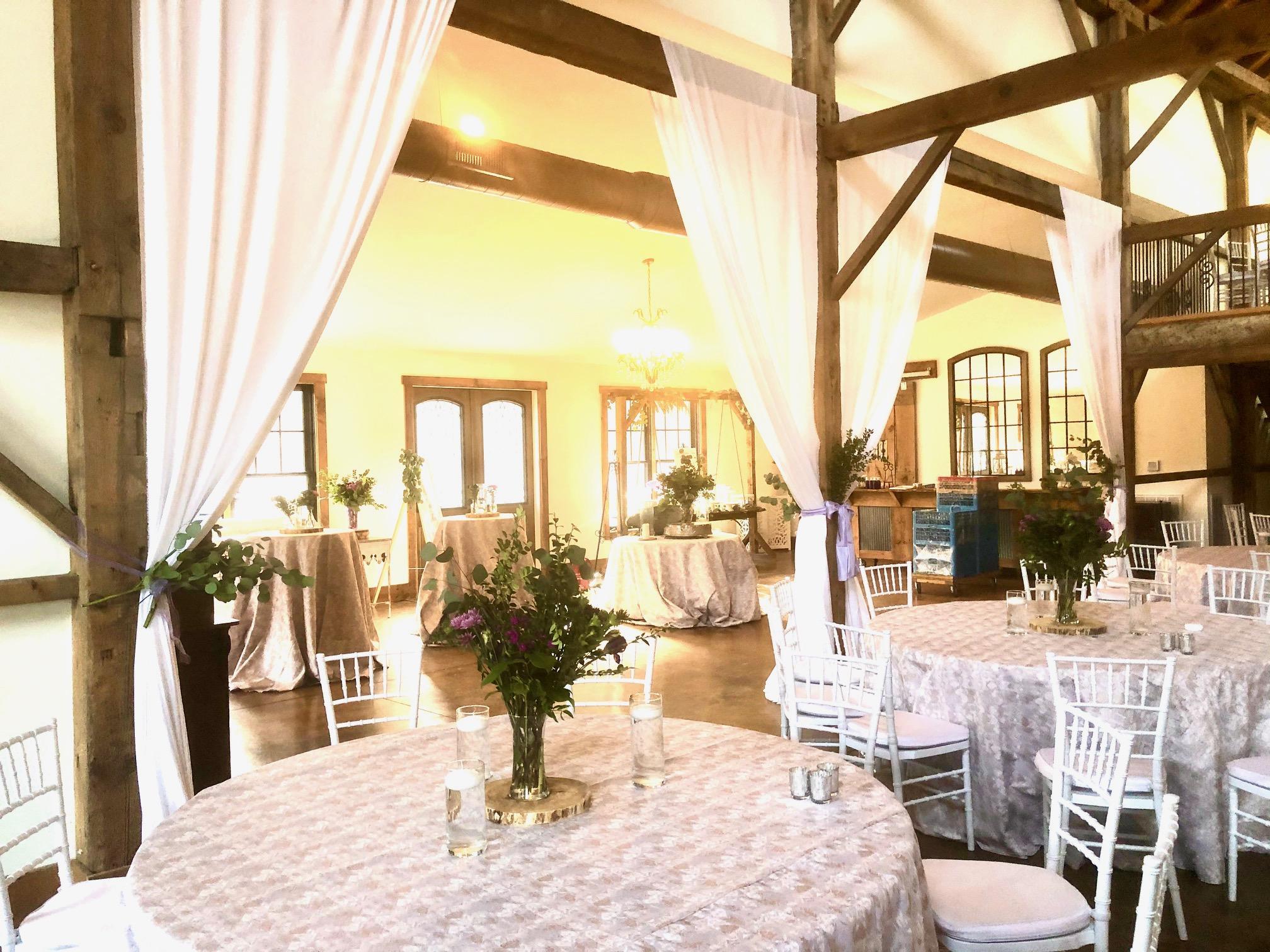 Dimmers for total lighting customization Four crystal and wrought iron chandeliers Two bars Rustic "Floating" table for a dessert bar, seating chart, and more 1,000 sq ft loft for additional guest seating, DJ, bar, photo booth, and more Two large restrooms maintained by the venue throughout your event.