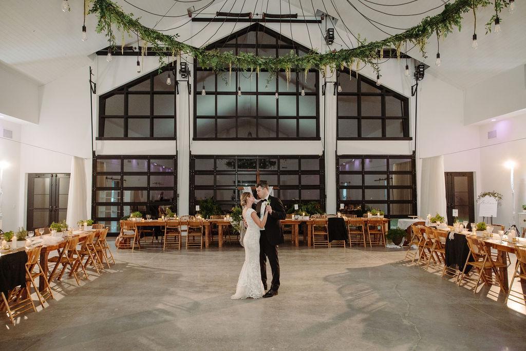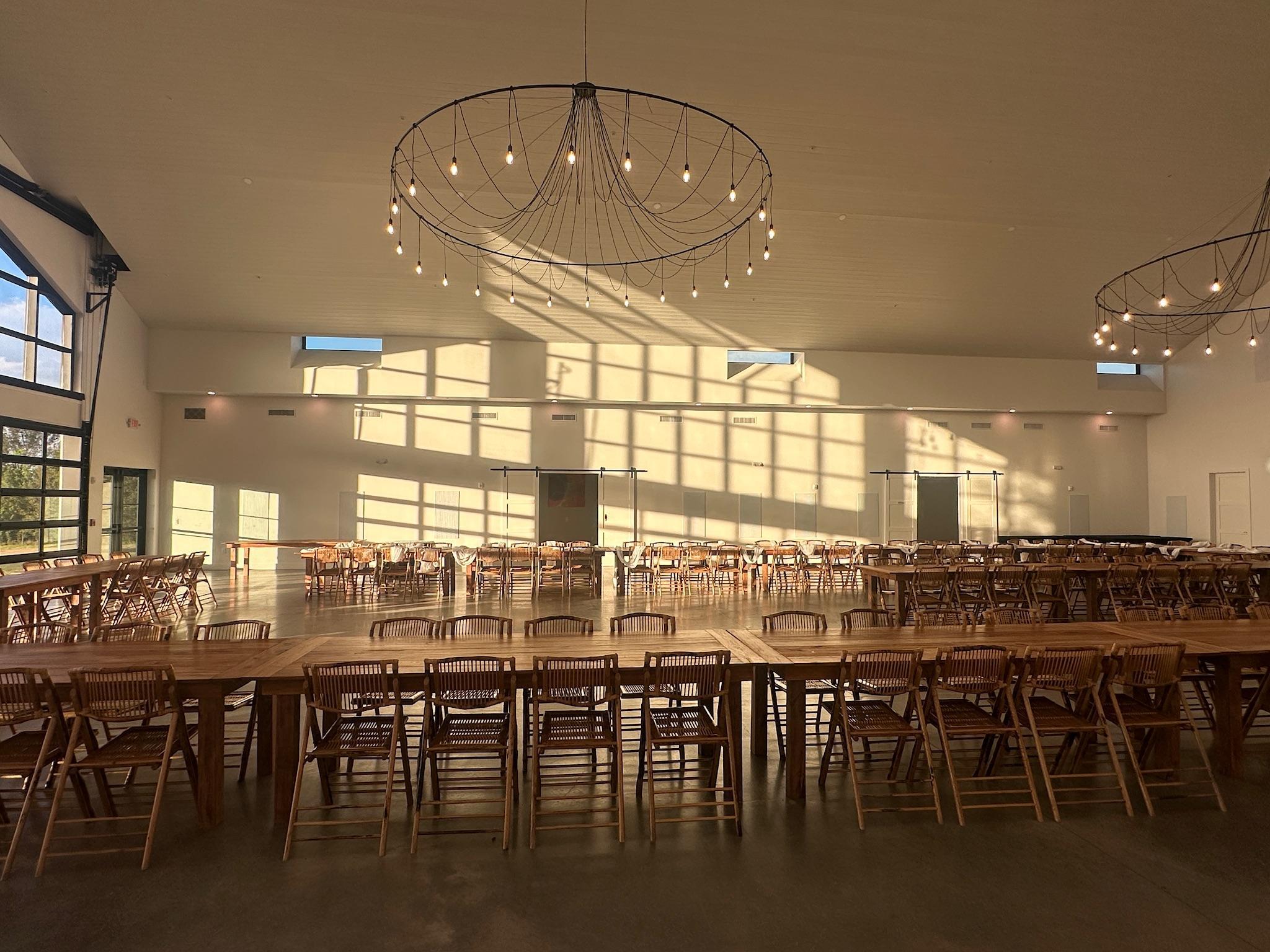 This room features a 30' ceiling with two 15' diameter chandlers that can be raised and lowered for florals. Polished concrete floors and 9' long, teak wood, farmhouse tables are included with your rental.