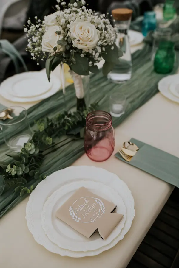 Includes: Dinner place setting (china large plate and Small plate, fork and knife, wine glass and Mason jar water glass), linens and centerpiece for all tables.