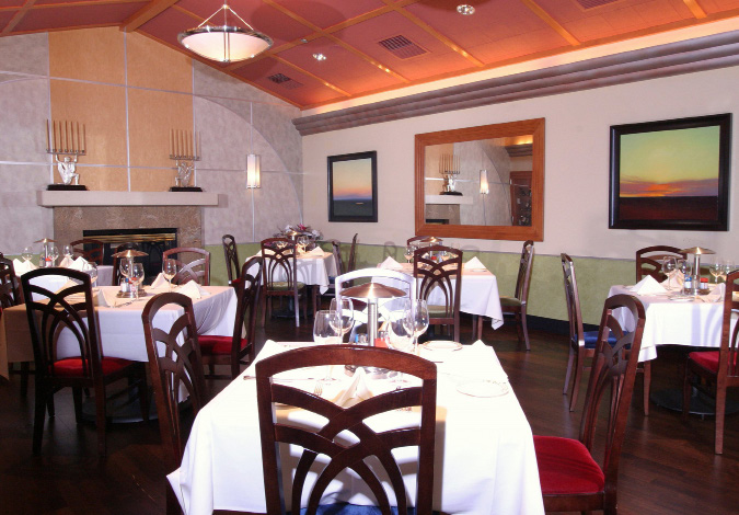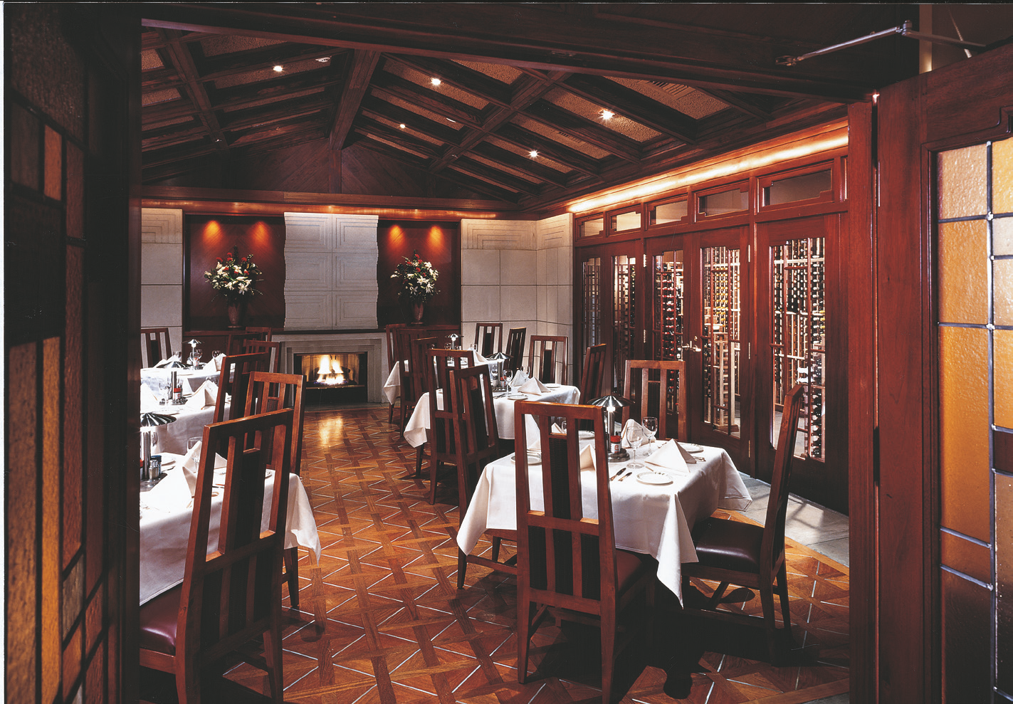 The Art Deco inspired mural and fireplace set the mood for this intimate private room, accented by a view of our wine cellar.