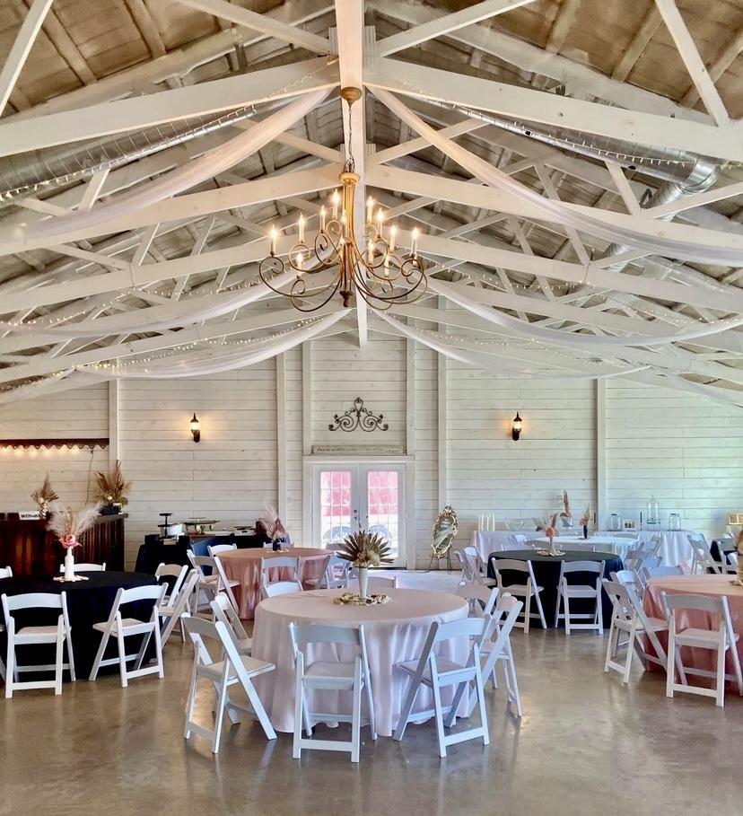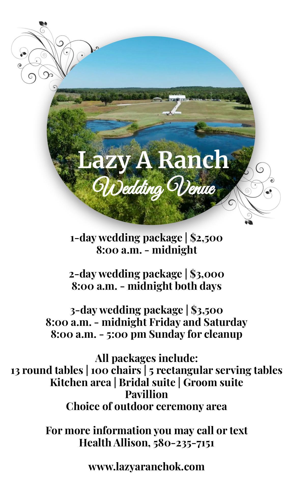Lazy A Ranch is 12 miles east of Ada Ok. Multiple private country scenic ceremony choices on our 10 acres. We have a full kitchen, bridal & groom's suites and a 3,500 reception hall. Package includes 13 guest tables, 5 serving tables and 100 chairs.