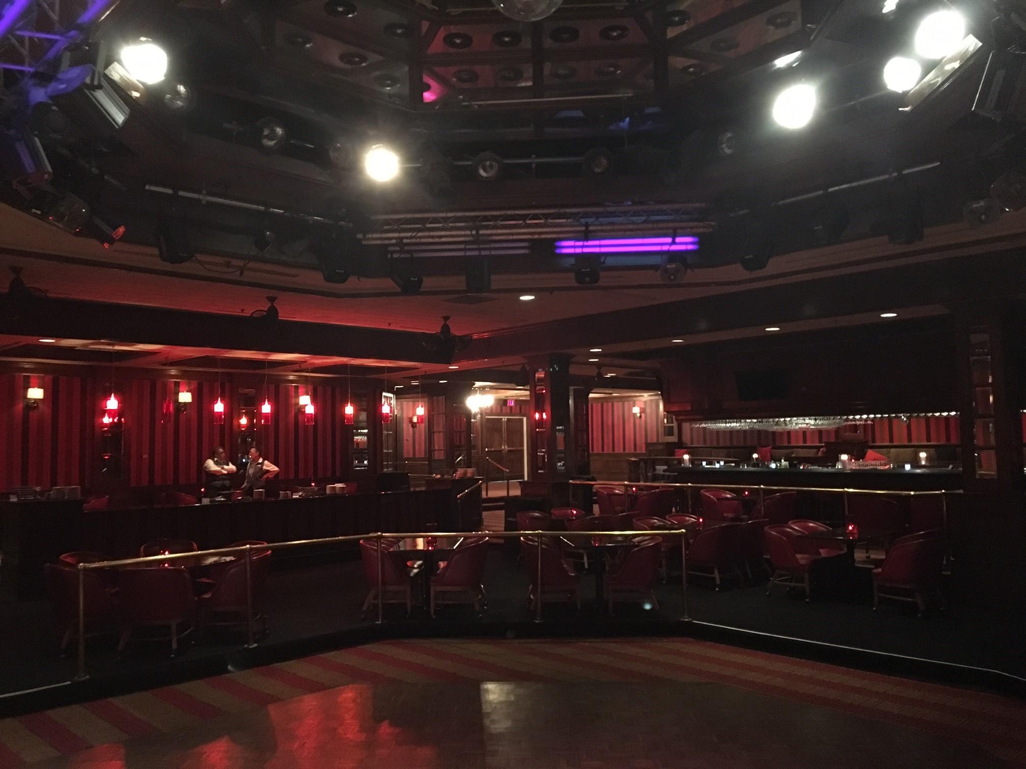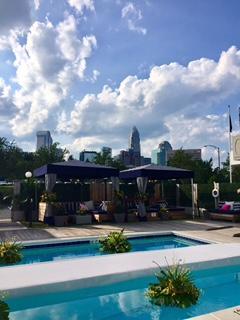 Indoor outdoor venue with pool side cabanas, bar, and view of Charlotte skyline.