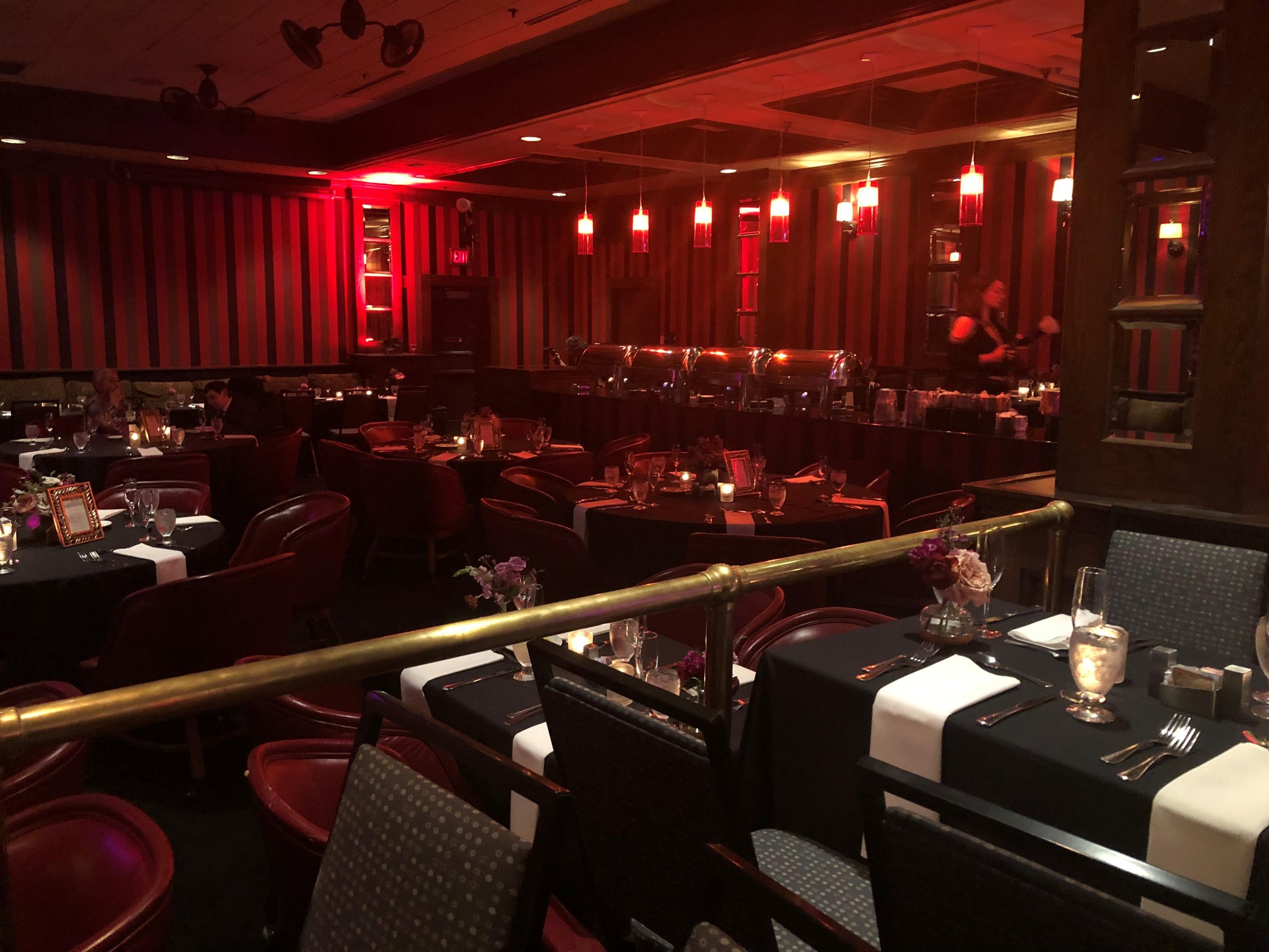 This lovely room features gothic chic chandeliers and low lighted tones.