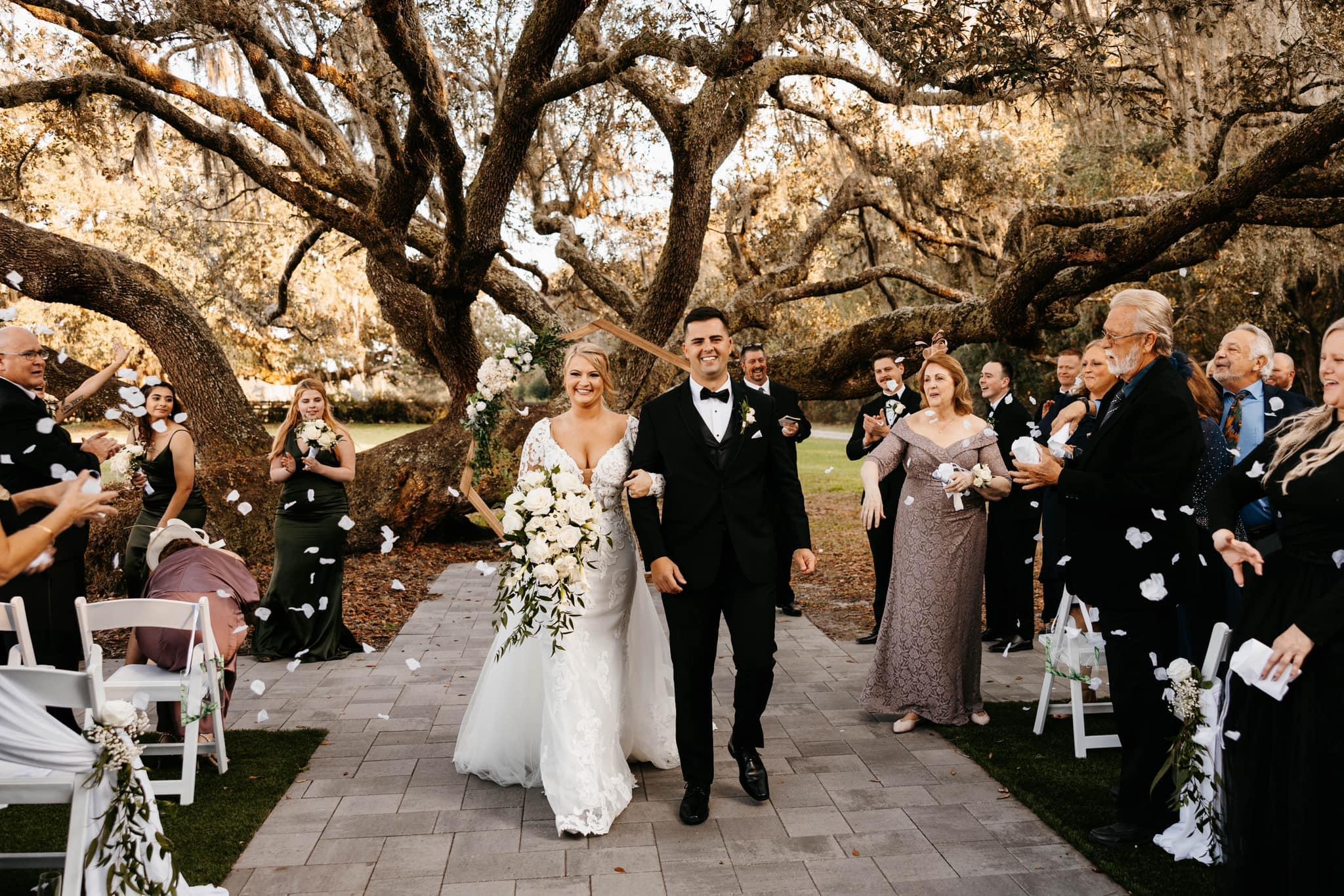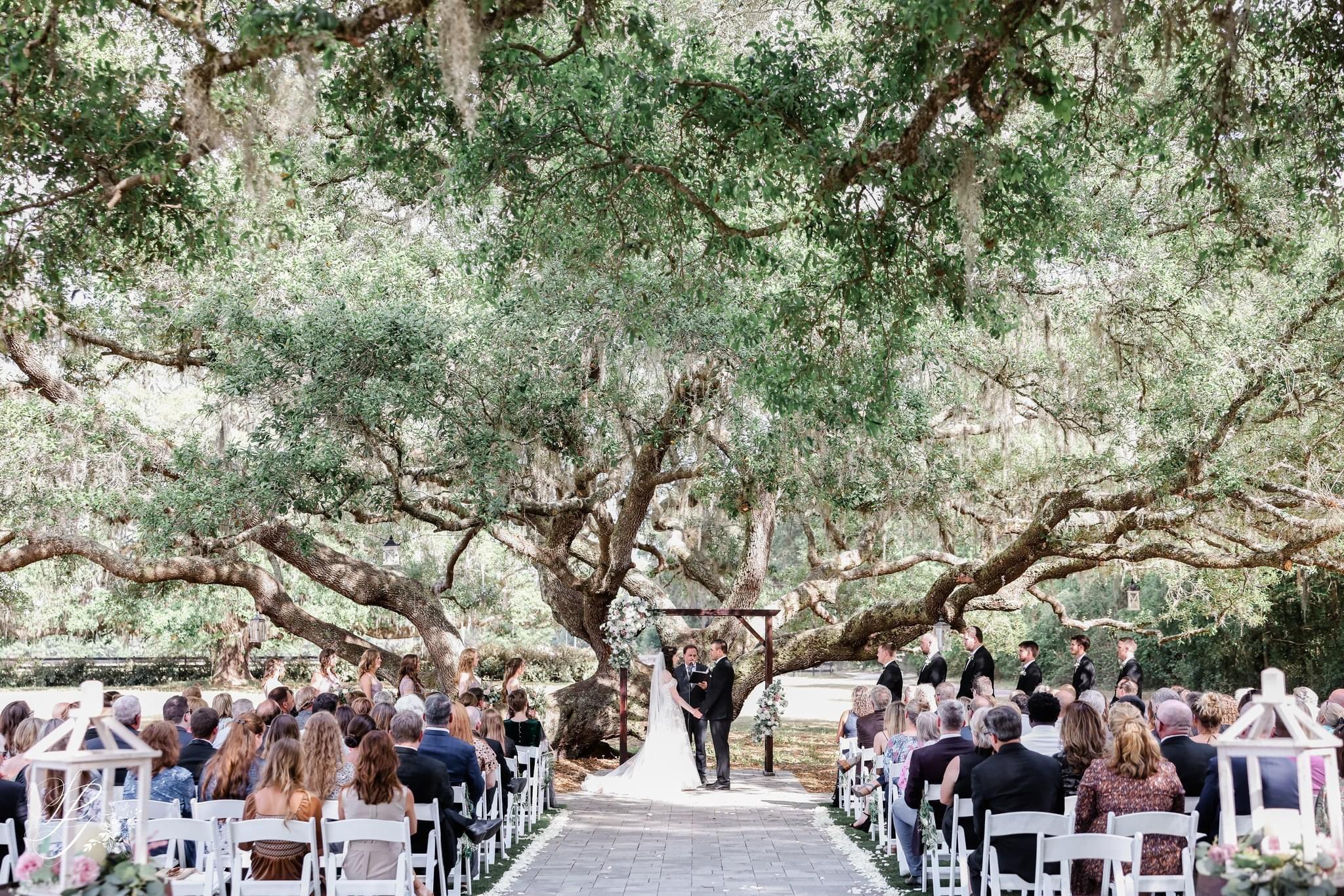 Our unique Ceremony Tree has weathered many storms including Hurricane Francis which knocked it over. Through all this it has continued to grow, symbolizing the strength and bond of marriage, and creating the perfect outdoor ceremony location. The space has a paved aisle and a turf seating area for comfort.